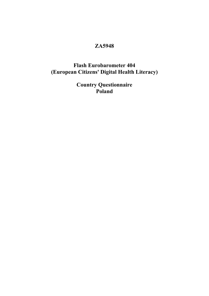 ZA5948 Flash Eurobarometer 404 (European Citizens' Digital Health Literacy) Country Questionnaire Poland FL 404 - e-Health Literacy - PL D1 Ile ma Pan(i) lat? (ZAPISZ – JEŚLI „ODMOWA” KOD „99”) D2 Płeć respondenta mężczyzna kobieta 1 2 Kompetencje w zakresie e-zdrowia DLA WSZYSTKICH DZIAŁ A. Częstotliwość wyszukiwania w Internecie informacji na temat zdrowia. Q1 Przeciętne, jak często w ciągu ostatnich 12 miesięcy korzystał(a) Pan(i) z Internetu do celów prywatnych? (ODCZYTAJ - TYLKO JEDNA ODPOWIEDŹ) Codziennie/prawie codziennie Dwa lub trzy razy w tygodniu Mniej więcej raz w tygodniu Dwa lub trzy razy w miesiącu Rzadziej Nigdy Brak dostępu do Internetu (NIE ODCZYTUJ) Nie wiem/brak odpowiedzi (NIE ODCZYTUJ) 1 2 3 4 5 6 7 8 NEW Q2 Czy w ciągu ostatnich 12 miesięcy korzystał(a) Pan(i) z Internetu w celu wyszukiwania informacji związanych ze zdrowiem? Mogły to być informacje na temat urazu, choroby, schorzenia, odżywiania, dbania o zdrowie itp. (ODCZYTAJ - TYLKO JEDNA ODPOWIEDŹ) Tak, raz w tygodniu lub częściej Tak, kilka razy w miesiącu Tak, mniej więcej raz w miesiącu Tak, mniej więcej raz na dwa miesiące Tak, kilkakrotnie w ciągu minionego roku Nie, nigdy Nie wiem/brak odpowiedzi (NIE ODCZYTUJ) 1 2 3 4 5 6 7 NEW 1 ZADAJ PYTANIA Z DZIAŁU B (PYTANIE Q3), JEŚLI Q2=1 DO 5 (respondent korzystał z Internetu, by wyszukiwać informacje związane ze zdrowiem). JEŚLI Q2=6 PRZEJDŹ DO DZIAŁU F. JEŚLI Q2=7 PRZEJDŹ DO DZIAŁU G. DZIAŁ B. Tematy i zagadnienia Q3: ROTUJ POZYCJE 1 DO 4 Q3 Jakiego rodzaju informacji związanych ze zdrowiem szukał(a) Pan(i) w Internecie w ciągu ostatnich 12 miesięcy ? Szukał(a) Pan(i) w Internecie… (ODCZYTAJ - MAKS. DWIE ODPOWIEDZI) Ogólnych informacji na temat zdrowia i tego, jak można o nie dbać (na przykład: informacji na temat odżywiania, diet, sportu i ćwiczeń, ciąży itp.). 1, Informacji na temat konkretnego urazu, danej choroby, schorzenia lub dolegliwości (na przykład: gdy miewa Pan(i) problemy żołądkowe, gdy Pana(i) dziecko złamało rękę, gdy u Pana(i) współmałżonka(i) zdiagnozowano raka itp.). Informacji, aby zasięgnąć innej opinii po wizycie u swojego lekarza Szczegółowych informacji o leczeniu lub procedurze medycznej (na przykład: jak zażywać lekarstwa, czego się spodziewać po wszczepieniu bypassów itp.) Inne (NIE ODCZYTUJ) Nie wiem/brak odpowiedzi (NIE ODCZYTUJ) 2, 3, 4, 5, 6, NEW ROTUJ DZIAŁY C1 DO C4 – KAŻDEMU RESPONDENTOWI MOŻNA ZADAĆ PYTANIA Z MAKS. 2 DZIAŁÓW ZADAJ PYTANIA Z DZIAŁU C1 (PYTANIA Q4 DO Q7), JEŚLI Q3=1 (respondenci szukali w Internecie ogólnych informacji na tematy związane ze zdrowiem lub z dbaniem o zdrowie) DZIAŁ C1. Osobiste doświadczenia w wykorzystywaniu Internetu do pozyskiwania ogólnych informacji Q4: ROTUJ POZYCJE 1 DO 8 ANKIETER – ODCZYTAJ: Porozmawiajmy o tym, jak Pan(i) korzysta z Internetu do pozyskiwania ogólnych informacji na temat zdrowia lub poprawy stanu zdrowia (na przykład: informacji na temat odżywiania, diet, sportu i ćwiczeń, ciąży itp.). Q4 Konkretniej, gdy próbuje Pan(i) pozyskać ogólne informacje na temat zdrowia lub dbania o zdrowie, których z następujących informacji Pan(i) szuka? (ODCZYTAJ - MOŻLIWE KILKA ODPOWIEDZI) Informacji na temat zdrowia psychicznego, depresji, stresu Informacji na temat wyboru stylu życia (dieta, odżywianie, aktywność fizyczna, palenie, alkohol itp.) Informacji na temat ciąży, porodu i wieku niemowlęcego 1, 2, 3, 2 Informacji na temat farmaceutyków Informacji na temat opieki nad osobą starszą Opinii lub doświadczeń innych pacjentów Informacji na temat personelu medycznego lub placówek służby zdrowia Informacji o szczepionkach Inne (NIE ODCZYTUJ) Nie wiem/brak odpowiedzi (NIE ODCZYTUJ) 4, 5, 6, 7, 8, 9, 10, NEW Q5 Przeciętnie, jak często w ciągu ostatnich 12 miesięcy korzystał(a) Pan(i) z Internetu do pozyskiwania ogólnych informacji na temat zdrowia lub dbania o zdrowie? (ODCZYTAJ - TYLKO JEDNA ODPOWIEDŹ) Raz w tygodniu lub częściej Kilka razy w miesiącu Mniej więcej raz w miesiącu Mniej więcej raz na dwa miesiące Kilka razy w ciągu minionego roku Nie wiem/brak odpowiedzi (NIE ODCZYTUJ) 1 2 3 4 5 6 NEW Q6: ROTUJ STWIERDZENIA OD 1 DO 7 Q6 Z jakich źródeł Pan(i) korzystał(a), gdy próbował(a) Pan(i) pozyskać ogólne informacje na temat zdrowia lub dbania o zdrowie? (ODCZYTAJ - MOŻLIWE KILKA ODPOWIEDZI) Z wyszukiwarek internetowych Z gazet lub czasopism internetowych Ze specjalistycznych i tematycznych stron internetowych, blogów i forów Z internetowych portali społecznościowych Ze stron internetowych organizacji pacjentów Ze specjalistycznych i tematycznych aplikacji na urządzenia mobilne, takie jak tablety lub telefony komórkowe Ze stron internetowych oficjalnych organizacji służby zdrowia, takich jak Ministerstwo Zdrowia, Światowa Organizacja Zdrowia, Europejskie Centrum ds. Zapobiegania i Kontroli Chorób (ECDC) itp. Inne (NIE ODCZYTUJ) Nie wiem/brak odpowiedzi (NIE ODCZYTUJ) 1, 2, 3, 4, 5, 6, 7, 8, 9, NEW Q7 Gdy próbował(a) Pan(i) znaleźć informacje na temat zdrowia lub dbania o zdrowie, dla kogo poszukiwał(a) Pan(i) tych wiadomości? (ODCZYTAJ - MOŻLIWE KILKA ODPOWIEDZI) 3 Dla siebie Dla współmałżonka(i) lub partnera(ki) Dla dziecka lub dzieci Dla innych członków rodziny Dla znajomych i kolegów Inne (NIE ODCZYTUJ) Nie wiem/brak odpowiedzi (NIE ODCZYTUJ) 1, 2, 3, 4, 5, 6, 7, NEW ZADAJ PYTANIA Z DZIAŁU C2 (PYTANIA Q8 DO Q11), JEŚLI Q3=2 (respondenci szukali w Internecie informacji na temat konkretnego urazu, danej choroby lub dolegliwości) DZIAŁ C2. Osobiste doświadczenia w wykorzystywaniu Internetu do wyszukiwania informacji na temat zdrowia dotyczących konkretnego urazu, danej choroby, schorzenia lub dolegliwości Q8: ROTUJ POZYCJE 1 DO 7 ANKIETER – ODCZYTAJ: Porozmawiajmy o tym, w jaki sposób wykorzystuje Pan(i) Internet do wyszukiwania informacji na temat konkretnego urazu, choroby, schorzenia lu