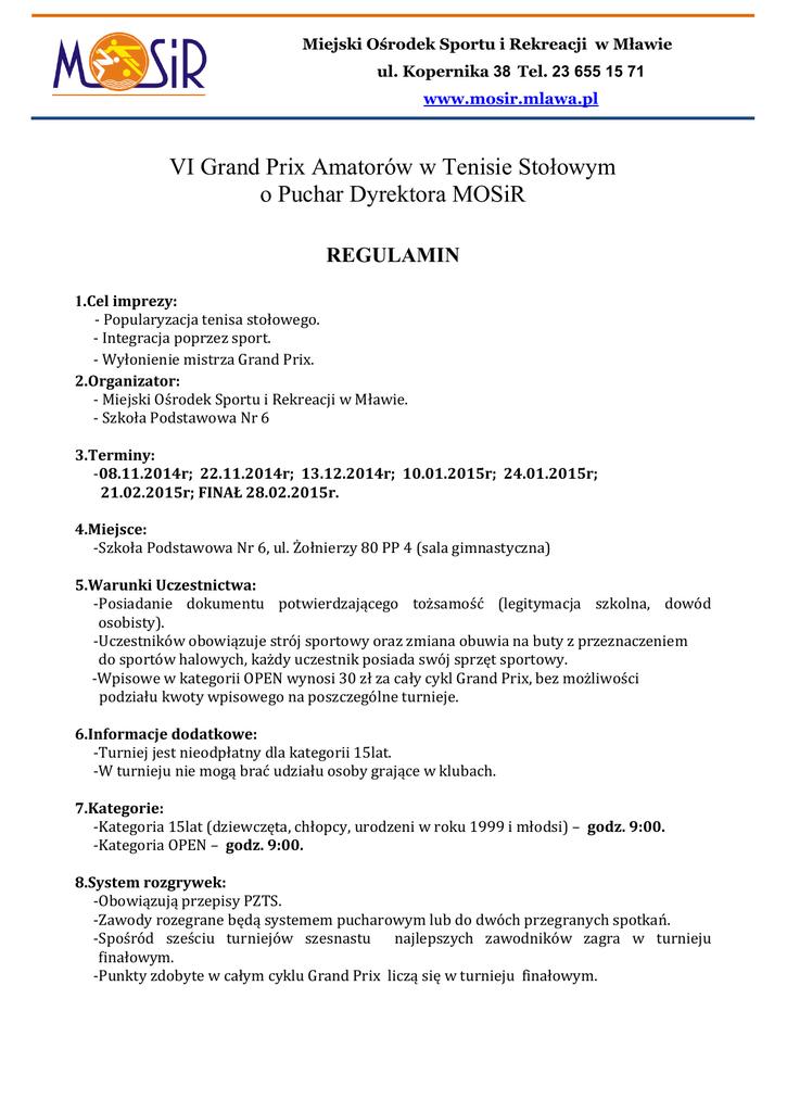 Miejski Ośrodek Sportu i Rekreacji w Mławie ul. Kopernika 38 Tel. 23 655 15 71 www.mosir.mlawa.pl VI Grand Prix Amatorów w Tenisie Stołowym o Puchar Dyrektora MOSiR REGULAMIN 1.Cel imprezy: - Popularyzacja tenisa stołowego. - Integracja poprzez sport. - Wyłonienie mistrza Grand Prix. 2.Organizator: - Miejski Ośrodek Sportu i Rekreacji w Mławie. - Szkoła Podstawowa Nr 6 3.Terminy: -08.11.2014r; 22.11.2014r; 13.12.2014r; 10.01.2015r; 24.01.2015r; 21.02.2015r; FINAŁ 28.02.2015r. 4.Miejsce: -Szkoła Podstawowa Nr 6, ul. Żołnierzy 80 PP 4 (sala gimnastyczna) 5.Warunki Uczestnictwa: -Posiadanie dokumentu potwierdzającego tożsamość (legitymacja szkolna, dowód osobisty). -Uczestników obowiązuje strój sportowy oraz zmiana obuwia na buty z przeznaczeniem do sportów halowych, każdy uczestnik posiada swój sprzęt sportowy. -Wpisowe w kategorii OPEN wynosi 30 zł za cały cykl Grand Prix, bez możliwości podziału kwoty wpisowego na poszczególne turnieje. 6.Informacje dodatkowe: -Turniej jest nieodpłatny dla kategorii 15lat. -W turnieju nie mogą brać udziału osoby grające w klubach. 7.Kategorie: -Kategoria 15lat (dziewczęta, chłopcy, urodzeni w roku 1999 i młodsi) – godz. 9:00. -Kategoria OPEN – godz. 9:00. 8.System rozgrywek: -Obowiązują przepisy PZTS. -Zawody rozegrane będą systemem pucharowym lub do dwóch przegranych spotkań. -Spośród sześciu turniejów szesnastu najlepszych zawodników zagra w turnieju finałowym. -Punkty zdobyte w całym cyklu Grand Prix liczą się w turnieju finałowym. Punktacja za każdy turniej: I 100 pkt. II 80 pkt. III 70 pkt. IV 60 pkt. V-VIII 55;50;45;40 pkt. IX- XVI 30 pkt. Za udział 10 pkt. 9.Nagrody: - W każdej kategorii wiekowej po zakończeniu turnieju finałowego przewidziane są: - Puchary dla pierwszych czterech miejsc, pamiątkowe dyplomy dla wszystkich uczestników turnieju finałowego. 10.Postanowienia końcowe: - Wszyscy uczestnicy zawodów wyrażają zgodę na publikację ich wizerunku oraz ich imienia i nazwiska w relacjach z imprezy zamieszczonych w mediach oraz materiałach promocyjnych organizatora oraz na przetwarzanie ich danych osobowych na potrzeby organizowanych przez organizatora imprez zgodnie z przepisami ustawy z dnia 29.08.1997 o ochronie danych osobowych (Dz. U. 133/97, poz.883). Zgadzają się również na otrzymywanie korespondencji drogą elektroniczną i udostępniają w tym celu swój adres e-mail zgodnie z ustawą z dnia 18.07.2002 r. o świadczenie usług drogą elektroniczną (Dz.U.144/02, poz. 1204). -W sprawach nie ujętych w regulaminie decyduje organizator. SĘDZIA GŁÓWNY ORGANIZATOR Miejski Ośrodek Sportu i Rekreacji w Mławie
