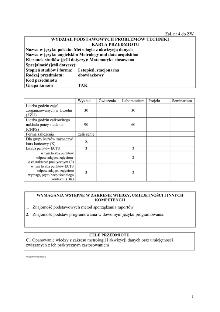 Zał. nr 4 do ZW WYDZIAŁ PODSTAWOWYCH PROBLEMÓW TECHNIKI KARTA PRZEDMIOTU Nazwa w języku polskim Metrologia z akwizycją danych Nazwa w języku angielskim Metrology and data acquisition Kierunek studiów (jeśli dotyczy): Matematyka stosowana Specjalność (jeśli dotyczy): Stopień studiów i forma: I stopień, stacjonarna Rodzaj przedmiotu: obowiązkowy Kod przedmiotu Grupa kursów TAK Wykład Liczba godzin zajęć zorganizowanych w Uczelni (ZZU) Liczba godzin całkowitego nakładu pracy studenta (CNPS) Forma zaliczenia Dla grupy kursów zaznaczyć kurs końcowy (X) Liczba punktów ECTS w tym liczba punktów odpowiadająca zajęciom o charakterze praktycznym (P) w tym liczba punktów ECTS odpowiadająca zajęciom wymagającym bezpośredniego kontaktu (BK) Ćwiczenia Laboratorium Projekt 30 30 90 60 Seminarium zaliczenie X 3 2 2 3 2 WYMAGANIA WSTĘPNE W ZAKRESIE WIEDZY, UMIEJĘTNOŚCI I INNYCH KOMPETENCJI 1. Znajomość podstawowych metod sporządzania raportów 2. Znajomość podstaw programowania w dowolnym języku programowania. CELE PRZEDMIOTU C1 Opanowanie wiedzy z zakresu metrologii i akwizycji danych oraz umiejętności związanych z ich praktycznym zastosowaniem *niepotrzebne skreślić 1 EFEKTY KSZTAŁCENIA DLA PRZEDMIOTU Z zakresu wiedzy: PEK_W1 Zna podstawowe pojęcia metrologiczne i konfiguracje systemów pomiarowych PEK_W2 Zna podstawowe metody akwizycji danych Z zakresu umiejętności: PEK_U1 Potrafi wykorzystywać metody akwizycji do zbierania i analizy danych rzeczywistych Z zakresu kompetencji społecznych: PEK_K1 Jest przygotowany do zdobywania nowych kompetencji i współpracy z przedstawicielami innych zawodów TREŚCI PROGRAMOWE Wy1 Wy2 Wy3 Wy4 Wy5 Wy6 Wy7 Wy8 Wy9 Wy10 Wy11 Wy12 Wy13 Wy14 Wy15 Forma zajęć - wykłady Dane oraz ich znaczenie w eksperymencie i przemyśle Jednostki i systemy miar w historii i współcześnie Rodzaje źródeł danych oraz techniki próbkowania Systemy, przyrządy oraz wzorce pomiarowe Podstawowe rodzaje czujników Cyfrowe przyrządy pomiarowe oraz przekazywanie sygnałów Analiza on-line oraz off-line Współczesne magazyny i bazy danych Atrybuty metod pomiarowych Źródła błędów w różnych sposobach akwizycji danych Błędy i niepewności pomiarowe Błąd dyskretyzacji Metody raportowania oraz prezentacji informacji Zastosowanie transformaty Fouriera do badania częstotliwości Podstawowe metody statystyczne analizy danych Suma godzin La1 Forma zajęć - ćwiczenia Prąd stały, prąd zmienny i bezpieczeństwo pracy w laboratorium La2 La3 La4 La5 La6 La7 La8 La9 La10 La11 La12 Natężenie i napięcie prądu, prawo Ohma, prawa Kirchhoffa Schematy blokowe, obwody RLC Półprzewodniki, dioda, tranzystor, podstawowe układy scalone Symulacje obwodów, używanie miernika i oscyloskopu Mikro-kontrolery (MK), budowa obwodów Programowanie MK cz. 1, podstawowe instrukcje sterujące Programowanie MK cz. 2, funkcje biblioteki standardowej Komunikacja MK z komputerem Przedstawienie oraz przydzielenie projektów studenckich Programowanie MK z komputera Przykład 1: pomiar temperatury i sygnalizacja poziomu krytycznego Liczba godzin 2 2 2 2 2 2 2 2 2 2 2 2 2 2 2 30 Liczba godzin 2 2 2 2 2 2 2 2 2 2 2 2 2 La13 La14 La15 Przykład 2: wizualizacja porównania fotorezystora ze wzorcem Przykład 3: pomiar pulsu człowieka Prezentacja projektów studenckich Suma godzin 2 2 2 30 STOSOWANE NARZĘDZIA DYDAKTYCZNE 1. Wykład problemowo-informacyjny– metoda tradycyjna, prezentacja multimedialna 2. Laboratorium, rozwiązywanie problemów z metrologii i akwizycji danych przy wykorzystaniu wizualizacji i symulacji układów, nowoczesnego mikro-kontrolera oraz programowania w dostosowanym języku programowania OCENA OSIĄGNIĘCIA PRZEDMIOTOWYCH EFEKTÓW KSZTAŁCENIA Oceny (F – formująca (w trakcie semestru), P – podsumowująca (na koniec semestru) F1 F2 Numer efektu kształcenia Sposób oceny osiągnięcia efektu kształcenia PEK_W1 PEK_W2 PEK_K1 PEK_U1 PEK_K1 Zaliczenie wykładu- kolokwia Odpowiedzi ustne, projekt, sprawozdania P=0.5*F1+0.5*F2 LITERATURA PODSTAWOWA I UZUPEŁNIAJĄCA [1] W. Nawrocki. „Komputerowe Systemy Pomiarowe”. [2] T. P. Zieliński. „Cyfrowe przetwarzanie sygnałów. Od teorii do zastosowań”. [3] F. M. Mims III. „Getting Started in Electronics”. [4] Instrukcja obsługi oraz wybrany podręcznik do używanego mikro-kontrolera. OPIEKUN PRZEDMIOTU (IMIĘ, NAZWISKO, ADRES E-MAIL) Marcin Magdziarz ([email protected]) 3 MACIERZ POWIĄZANIA EFEKTÓW KSZTAŁCENIA DLA PRZEDMIOTU Metrologia z akwizycją danych Z EFEKTAMI KSZTAŁCENIA NA KIERUNKU MATEMATYKA STOSOWANA Przedmiotowy efekt kształcenia PEK_W1 PEK_W2 PEK_U1 PEK_K1 Odniesienie przedmiotowego efektu do efektów kształcenia zdefiniowanych dla kierunku studiów i specjalności (o ile dotyczy) K1MAS_W03 K1MAS_W04 K1MAS_U09 K1MAS_K03 ** - z tabeli powyżej Cele przedmiotu** Treści programowe** Numer narzędzia dydaktycznego** C1 C1 C1 C1 Wy1-Wy15 Wy1-Wy15 La1-La15 Wy1-Wy15, La1-La15 1 1 2 1,2