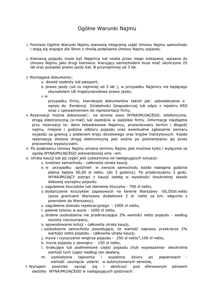 Ogólne Warunki Najmu 1. Poniższe Ogólne Warunki Najmu stanowią integralną część Umowy Najmu samochodu i stają się wiążące dla Stron z chwilą podpisania Umowy Najmu pojazdu. 2. Kierowcą pojazdu może być Najemca lub osoba przez niego wskazana, wpisana do Umowy Najmu jako drugi kierowca. Kierujący samochodem musi mieć ukończone 25 lat oraz posiadać prawo jazdy kat. B przynajmniej od 3 lat. 3. Wymagane dokumenty: a. dowód osobisty lub paszport; b. prawo jazdy (od co najmniej od 3 lat ), w przypadku Najemcy nie będącego obywatelem UE międzynarodowe prawo jazdy; c. w przypadku firmy, kserokopie dokumentów takich jak: zaświadczenie o wpisie do Ewidencji Działalności Gospodarczej lub odpis z rejestru KRS wraz z upoważnieniem do reprezentacji firmy. 4. Rezerwacji można dokonywać:: na stronie www WYNAJMUJĄCEGO, telefonicznie, drogą elektroniczną (e-mail) lub osobiście w siedzibie firmy. Informacje niezbędne przy rezerwacji to: dane teleadresowe Najemcy, przewidywany termin i długość najmu, miejsce i godzina odbioru pojazdu oraz ewentualne zgłoszenie zamiaru wyjazdu za granicę z podaniem kraju docelowego oraz krajów tranzytowych. Każda rezerwacja złożona drogą elektroniczną jest ważna po potwierdzeniu jej przez pracownika wypożyczalni. 5. Po podpisaniu Umowy Najmu zmiana terminu Najmu jest możliwa tylko i wyłącznie za zgodą WYNAJMUJĄCEGO potwierdzonej sms –em. 6. Utrata kaucji lub jej części jest uzależniona od następujących sytuacji: a. kradzież samochodu - całkowita utrata kaucji, b. w przypadku opóźnień w zwrocie samochodu każda następna godzina płatna będzie 50,00 zł netto. (do 3 godziny). Po przekroczeniu 3 godz. WYNAJMUJĄCY potrąci z kaucji opłatę w wysokości dwukrotnej stawki dobowej wynajmu pojazdu. c. zagubienie kluczyków lub złamanie kluczyka - 700 zł netto, d. dostarczenie kluczyków zapasowych na terenie Warszawy -50,OOzł.netto (poza granicami Warszawy dodatkowo 2 zł. netto za km. włącznie z powrotem do Warszawy), e. zagubienie dowodu rejestracyjnego - 1000 zł netto, f. palenie tytoniu w aucie - 1000 zł netto, g. drobne uszkodzenia nie przekraczające 2% wartości netto pojazdu - według wyceny rzeczoznawcy, h. spowodowanie kolizji - całkowita utrata kaucji, i. uszkodzenie samochodu powodujące, że wartość naprawy przekracza 2% wartości netto pojazdu - całkowita utrata kaucji, j. mycie i czyszczenie wnętrza pojazdu - 250 zł netto*,100 zł netto, k. mycie pojazdu z zewnątrz - 150 zł netto, l. brakujące lub podmienione części pojazdu i/lub wyposażenia- dwukrotna wartość tych części według cen dealera, m. uszkodzona tapicerka i wypalone dziury po papierosach wartość usunięcia usterki w autoryzowanym serwisie, powinien zacząć się i skończyć pod oferowanym adresem 7. Wynajem siedziby WYNAJMUJĄCEGO w następujących godzinach: 08.00 - 12.00 – zdanie pojazdu, 16.00 - 18.00 – wydanie pojazdu, oraz: przy wynajmie podstawienie pojazdu na terenie Warszawy w godzinach wydania - 25,00 zł netto (w promieniu do 10 km. od naszej bazy), b. przy odbiorze pojazdu na terenie Warszawy w godzinach odbioru - 25,00 zł (w promieniu do 10 km. od naszej bazy), c. podstawienie lub odbiór samochodu (w promieniu powyżej 10 km. od bazy) - 2 zł/km. netto (trasa docelowa + powrotna), d. limit dzienny kilometrów 400 km – powyżej limitu dopłata 0,45 zł netto za 1 km. e. odbiór lub zwrot samochodu w godzinach 18.00-8.00 jest dodatkowo płatne 50,00 zł netto, f. odbiór lub zwrot auta w niedziele i święta – 35,00 zł netto, g. inne: do indywidualnej negocjacji. 8. Każde odstępstwo od uzgodnionego terminu powinno być zaakceptowane przez WYNAJMUJĄCEGO (sms -em). W innym przypadku WYNAJMUJĄCY jest upoważniony do przejęcia samochodu na koszt NAJEMCY i do obciążenia NAJEMCY za dodatkowe używanie samochodu. a. 9. Rozliczenie kaucji następuje po 7 dniach od chwili zdania pojazdu. Należy pamiętać, że ubezpieczenie AC nie pokrywa uszkodzeń dotyczących: koła, zawieszenia, szyb, instalacji radiowej, aktów wandalizmu, etc. 10. NAJEMCA zgadza się na przechowywanie jego danych personalnych w dokumentach WYNAJMUJĄCEGO. W przypadku nie wywiązania się z płatności, jego dane personalne zostaną przesłane do Rejestru Dłużników. 11. Opłata za wynajem samochodu nie obejmuje kosztów paliwa. 12. Wszystkie koszty związane z wynajmem samochodu podlegają podatkowi VAT w wysokości 23%. Zapoznałem/łam się z treścią i otrzymałem/łam Ogólne Warunki Najmu pojazdu. Do treści nie wnoszę zastrzeżeń. Powyższe warunki Najmu akceptuję. ……………………………………………………………………………………………………………………………………………… Data i podpis NAJEMCY Podpisany dokument proszę przesłać na [email protected] lub pocztą na adres siedziby Wynajmującego. *- dotyczy kampera.