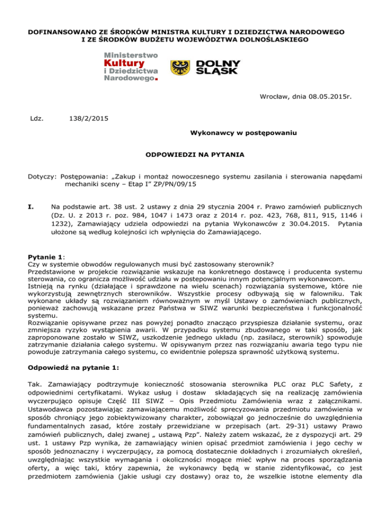 DOFINANSOWANO ZE ŚRODKÓW MINISTRA KULTURY I DZIEDZICTWA NARODOWEGO I ZE ŚRODKÓW BUDŻETU WOJEWÓDZTWA DOLNOŚLASKIEGO Wrocław, dnia 08.05.2015r. Ldz. 138/2/2015 Wykonawcy w postępowaniu ODPOWIEDZI NA PYTANIA Dotyczy: Postępowania: „Zakup i montaż nowoczesnego systemu zasilania i sterowania napędami mechaniki sceny – Etap I” ZP/PN/09/15 I. Na podstawie art. 38 ust. 2 ustawy z dnia 29 stycznia 2004 r. Prawo zamówień publicznych (Dz. U. z 2013 r. poz. 984, 1047 i 1473 oraz z 2014 r. poz. 423, 768, 811, 915, 1146 i 1232), Zamawiający udziela odpowiedzi na pytania Wykonawców z 30.04.2015. Pytania ułożone są według kolejności ich wpłynięcia do Zamawiającego. Pytanie 1: Czy w systemie obwodów regulowanych musi być zastosowany sterownik? Przedstawione w projekcie rozwiązanie wskazuje na konkretnego dostawcę i producenta systemu sterowania, co ogranicza możliwość udziału w postepowaniu innym potencjalnym wykonawcom. Istnieją na rynku (działające i sprawdzone na wielu scenach) rozwiązania systemowe, które nie wykorzystują zewnętrznych sterowników. Wszystkie procesy odbywają się w falowniku. Tak wykonane układy są rozwiązaniem równoważnym w myśl Ustawy o zamówieniach publicznych, ponieważ zachowują wskazane przez Państwa w SIWZ warunki bezpieczeństwa i funkcjonalność systemu. Rozwiązanie opisywane przez nas powyżej ponadto znacząco przyspiesza działanie systemu, oraz zmniejsza ryzyko wystąpienia awarii. W przypadku systemu zbudowanego w taki sposób, jak zaproponowane zostało w SIWZ, uszkodzenie jednego układu (np. zasilacz, sterownik) spowoduje zatrzymanie działania całego systemu. W opisywanym przez nas rozwiązaniu awaria tego typu nie powoduje zatrzymania całego systemu, co ewidentnie polepsza sprawność użytkową systemu. Odpowiedź na pytanie 1: Tak. Zamawiający podtrzymuje konieczność stosowania sterownika PLC oraz PLC Safety, z odpowiednimi certyfikatami. Wykaz usług i dostaw składających się na realizację zamówienia wyczerpująco opisuje Część III SIWZ – Opis Przedmiotu Zamówienia wraz z załącznikami. Ustawodawca pozostawiając zamawiającemu możliwość sprecyzowania przedmiotu zamówienia w sposób chroniący jego zobiektywizowany charakter, zobowiązał go jednocześnie do uwzględnienia fundamentalnych zasad, które zostały przewidziane w przepisach (art. 29-31) ustawy Prawo zamówień publicznych, dalej zwanej „ ustawą Pzp”. Należy zatem wskazać, że z dyspozycji art. 29 ust. 1 ustawy Pzp wynika, że zamawiający winien opisać przedmiot zamówienia i jego cechy w sposób jednoznaczny i wyczerpujący, za pomocą dostatecznie dokładnych i zrozumiałych określeń, uwzględniając wszystkie wymagania i okoliczności mogące mieć wpływ na proces sporządzania oferty, a więc taki, który zapewnia, że wykonawcy będą w stanie zidentyfikować, co jest przedmiotem zamówienia (jakie usługi czy dostawy) oraz to, że wszelkie istotne elementy dla wykonania zamówienia będą w nim uwzględnione. (Patrz: Opinia Urzędu Zamówień Publicznych zamieszczona w Informatorze Urzędu Zamówień Publicznych nr 2/2011). Jednocześnie Zamawiający realizując przywołaną przez Wykonawcę zasadę dopuszczania rozwiązań równoważnych w myśl ustawy Prawo zamówień publicznych, określił zasady równoważności sprzętu które zawarte zostały m.in. w: Części III SIWZ – Opisie Przedmiotu Zamówienia, ogłoszeniu o zamówieniu przesłanym 09.04.2015 do publikacji w Dzienniku Urzędowym Unii Europejskiej. Cytat: „W celu potwierdzenia, że oferowane urządzenia odpowiadają wymaganiom określonym przez Zamawiającego w Opisie Przedmiotu Zamówienia wraz z załącznikami ( art.25 ust.1 pkt.2) Pzp), tzn. spełniają minimalne wymagania określone przez Zamawiającego, zarówno pod względem parametrów technicznych jak i ilościowych (dotyczy to również kompatybilności urządzeń), Zamawiający dopuszcza oferowanie urządzeń równoważnych tj. spełniających jednocześnie wszystkie zapisy specyfikacji uszczegółowione w OPZ i projekcie wykonawczym, zgodnie z Art. 30 ust. 5 Ustawy Prawo Zamówień Publicznych. W związku z powyższym Wykonawca wraz z ofertą zobowiązany jest dostarczyć karty katalogowe oferowanych urządzeń w przypadku gdy oferowane urządzenia będą inne niż przykładowo przyjęte przez projektanta w OPZ i projekcie wykonawczym załącznik Nr 1 do OPZ. ” Tak więc Zamawiający jedynie określa parametry brzegowe urządzeń, dopuszczając oferowanie urządzeń równoważnych tj. spełniających jednocześnie wszystkie zapisy specyfikacji uszczegółowione w OPZ i projekcie wykonawczym, dla realizacji ustawowych zasad uczciwej konkurencji a co za tym idzie zasady równego dostępu do zamówienia, wyrażonych art. 7 ust. 1 ustawy Pzp. Zgodnie z treścią wyroku z dnia 4 grudnia 2009 r. (sygn. akt KIO/UZP 1602/09) Krajowa Izba Odwoławczej, cytat: „(…) Określenie wysokich, ale możliwych do spełnienia wymagań przedmiotu zamówienia, które pozostają w związku z samym zamówieniem i celem, jaki poprzez dane zamówienie zamierza osiągnąć zamawiający, nie niweczy realizacji zasady uczciwej konkurencji(…)”. Wykonawca może zaproponować sterownik o równoważnych parametrach, nie gorszych niż urządzenia przykładowo przyjęte przez projektanta w OPZ i projekcie wykonawczym załącznik Nr 1 do OPZ. Na wykonawcy oferującym produkty równoważne spoczywa zatem obowiązek wykazania równoważności treści składanej oferty. Pytanie 2: Czy zamawiający dopuszcza możliwość drobnych korekt w projekcie wpływających na zwiększenie funkcjonalności oraz polepszenie działania systemu? Ewentualne zmiany w stosunku do projektu wymienionego w SIWZ, nie dotyczyłyby jakości zastosowanych komponentów, a jedynie ich konfiguracji. Pozytywna odpowiedź Zamawiającego na niniejsze pytanie pozwoliłaby Użytkownikowi/Zamawiającemu oraz Wykonawcy, na możliwość wprow