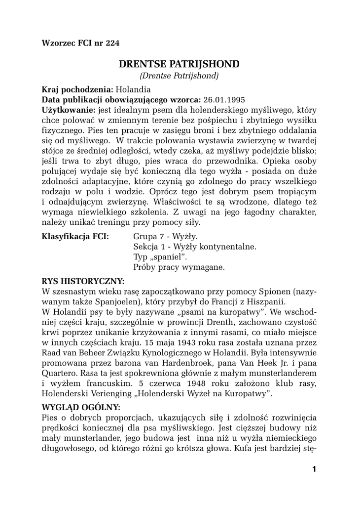 Wzorzec FCI nr 224 DRENTSE PATRIJSHOND (Drentse Patrijshond) Kraj pochodzenia: Holandia Data publikacji obowiązującego wzorca: 26.01.1995 Użytkowanie: jest idealnym psem dla holenderskiego myśliwego, który chce polować w zmiennym terenie bez pośpiechu i zbytniego wysiłku fizycznego. Pies ten pracuje w zasięgu broni i bez zbytniego oddalania się od myśliwego. W trakcie polowania wystawia zwierzynę w twardej stójce ze średniej odległości, wtedy czeka, aż myśliwy podejdzie blisko; jeśli trwa to zbyt długo, pies wraca do przewodnika. Opieka osoby polującej wydaje się być konieczną dla tego wyżła - posiada on duże zdolności adaptacyjne, które czynią go zdolnego do pracy wszelkiego rodzaju w polu i wodzie. Oprócz tego jest dobrym psem tropiącym i odnajdującym zwierzynę. Właściwości te są wrodzone, dlatego też wymaga niewielkiego szkolenia. Z uwagi na jego łagodny charakter, należy unikać treningu przy pomocy siły. Klasyfikacja FCI: Grupa 7 - Wyżły. Sekcja 1 - Wyżły kontynentalne. Typ „spaniel”. Próby pracy wymagane. RYS HISTORYCZNY: W szesnastym wieku rasę zapoczątkowano przy pomocy Spionen (nazywanym także Spanjoelen), który przybył do Francji z Hiszpanii. W Holandii psy te były nazywane „psami na kuropatwy”. We wschodniej części kraju, szczególnie w prowincji Drenth, zachowano czystość krwi poprzez unikanie krzyżowania z innymi rasami, co miało miejsce w innych częściach kraju. 15 maja 1943 roku rasa została uznana przez Raad van Beheer Związku Kynologicznego w Holandii. Była intensywnie promowana przez barona van Hardenbroek, pana Van Heek Jr. i pana Quartero. Rasa ta jest spokrewniona głównie z małym munsterlanderem i wyżłem francuskim. 5 czerwca 1948 roku założono klub rasy, Holenderski Verienging „Holenderski Wyżeł na Kuropatwy”. WYGLĄD OGÓLNY: Pies o dobrych proporcjach, ukazujących siłę i zdolność rozwinięcia prędkości koniecznej dla psa myśliwskiego. Jest cięższej budowy niż mały munsterlander, jego budowa jest inna niż u wyżła niemieckiego długowłosego, od którego różni go krótsza głowa. Kufa jest bardziej stę1 piona i lżejsza z powodu suchych, nieobwisłych fafli, co sprawia, że głowa wydaje się być mniej ciężka niż u poprzednika. Jego tułów jest nieco dłuższy od wysokości w kłębie, zatem wydaje się być lekko wydłużony. Szata, choć niezbyt rozległa na ciele, wygląda na długą z powodu dobrze owłosionych uszu i ogona, nieco bogatsza szata u nasady szyi i na klatce piersiowej, frędzle na uszach, przednich i tylnych nogach oraz na ogonie. ZACHOWANIE - TEMPERAMENT: Posłuszny, lojalny i inteligentny; cechy te sprawiają, że jest wartościowym towarzyszem myśliwego oraz bardzo poszukiwanym zwierzęciem domowym. GŁOWA: Mózgoczaszka: Czaszka: dość obszerna i nieznacznie zaokrąglona. Wzdłuż linii środkowej znajduje się ledwo dostrzegalna bruzda z płytkim stopem w połowie umiarkowanie rozwiniętej potylicy. Łuki brwiowe dobrze rozwinięte. Przełom czołowo-nosowy (stop): widoczny z profilu i od przodu, czaszka pochylona stopniowo ku kufie. Trzewioczaszka: Nos: wierzchołek nosa dobrze rozwinięty i brązowy; nozdrza szeroko rozwarte. Kufa: klinowatego kształtu, stępiona na końcu, bez jakichkolwiek oznaczeń przechodzi w jamę oczną. Górna linia nosa jest szeroka, nie powinna być łukowata (bardzo lekkie zakrzywienie w górnej części jest dozwolone, rzymski nos jest niewłaściwy). Fafle: raczej cienkie i suche. Uzębienie: silne i zdrowe, zgryz nożycowy. Policzki: umiarkowanie rozwinięte, zwężające się stopniowo ku kufie. Oczy: owalnego kształtu i średniej wielkości z dobrze przylegającymi powiekami; koloru bursztynowego, ani za ciemne, ani za jasne; szeroko rozstawione i osadzone tak, że są dobrze chronione. Uszy: wysoko osadzone, szerokie u podstawy, bardziej spiczaste niż u wyżła niemieckiego długowłosego. Ich nasada przechodzi w głowę bez jakiegokolwiek zagięcia. Zaokrąglone końcówki pociągnięte do przodu powinny sięgać trzy palce poza wierzchołek nosa. Nie za ciężkie. Wierzch uszu pokryty obfitym, falistym włosem, lecz nie kręconym. Obramowanie wnętrza obficie owłosione. 2 SZYJA: Potężna, średniej długości, raczej krótka niż długa, tworząca gładką linię pomiędzy głową a tułowiem. Szyja dłuższa niż pożądana nadaje psu bardziej elegancki wygląd, lecz pozbawia mocy i dlatego jest niewłaściwa. Podgardle jest nietypowe dla wyglądu tego suchego, zgrabnego psa i dlatego jest niedopuszczalne. TUŁÓW: Grzbiet: gładka linia ze stosunkowo długiej szyi do poziomu boków i lędźwi, kończąca się lekko ściętym zadem. Plecy: potężne, średniej długości, niezbyt długie, dające razem z dobrze ukątowanym przodem i tylnymi nogami wrażenie wydłużenia. Uda: silnie umięśnione. Zad: szeroki i długi, lekko ścięty. Klatka piersiowa: głęboka, dość obszerna, dosięgająca poziomu łokci; wąska pierś nie sięgająca łokcia jest bardzo niepożądana. Długo pociągnięty mostek, dobrze wysklepione żebra, ani spłaszczone ani beczkowata, tylne żebra widoczne. Linia podbrzusza: nieznacznie wcięta. OGON: Osadzony raczej wysoko, dosięgający stawu skokowego. Górna połowa opuszczona, a dolna lekko zakrzywiona w górę. Z wyjątkiem nasady ogona, bogato pokryty frędzlami z obfitością zmniejszającą się do wierzchołka ogona. W czasie pracy noszony poziomo, nigdy powyżej linii grzbietu; właściwością tej rasy jest to, iż w czasie pracy ogon porusza się po okręgu, szczególnie wtedy, gdy pies łapie odwiatr. KOŃCZYNY: Kończyny przednie: Barki i ramiona: łopatka i ramię długie, kątowane tak dobrze jak pomiędzy ramieniem, dające prosty, gładki wygląd nóg. Łokcie: blisko ciała, bez odchyleń do wewnątrz lub na zewnątrz tak, że nie przeszkadzają w poruszaniu się. Przedramiona: proste i mocno umięśnione. Staw skokowy: silny, o mocnym kośćcu. N
