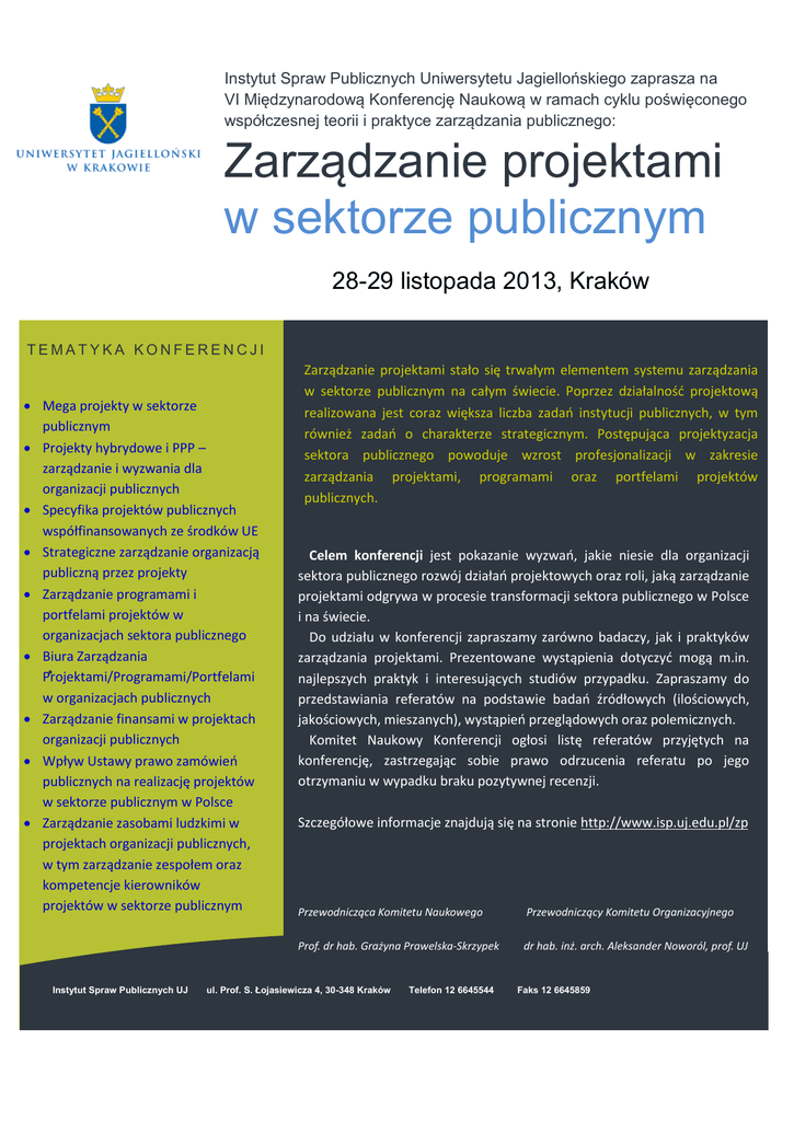 Instytut Spraw Publicznych Uniwersytetu Jagiellońskiego zaprasza na VI Międzynarodową Konferencję Naukową w ramach cyklu poświęconego współczesnej teorii i praktyce zarządzania publicznego: Zarządzanie projektami w sektorze publicznym 28-29 listopada 2013, Kraków TEMATYKA KONFERENCJI Mega projekty w sektorze publicznym Projekty hybrydowe i PPP – zarządzanie i wyzwania dla organizacji publicznych Specyfika projektów publicznych współfinansowanych ze środków UE Strategiczne zarządzanie organizacją publiczną przez projekty Zarządzanie programami i portfelami projektów w organizacjach sektora publicznego Biura Zarządzania Projektami/Programami/Portfelami w organizacjach publicznych Zarządzanie finansami w projektach organizacji publicznych Wpływ Ustawy prawo zamówień publicznych na realizację projektów w sektorze publicznym w Polsce Zarządzanie zasobami ludzkimi w projektach organizacji publicznych, w tym zarządzanie zespołem oraz kompetencje kierowników projektów w sektorze publicznym . Instytut Spraw Publicznych UJ Zarządzanie projektami stało się trwałym elementem systemu zarządzania w sektorze publicznym na całym świecie. Poprzez działalność projektową realizowana jest coraz większa liczba zadań instytucji publicznych, w tym również zadań o charakterze strategicznym. Postępująca projektyzacja sektora publicznego powoduje wzrost profesjonalizacji w zakresie zarządzania projektami, programami oraz portfelami projektów publicznych. Celem konferencji jest pokazanie wyzwań, jakie niesie dla organizacji sektora publicznego rozwój działań projektowych oraz roli, jaką zarządzanie projektami odgrywa w procesie transformacji sektora publicznego w Polsce i na świecie. Do udziału w konferencji zapraszamy zarówno badaczy, jak i praktyków zarządzania projektami. Prezentowane wystąpienia dotyczyć mogą m.in. najlepszych praktyk i interesujących studiów przypadku. Zapraszamy do przedstawiania referatów na podstawie badań źródłowych (ilościowych, jakościowych, mieszanych), wystąpień przeglądowych oraz polemicznych. Komitet Naukowy Konferencji ogłosi listę referatów przyjętych na konferencję, zastrzegając sobie prawo odrzucenia referatu po jego otrzymaniu w wypadku braku pozytywnej recenzji. Szczegółowe informacje znajdują się na stronie http://www.isp.uj.edu.pl/zp Przewodnicząca Komitetu Naukowego Przewodniczący Komitetu Organizacyjnego Prof. dr hab. Grażyna Prawelska-Skrzypek dr hab. inż. arch. Aleksander Noworól, prof. UJ ul. Prof. S. Łojasiewicza 4, 30-348 Kraków Telefon 12 6645544 Faks 12 6645859 PUBLIKACJE POKONFERENCYJNE W zamierzeniu organizatorów tematyka konferencji ma stać się inspiracją do naukowej refleksji, której efektem będą publikacje naukowe dotyczące ewaluacji polityk i projektów publicznych. Oryginalne opracowania należy przygotować w języku polskim lub angielskim. Nadesłane teksty, po uzyskaniu pozytywnej opinii, zostaną opublikowane w kwartalniku „Zarządzanie Publiczne Zeszyty Naukowe ISP UJ”, pod warunkiem zgodności artykułów z profilami czasopism. Teksty o większym rozmiarze publikowane będą w elektronicznych „Monografiach i Studiach ISP UJ”. 1. Prosimy o nadsyłanie streszczeń referatów o objętości 1500 znaków (czcionka Times New Roman, normalny - 11; odstęp między wierszami – pojedynczy; w języku polskim i angielskim). 2. Teksty (artykuły lub rozdziały w monografii) zostaną opublikowane w: Zeszytach Naukowych Instytutu Spraw Publicznych UJ Zarządzanie Publiczne (5 pkt., objętość tekstu ok. 24 000 znaków) lub w Monografiach i Studiach Instytutu Spraw Publicznych Uniwersytetu Jagiellońskiego w formie elektronicznej (objętość tekstu do 40000 znaków) w języku angielskim (7 pkt.) Informacje edytorskie znajdują się na stronie http://www.isp.uj.edu.pl/pliki-do-pobrania1. Autorzy nie otrzymują honorarium za zgłoszone referaty i opublikowane teksty. Prosimy o deklarację dotyczącą długości tekstu, która zamieszczona będzie w formularzu zgłoszenia na konferencję. W programie konferencji przewidziana jest sesja plakatowa. Zachęcamy Państwa do prezentacji wyników prowadzonych prac badawczych w formie plakatów. Technologia wykonania plakatów podana jest na stronie www konferencji http://www.isp.uj.edu.pl/pliki-do-pobrania1. OPŁATY Opłata konferencyjna obejmuje materiały konferencyjne, udział w programie merytorycznym i towarzyszącym konferencji, obiad, uroczystą kolację. opłata za udział w konferencji z referatem (do publikacji) lub plakatem – 650, 00 PLN opłata za udział w konferencji z wystąpieniem (bez publikacji) - 400, 00 PLN opłata za udział w konferencji pracowników i doktorantów Wydziału Zarządzania i Komunikacji Społecznej UJ – 400, 00 PLN opłata za udział w konferencji bez referatu, publikacji i wystąpienia – 330, 00 PLN opłata za zgłoszenie referatu do publikacji bez uczestnictwa – 400, 00 PLN Opłata konferencyjna nie obejmuje kosztów zakwaterowania i podróży. W przypadku rezygnacji z udziału w konferencji do 15 października 2013 roku zwrotowi podlega 50% wniesionej opłaty. Odwołanie uczestnictwa po 15 października 2013 roku jest jednoznaczne z poniesieniem całkowitych kosztów udziału w konferencji. Jedyną obowiązującą formą odwołania uczestnictwa jest forma pisemna Instytut Spraw Publicznych UJ ul. Prof. S. Łojasiewicza 4, 30-348 Kraków Telefon 12 6645544 Faks 12 6645859 WAŻNE TERMINY Do 30.10.2013 r. przesłanie karty zgłoszenia z dołączonym do niej tytułem i streszczeniem referatu (pocztą tradycyjną, faksem na numer 12 6645859 lub pocztą elektroniczną w postaci załącznika do e-maila na adres [email protected] Do 30.10.2013 r. przesłanie tekstu referatu (lub artykułu lub monografii). Przyjmowane będą wyłącznie prace nieogłoszone drukiem i niezłożone w innych miejscach Do 30.10.2013 r. wniesienie opłaty konferencyjnej na konto Pekao SA 94 1240