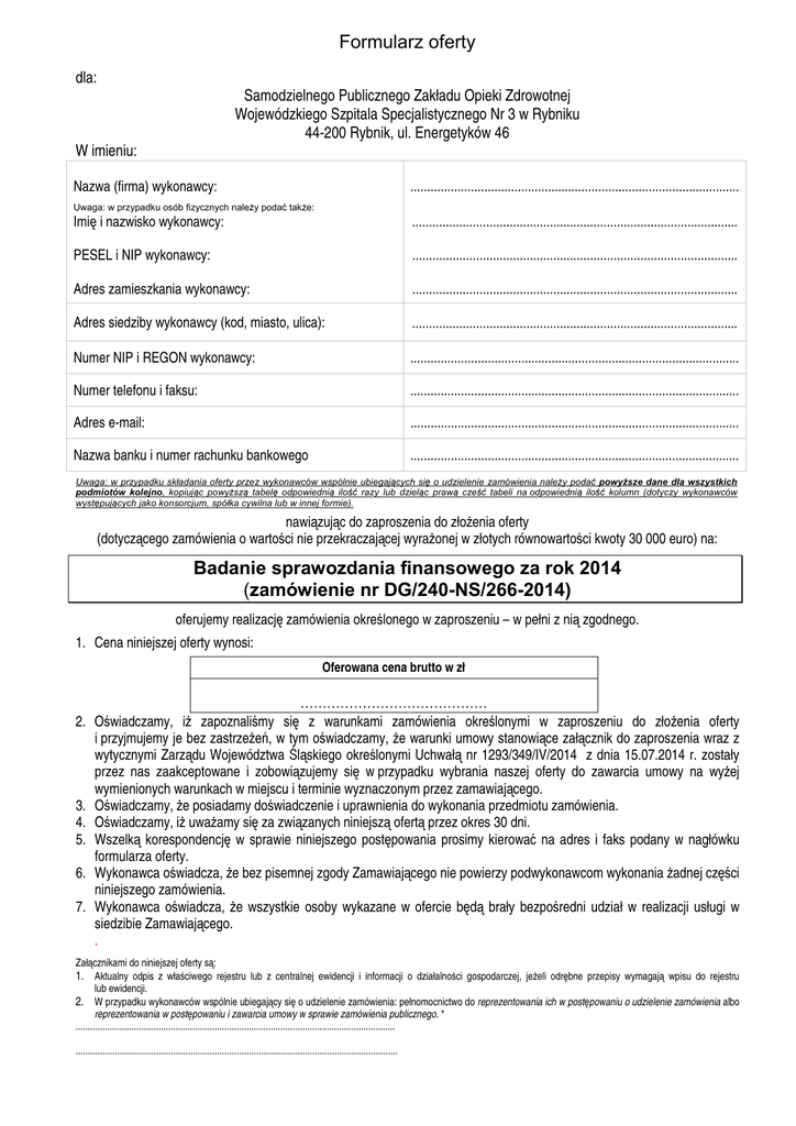 Formularz oferty dla: Samodzielnego Publicznego Zakładu Opieki Zdrowotnej Wojewódzkiego Szpitala Specjalistycznego Nr 3 w Rybniku 44-200 Rybnik, ul. Energetyków 46 W imieniu: Nazwa (firma) wykonawcy: .................................................................................................. Uwaga: w przypadku osób fizycznych należy podać także: Imię i nazwisko wykonawcy: ................................................................................................. PESEL i NIP wykonawcy: ................................................................................................. Adres zamieszkania wykonawcy: ................................................................................................. Adres siedziby wykonawcy (kod, miasto, ulica): ................................................................................................. Numer NIP i REGON wykonawcy: .................................................................................................. Numer telefonu i faksu: .................................................................................................. Adres e-mail: .................................................................................................. Nazwa banku i numer rachunku bankowego .................................................................................................. Uwaga: w przypadku składania oferty przez wykonawców wspólnie ubiegających się o udzielenie zamówienia należy podać powyższe dane dla wszystkich podmiotów kolejno, kopiując powyższą tabelę odpowiednią ilość razy lub dzieląc prawą cześć tabeli na odpowiednią ilość kolumn (dotyczy wykonawców występujących jako konsorcjum, spółka cywilna lub w innej formie). nawiązując do zaproszenia do złożenia oferty (dotyczącego zamówienia o wartości nie przekraczającej wyrażonej w złotych równowartości kwoty 30 000 euro) na: Badanie sprawozdania finansowego za rok 2014 (zamówienie nr DG/240-NS/266-2014) oferujemy realizację zamówienia określonego w zaproszeniu – w pełni z nią zgodnego. 1. Cena niniejszej oferty wynosi: Oferowana cena brutto w zł …………………………………… 2. Oświadczamy, iż zapoznaliśmy się z warunkami zamówienia określonymi w zaproszeniu do złożenia oferty i przyjmujemy je bez zastrzeżeń, w tym oświadczamy, że warunki umowy stanowiące załącznik do zaproszenia wraz z wytycznymi Zarządu Województwa Śląskiego określonymi Uchwałą nr 1293/349/IV/2014 z dnia 15.07.2014 r. zostały przez nas zaakceptowane i zobowiązujemy się w przypadku wybrania naszej oferty do zawarcia umowy na wyżej wymienionych warunkach w miejscu i terminie wyznaczonym przez zamawiającego. 3. Oświadczamy, że posiadamy doświadczenie i uprawnienia do wykonania przedmiotu zamówienia. 4. Oświadczamy, iż uważamy się za związanych niniejszą ofertą przez okres 30 dni. 5. Wszelką korespondencję w sprawie niniejszego postępowania prosimy kierować na adres i faks podany w nagłówku formularza oferty. 6. Wykonawca oświadcza, że bez pisemnej zgody Zamawiającego nie powierzy podwykonawcom wykonania żadnej części niniejszego zamówienia. 7. Wykonawca oświadcza, że wszystkie osoby wykazane w ofercie będą brały bezpośredni udział w realizacji usługi w siedzibie Zamawiającego. . Załącznikami do niniejszej oferty są: 1. Aktualny odpis z właściwego rejestru lub z centralnej ewidencji i informacji o działalności gospodarczej, jeżeli odrębne przepisy wymagają wpisu do rejestru lub ewidencji. 2. W przypadku wykonawców wspólnie ubiegający się o udzielenie zamówienia: pełnomocnictwo do reprezentowania ich w postępowaniu o udzielenie zamówienia albo reprezentowania w postępowaniu i zawarcia umowy w sprawie zamówienia publicznego. * ................................................................................................................................... .................................................................................................................................... 3. Zaświadczenie o wpisie na listę podmiotów uprawnionych do badania sprawozdania finansowego (kserokopia poświadczona za zgodność z oryginałem przez upoważnioną osobę) 4. Zaświadczenie kluczowego biegłego rewidenta o wpisie na listę biegłych rewidentów (kserokopia poświadczona za zgodność z oryginałem przez upoważnioną osobę). 5. Oświadczenie oferenta o spełnieniu warunków określonych w art. 56 ustawy z dnia 7.05.2009 r. o biegłych rewidentach i ich samorządzie, podmiotach uprawnionych do badania sprawozdań finansowych oraz o nadzorze publicznym ( Dz. U. z 2009 r. nr 77, poz. 649). 6. Oświadczenie oferenta o spełnieniu wymogów ustawy – wzór druku stanowiący załącznik nr 3 do zaproszenia. 7. Informacje o wykonawcy wraz z listą szpitali, w których wykonawca w latach poprzednich przeprowadził badanie sprawozdania finansowego wraz ze wskazaniem kluczowego biegłego rewidenta. 8. Potwierdzenie wykonania usługi, o której mowa w pkt.7 9. Wykaz osób, które będą uczestniczyć w realizacji usługi w siedzibie Szpitala wraz z informacjami na temat ich kwalifikacji zawodowych i doświadczenia w badaniu sprawozdań finansowych szpitali niezbędnych do wykonania usługi. 10. Doświadczenie kluczowego biegłego rewidenta w badaniu sprawozdań finansowych szpitali (wzór druku stanowiący załącznik nr 4 do zaproszenia) 11. Aktualna polisa, a przypadku jej braku inny aktualny dokument potwierdzający, że oferent jest ubezpieczony od odpowiedzialności cywilnej w zakresie prowadzonej działalności. 12. Dowód opłacenia składki z tytułu polisy, o której mowa w pkt.11 13. Harmonogram badania na druku stanowiącym załącznik nr 5 do zaproszenia .............................. , dnia ........................ ______________________________________ * - niepotrzebnie skreślić ……….............................................