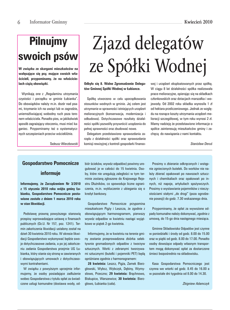 6 Informator Gminny Pilnujmy swoich psów W związku ze skargami mieszkańców na wałęsające się psy, mające swoich właścicieli, przypominamy, że na właścicielach ciążą obowiązki. Wynikają one z „Regulaminu utrzymania czystości i porządku w gminie Łubianka”. Do obowiązków należy m.in. dozór nad psami, trzymanie ich na uwięzi lub w zagrodzie, uniemożliwiającej wobodny ruch poza terenem właściciela. Ponadto pies, w jakikolwiek sposób zagrażający otoczeniu, musi mieć kaganiec. Przypominamy też o systematycznych szczepieniach przeciw wściekliźnie. Tadeusz Wierzbowski Gospodarstwo Pomocnicze informuje Informujemy, że Zarządzeniem Nr 3/2010 z 15 stycznia 2010 roku wójta gminy Łubianka, Gospodarstwo Pomocnicze postawione zostało z dniem 1 marca 2010 roku w stan likwidacji. Podstawę prawną powyższego stanowią przepisy wprowadzające ustawę o finansach publicznych (Dz.U. Nr 157, poz. 1241). Termin zakończenia likwidacji ustalony został na dzień 30 kwietnia 2010 roku. W okresie likwidacji Gospodarstwo wykonywać będzie swoje dotychczasowe zadania, a po jej zakończeniu zadania Gospodarstwa przejmie UG Łubianka, który stanie się stroną w zawieranych i obowiązujących umowach z dotychczasowymi kontrahentami. W związku z powyższym uprzejmie informujemy, że osoby posiadające zadłużenie wobec Gospodarstwa z tytułu opłat za świadczone usługi komunalne (dostawa wody, od- Kwiecień 2010 Zjazd delegatów ze Spółki Wodnej Odbyło się 8. Walne Zgromadzenie Delegatów Gminnej Spółki Wodnej w Łubiance. Spółkę utworzono w celu uporządkowania stosunków wodnych w gminie. Jej celem jest utrzymanie w sprawności istniejących urządzeń melioracyjnych (konserwacja, modernizacja i odbudowa). Dotychczasowe rezultaty działalności spółki pozwoliły przywrócić urządzenia do pełnej sprawności oraz zbudować nowe. Delegatom przedstawiono sprawozdania zarządu z działalności spółki oraz sprawozdanie komisji rewizyjnej z kontroli gospodarki finanso- biór ścieków, wywóz odpadów) powinny uregulować je w całości do 15 kwietnia. Osoby, które nie uregulują zaległości w tym terminie zostaną zgłoszone do Krajowego Rejestru Dłużników, co spowoduje liczne ograniczenia, m.in. wykluczenie z ubiegania się o kredyt bankowy. Gospodarstwo Pomocnicze przypomina mieszkańcom Pigży i Leszcza, że zgodnie z obowiązującym harmonogramem, pierwszy wywóz odpadów w kwietniu nastąpi wyjątkowo w piątek 2-go kwietnia. Informujemy, że w kwietniu na terenie gminy zostanie przeprowadzona zbiórka selektywnie gromadzonych odpadów z tworzyw sztucznych. Worki z zebranymi tworzywami sztucznymi (butelki i pojemniki PET) będą opróżniane zgodnie z harmonogramem: 28 kwietnia: Leszcz, Pigża, Zamek Bierzgłowski, Wybcz, Wybczyk, Dębiny, Wymysłowo, Przeczno; 29 kwietnia: Brąchnowo, Biskupice, Warszewice; 30 kwietnia: Bierzgłowo, Łubianka (cała). wej i urządzeń eksploatowanych przez spółkę. W ciągu 8 lat działalności spółka realizowała prace melioracyjne, opierając się na składkach członkowskich oraz dotacjach marszałka i wojewody. Od 2002 roku składka wynosiła 1 zł od hektara przeliczeniowego. Jednak ze względu na rosnące koszty utrzymania urządzeń melioracji szczegółowej, w tym roku wynosi 2 zł. Mamy nadzieję że przedstawione informacje o spółce zainteresują mieszkańców gminy i zachęcą do nawiązania z nami kontaktu. Stanisław Deruś Prosimy o zbieranie odkręconych i wstępnie zgniecionych butelek. Do worków nie należy zbierać opakowań po nawozach sztucznych i chemikaliach oraz opakowań po innych, niż napoje, artykułach spożywczych. Prosimy o wystawianie pojemników z nieczystościami stałymi „do drogi” (poza ogrodzenie posesji) do godz. 7.30 wskazanego dnia. Przypominamy, że opłat za wywożone odpady komunalne należy dokonywać, zgodnie z umową, do 15-go dnia następnego miesiąca. Gminne Składowisko Odpadów jest czynne w poniedziałki i środy od godz. 8.00 do 15.00 oraz w piątki od godz. 8.00 do 17.00. Ponadto osoby dowożące odpady własnym transportem mogą dokonywać opłat za dostarczone śmieci bezpośrednio na składowisku. Kasa Gospodarstwa Pomocniczego jest czynna we wtorki od godz. 8.45 do 16.00 a w pozostałe dni tygodnia od 8.00 do 14.30. Zbigniew Adamczyk