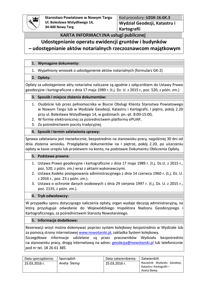 Starostwo Powiatowe w Nowym Targu Kod procedury: UZGK-16.GK.3 Ul. Bolesława Wstydliwego 14, 34-400 Nowy Targ Wydział Geodezji, Katastru i Kartografii KARTA INFORMACYJNA usługi publicznej Udostępnianie operatu ewidencji gruntów i budynków – udostępnianie aktów notarialnych rzeczoznawcom majątkowym 1. Wymagane dokumenty: 1. Wypełniony wniosek o udostępnienie aktów notarialnych (formularz GK-2) 2. Opłaty: Opłaty za udostępnione akty notarialne naliczane są zgodnie z załącznikiem do Ustawy Prawo geodezyjne i kartograficzne z dnia 17 maja 1989 r. (t.j. Dz. U. z 2015 r., poz. 520, z późn. zm.) 3. Sposób i miejsce złożenia dokumentów: 1. Osobiście lub przez pełnomocnika w Biurze Obsługi Klienta Starostwa Powiatowego w Nowym Targu lub w Wydziale Geodezji, Katastru i Kartografii, I piętro, pokój 2.20 przy ul. Bolesława Wstydliwego 14, w godzinach: pn.-pt. 8:00-15:00, 2. W formie elektronicznej za pośrednictwem platformy ePUAP, 3. Za pośrednictwem poczty tradycyjnej. 4. Sposób i termin załatwienia sprawy: Sprawa załatwiana jest niezwłocznie, bezpośrednio na stanowisku pracy, najpóźniej 30 dni od dnia złożenia wniosku. Przeglądanie dokumentów na I piętrze, pokój 2.20, po uiszczeniu opłaty w kasie urzędu lub przelewem na konto, na podstawie Dokumentu Obliczenia Opłaty. 5. Podstawa prawna: 1. Ustawa Prawo geodezyjne i kartograficzne z dnia 17 maja 1989 r. (t.j. Dz.U. z 2015 r., poz. 520, z późn. zm.) wraz z aktami wykonawczymi. 2. Ustawa Kodeks postępowania administracyjnego z dnia 14 czerwca 1960 r. (t.j. Dz. U. z 2016 r., poz. 23 z późn. zm.). 3. Ustawa o ochronie danych osobowych z dnia 29 sierpnia 1997 r. (t.j. Dz. U. z 2015 r., poz. 2135, z późn. zm.). 4. Tryb odwoławczy: W przypadku sporu dotyczącego naliczenia opłaty, organ wydaje decyzję administracyjną, na którą przysługuje odwołanie do Wojewódzkiego Inspektora Nadzoru Geodezyjnego i Kartograficznego, za pośrednictwem Starosty Nowotarskiego. 5. Informacje dodatkowe: Rezerwacji wizyt można dokonywać poprzez system kolejkowy bezpośrednio w Wydziale lub za pomocą strony internetowej www.nowotarski.pl, zakładka System kolejkowy. Szczegółowe informacje udzielane są przez pracowników Wydziału bezpośrednio na stanowisku pracy, drogą internetową na adres: [email protected] lub telefonicznie pod nr tel. 18 26 61 385. Data sporządzenia: 25.03.2016 r. Sporządził: Aneta Ślemp Data zatwierdzenia: 25.03.2016 r. Zatwierdził: Naczelnik Wydziału Geodezji, Katastru i Kartografii – Aneta Ślemp