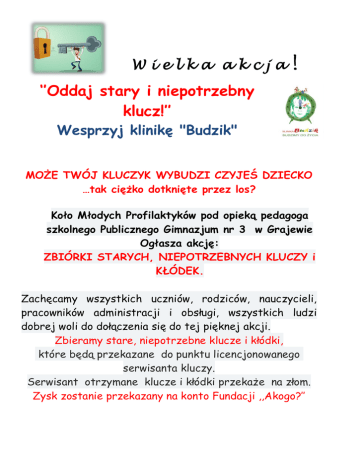 Wielka akcja ! ‘’Oddaj stary i niepotrzebny klucz!’’ Wesprzyj klinikę "Budzik" MOŻE TWÓJ KLUCZYK WYBUDZI CZYJEŚ DZIECKO …tak ciężko dotknięte przez los? Koło Młodych Profilaktyków pod opieką pedagoga szkolnego Publicznego Gimnazjum nr 3 w Grajewie Ogłasza akcję: ZBIÓRKI STARYCH, NIEPOTRZEBNYCH KLUCZY i KŁÓDEK. Zachęcamy wszystkich uczniów, rodziców, nauczycieli, pracowników administracji i obsługi, wszystkich ludzi dobrej woli do dołączenia się do tej pięknej akcji. Zbieramy stare, niepotrzebne klucze i kłódki, które będą przekazane do punktu licencjonowanego serwisanta kluczy. Serwisant otrzymane klucze i kłódki przekaże na złom. Zysk zostanie przekazany na konto Fundacji ,,Akogo?’’ Akcja ta jest formą pomocy dzieciom dotkniętym problemem śpiączki przebywającym w Klinice Budzik Pani Ewy Błaszczyk. Klucze i kłódki wrzucamy do specjalnie oznaczonych pojemników ustawionych na parterze SP4 i PG3/obok dyżurek/. Akcję zapoczątkowało Polskie Stowarzyszenie Licencjonowanych Serwisów Kluczowych. Włącza się w nią coraz więcej szkół i placówek oświatowych. Nasza szkoła również chce mieć swój udział w tym pięknym przedsięwzięciu. JESTEŚMY PRZEKONANI, ŻE RAZEM JESTEŚMY W STANIE ZROBIĆ WIELE DOBREGO I PRZYCZYNIĆ SIĘ DO WSPIERANIA TAK SZLACHETNEGO CELU. Zajrzyj! http://www.pslsk.pl/klucze-dla-budzika/ Koordynator akcji w ZSM 3: Anna Formejster