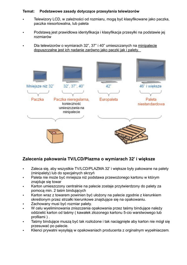Temat: Podstawowe zasady dotyczące przesyłania telewizorów • Telewizory LCD, w zależności od rozmiaru, mogą być klasyfikowane jako paczka, paczka niesortowalna, lub paleta • Podstawą jest prawidłowa identyfikacja i klasyfikacja przesyłki na podstawie jej rozmiarów • Dla telewizorów o wymiarach 32”, 37” i 40” umieszczanych na minipalecie dopuszczalne jest ich nadanie zarówno jako paczki jak i palety. ! Zalecenia pakowania TV/LCD/Plazma o wymiarach 32’ i większe • • • • • • • • Zaleca się, aby wszystkie TV/LCD/PLAZMA 32’ i większe były pakowane na palety (minipalety) lub do specjalnych skrzyń Paleta nie może być mniejsza niż podstawa przewożonego kartonu w którym znajduje się towar Karton umieszczony centralnie na palecie zostaje przytwierdzony do palety za pomocą min. 2 taśm bindujących Karton wraz z towarem powinien być ułożony na palecie zgodnie z kierunkiem określonym przez strzałki kierunkowe znajdujące się na opakowaniu. Zachowany musi być rozmiar palety. W celu wyeliminowania zniszczenia opakowania przez taśmy bindujące należy oddzielić karton od taśmy ( kawałek złozonego kartonu 5-cio warstwowego lub profilami ) . Taśmy bindujące muszą być tak rozłożone i tak naciągnięte aby karton nie mógł się przesuwać po palecie. Klienci prywatni wysyłają w opakowaniach producenta z orginalnym wypełniaczem.