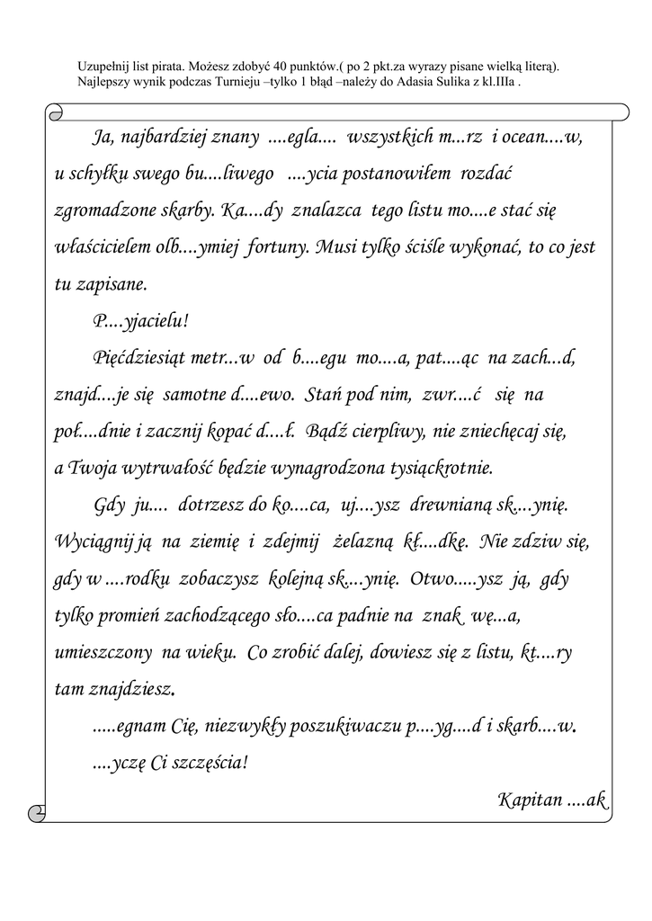 Uzupełnij list pirata. Możesz zdobyć 40 punktów.( po 2 pkt.za wyrazy pisane wielką literą). Najlepszy wynik podczas Turnieju –tylko 1 błąd –należy do Adasia Sulika z kl.IIIa . Ja, najbardziej znany ....egla.... wszystkich m...rz i ocean....w, u schyłku swego bu....liwego ....ycia postanowiłem rozdać zgromadzone skarby. Ka....dy znalazca tego listu mo....e stać się właścicielem olb....ymiej fortuny. Musi tylko ściśle wykonać, to co jest tu zapisane. P....yjacielu! Pięćdziesiąt metr...w od b....egu mo....a, pat....ąc na zach...d, znajd....je się samotne d....ewo. Stań pod nim, zwr....ć się na poł....dnie i zacznij kopać d....ł. Bądź cierpliwy, nie zniechęcaj się, a Twoja wytrwałość będzie wynagrodzona tysiąckrotnie. Gdy ju.... dotrzesz do ko....ca, uj....ysz drewnianą sk....ynię. Wyciągnij ją na ziemię i zdejmij żelazną kł....dkę. Nie zdziw się, gdy w ....rodku zobaczysz kolejną sk....ynię. Otwo.....ysz ją, gdy tylko promień zachodzącego sło....ca padnie na znak wę...a, umieszczony na wieku. Co zrobić dalej, dowiesz się z listu, kt....ry tam znajdziesz. .....egnam Cię, niezwykły poszukiwaczu p....yg....d i skarb....w. ....yczę Ci szczęścia! Kapitan ....ak
