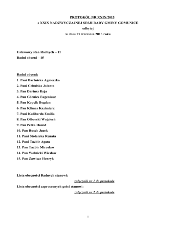 PROTOKÓŁ NR XXIX/2013 z XXIX NADZWYCZAJNEJ SESJI RADY GMINY GOMUNICE odbytej w dniu 27 września 2013 roku Ustawowy stan Radnych – 15 Radni obecni – 15 Radni obecni: 1. Pani Bartnicka Agnieszka 2. Pani Cebulska Jolanta 3. Pan Dariusz Dyja 4. Pan Górnicz Eugeniusz 5. Pan Kopcik Bogdan 6. Pan Klimas Kazimierz 7. Pani Kuliberda Emilia 8. Pan Olborski Wojciech 9. Pan Pełka Dawid 10. Pan Rusek Jacek 11. Pani Stolarska Renata 12. Pani Tazbir Agata 13. Pan Tazbir Mirosław 14. Pan Wolnicki Wiesław 15. Pan Zawisza Henryk Lista obecności Radnych stanowi: załącznik nr 1 do protokołu Lista obecności zaproszonych gości stanowi: załącznik nr 2 do protokołu 1 Obradom XXIX NADZWYCZJNEJ SESJI RADY GMINY przewodniczył Pan Henryk Zawisza – Przewodniczący Rady Gminy. Obrady XXIX NADZWYCZJNEJ SESJI RADY GMINY protokołowała – Aneta Szczepocka Podinspektor Urzędu Gminy. PORZĄDEK DZIENNY: 1. Otwarcie Sesji Rady Gminy i stwierdzenie quorum. 2. Przyjęcie porządku obrad XXIX Nadzwyczajnej Sesji Rady Gminy. 3. Rozpatrzenie projektu uchwały w sprawie uchylenia uchwały nr XXVIII/183/2013 Rady Gminy Gomunice z dnia 17 września 2013 r. w sprawie wprowadzenia zmian do Wieloletniej Prognozy Finansowej Gminy Gomunice na lata 2013-2021. 4. Rozpatrzenie projektu uchwały w sprawie wprowadzenia zmian do Wieloletniej Prognozy Finansowej Gminy Gomunice na lata 2013-2021. 5. Rozpatrzenie projektu uchwały w sprawie zmian w budżecie Gminy Gomunice na rok 2013. 6. Wolne wnioski i informacje. 7. Zakończenie obrad Sesji. Ad. pkt. 1 Otwarcie Sesji Rady Gminy i stwierdzenie quorum. Obrady XXIX Nadzwyczajnej Sesji Rady Gminy otworzył Pan Henryk Zawisza – Przewodniczący Rady Gminy, witając przybyłych na posiedzenie gości. Przewodniczący Rady stwierdził na podstawie listy obecności, iż na ustawowy stan 15-tu Radnych, w Sesji uczestniczy 15-tu Radnych, co stanowi quorum, przy którym obrady XXIX Nadzwyczajnej Sesji będą prawomocne. Ad. pkt. 2 Przyjęcie porządku obrad XXIX Nadzwyczajnej Sesji Rady Gminy. Pan Henryk Zawisza odczytał proponowany porządek obrad a następnie zwrócił się z zapytaniem – Czy są jakieś uwagi bądź propozycje zmian porządku dziennego dzisiejszej Sesji? Wobec braku wniosków Przewodniczący odczytał projekt porządku Sesji a następnie poddał go pod głosowanie. W głosowaniu porządek dzienny XXIX Nadzwyczajnej Sesji Rady Gminy został przyjęty przy 2 głosach „przeciwnych” i 1 – „wstrzymującym”. 2 Ad. pkt. 3 Rozpatrzenie projektu uchwały w sprawie uchylenia uchwały nr XXVIII/183/2013 Rady Gminy Gomunice z dnia 17 września 2013 r. w sprawie wprowadzenia zmian do Wieloletniej Prognozy Finansowej Gminy Gomunice na lata 2013-2021. Pan Jerzy Sewerynek – Wójt Gminy poinformował, że po ostatniej sesji, na której uchwała dotycząca WPF została przyjęta, a zmiany w budżecie – nie, skontaktował się z Regionalną Izbą Obrachunkową. RIO stwierdziło niezgodność i zasugerowało, że radni pracujący i podejmujący decyzję na sesji powinni być konsekwentni. Wójt przyznał, że wystąpił o zwołanie sesji nadzwyczajnej, by uściślić te rozbieżności. Zmiany w budżecie przygotowane na sesję są praktycznie podobne do tych ujętych w poprzednim projekcie uchwały. Były one dyskutowane podczas posiedzeń komisji. Kontrowersje wzbudził samochód strażacki. Zdjęto 160 tys. zł ponieważ, zdaniem Wójta, budżetu nie stać na zakup nowego auta. Pan Sewerynek poinformował, że jest po rozmowach z Komendantem Głównym PSP. Na zakup samochodu średniego promesa jest ważna do kwietnia 2014 r. Nie ma w niej nic na temat nowego auta. Zdaniem Wójta, jeśli trzeba kupić samochód, to należy poszukać auta używanego za dużo mniejsze pieniądze (300 tys. zł). Finansowanie byłoby następujące: 100 tys. zł z Komendy Głównej PSP, 50-80 tys. zł z Wojewódzkiej Rady Bezpieczeństwa i 150 tys. zł z Gminy. Wojewódzki Fundusz Ochrony Środowiska daje dotacje jedynie na nowe samochody. Ponadto Wójt poinformował, że wczoraj rozstrzygnięto przetarg na działki na Kolonii Borowiecko. Do budżetu gminy wpłynie 268 tys. zł. Pieniądze te nie mogą leżeć na lokacie, gdy nie są uregulowane płatności. Jest to niedopuszczalne. Trzeba wykupić urządzenia (150 tys. zł), ponieważ Związek może wystąpić do sądu i konta Gminy zostaną zablokowane. Pan Sewerynek zadeklarował, że jeśli pieniądze ze sprzedaży działek wpłynął, to w pierwszej kolejności ureguluje on zobowiązania wobec Związku Komunalnego. Pan Dawid Pełka przyznał, że w czerwcu prosił, by nie robić ludziom nadziei w kwestii samochodu strażackiego. Mówiono wówczas, że będą pieniądze z Komendy Głównej i z Wojewódzkiego Funduszu Ochrony Środowiska. Stało się to, co radny przewidział. Działka została sprzedana, pieniądze są, a samochód nie zostanie kupiony. Jaka jest zasadność tej sesji? – pytał radny. Wójt Gmina – zasadność wynika z tego, ze jedna uchwała jest sprzeczna z drugą. Pan Henryk Zawisza odczytał projekt przedmiotowej uchwały i wobec braku uwag ze strony radnych, poddał go pod głosowanie. 3 W głosowaniu Radni uchwałę w sprawie uchylenia uchwały nr XXVIII/183/2013 Rady Gminy Gomunice z dnia 17 września 2013 r. w sprawie wprowadzenia zmian do Wieloletniej Prognozy Finansowej Gminy Gomunice na lata 2013-2021 przyjęli 13 głosami „za” przy 2 głosach „wstrzymujących”. UCHWAŁA NR XXIX/190/2013 stanowi zał. nr 3 do niniejszego protokołu Ad. pkt. 4 Rozpatrzenie projektu uchwały w sprawie wprowadzenia zmian do Wieloletniej Prognozy Finansowej Gminy Gomunice na lata 2013-2021. Pan Henryk Zawisza przypomniał, że zmiany w wieloletniej prognozie i zmiany w budżecie zostaną omówione razem tak, jak odbywało się to do tej pory. Pan Sewerynek poinformował, że zmiany przygotowane na sesję nadzwyczajną nie odbiegają od tych z poprzedniej sesji. Dochody budżetowe zwiększa się z tytułu refu