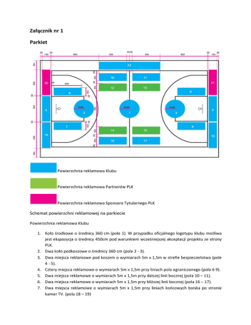Załącznik nr 1 Parkiet Powierzchnia reklamowa Klubu Powierzchnia ierzchnia reklamowa Partnerów Partner PLK Powierzchnia reklamowa Sponsora Tytularnego T PLK Schemat powierzchni reklamowej na parkiecie Powierzchnia reklamowa Klubu 1. Koło środkowe o średnicy 360 cm (pole ( 1). W przypadku oficjalnego logotypu klubu możliwa możliw jest ekspozycja o średnicy 450cm 4 pod warunkiem wcześniejszej akceptacji projektu ze strony PLK. 2. Dwa koło podkoszowe o średnicy 360 cm (pole 2 - 3). 3. Dwa miejsca reklamowe pod koszem o wymiarach 5m x 1,5m w strefie bezpieczeństwa (pole 4 - 5). 4. Cztery miejsca reklamowe o wymiarach 5m x 1,5m przy liniach pola ograniczonego (pola 6 9). 9) 5. Dwa miejsca reklamowe o wymiarach 5m x 1,5m przy dalszej linii bocznej (pola 10 – 11). 6. Dwa miejsca reklamowe o wymiarach 5m x 1,5m przy bliższej linii bocznej (pola 16 – 17). 7. Dwa miejsca reklamowe o wymiarach 5m x 1,5m przy liniach końcowych boiska po stronie kamer TV. (pola 18 – 19)) 8. Nazwa lub herb Miasta, Hali lub Klubu o maksymalnych wymiarach 11m x 1,5m w pasie bezpieczeństwa wzdłuż linii bocznej na środku parkietu (pole 22). Powierzchnia reklamowa PLK (Sponsor Tytularny) 9. Dwa miejsca reklamowe o minimalnych wymiarach 5m x 1, 5m przy liniach końcowych boiska (wymiar zależny od specyfikacji hali i konwersji projektu naklejki na format 3D). (pole 20 i 21). Powierzchnia reklamowa PLK (Partnerzy PLK) 10. Cztery miejsca reklamowe o wymiarach 5m x 1,5m przy linii środkowej boiska (pole 12 – 15). Bandy reklamowe elektroniczne / dynamiczne Kamery TV Kamery TV Kamery TV Schemat powierzchni reklamowej na bandach elektronicznych / dynamicznych 1. Bandy reklamowe o wymiarze 28m x 1m wzdłuż linii bocznej ustawione w trzech rzędach –83 % czasu ekspozycji stanowi powierzchnię reklamową Klubu. 2. Bandy reklamowe o wymiarze 6m x 1m wzdłuż linii końcowej – 83 % czasu ekspozycji stanowi powierzchnię reklamową Klubu. 3. Bandy reklamowe o wymiarze 28m x 1m wzdłuż linii bocznej ustawione w trzech rzędach – 17 % czasu ekspozycji stanowi powierzchnię reklamową PLK przeznaczoną dla Sponsora Tytularnego i Partnerów PLK (realny czas ekspozycji nie krótszy niż 16-18 min). 4. Bandy reklamowe o wymiarze 6m x 1m wzdłuż linii bocznej – 17 % czasu ekspozycji stanowi powierzchnię PLK przeznaczoną dla Sponsora Tytularnego i Partnerów PLK (realny czas ekspozycji nie krótszy niż 16-18 min). 5. Umożliwienie ekspozycji na bandach elektronicznych dodatkowych spotów reklamowych promujących akcje społeczne/niekomercyjne Partnerów PLK lub inne rozgrywki PLK w wymiarze nie większym niż 3% łącznego czasu reklamowego podczas wybranych meczów rozgrywek. 6. Pierwsza emisja reklamy na bandach elektronicznych / dynamicznych podczas rozpoczęcia meczu, przy podrzucie piłki zarezerwowana jest zawsze dla Sponsora Tytularnego PLK. 7. Emisje reklam na bandach elektronicznych / dynamicznych muszę się odbywać w postaci 15 sekundowych bloków reklamowych. Dopuszczalne jest łączenie reklam jednego sponsora w dłuższe bloki stanowiące zawsze wielokrotność 15 sek. 8. Telebimy zainstalowane wewnątrz oraz na zewnątrz hal - 83 % czasu ekspozycji stanowi powierzchnię reklamową Klubu. 9. Telebimy zainstalowane wewnątrz oraz na zewnątrz hal - 17 % czasu ekspozycji stanowi powierzchnię PLK przeznaczoną dla Sponsora Tytularnego i Partnerów PLK. 10. Umożliwienie ekspozycji na telebimach dodatkowych spotów reklamowych promujących akcje społeczne/niekomercyjne Partnerów PLK lub inne rozgrywki PLK w wymiarze nie większym niż 3% łącznego czasu reklamowego podczas wybranych meczów rozgrywek. Bandy reklamowe statyczne Kamery TV Kamery TV Powierzchnia reklamowa na bandach statycznych: Kamery TV 1. Trzy tablice reklamowe o wymiarach 3m x 1m umieszczone w trzech rzędach za linią boczną boiska do dyspozycji Sponsora Tytularnego PLK. 2. Jedna tablica reklamowa o wymiarze 3m x 1m umieszczona na środku przy linii bocznej boiska do dyspozycji Sponsora Oficjalnego PLK. 3. Pozostała powierzchnia reklamowa o wymiarach 3m x 1m za linią boczną i liniami końcowymi stanowi powierzchnię reklamową Klubu. Wymiary tablic reklamowych muszą stanowić wielokrotność szerokości 3m. Załącznik nr 2 Stroje meczowe, rozgrzewkowe, techniczne Przód koszulki meczowej Oficjalny logotyp ogotyp rozgrywek Powierzchnia reklamowa Klubu K Logotyp producenta sprzętu Schemat powierzchni reklamowej na przodzie koszulki. 1. Logo rozgrywek po prawej stronie koszulki o powierzchni 36cm² 36cm (sugerowane wymiary 9,5cm x 3,8cm cm). 2. Logo producenta w środkowej środk części lub po prawej stronie koszulki o powierzchni max. 12 cm². 3. Herb klubu po lewej stronie st koszulki o powierzchni 36cm² (sugerowane wymiary 6cm x 6cm). 4. Numer zawodnika po lewej stronie koszulki o wysokości min. 10 cm. 5. Miejsca reklamowe na środku koszulki: a. dwie powierzchnie reklamowe w linii o maksymalnej powierzchni 320 cm² cm każda (sugerowane wymiary 40cm x 8cm) 8 lub o łącznej powierzchni reklamowej nie przekraczającej 640 cm². b. jedna powierzchnia reklamowa w linii o max powierzchni 600 cm² (sugerowane maksymalne wymiary 40cm x 15cm). Tył koszulki meczowej Powierzchnia reklamowa Klubu Schemat powierzchni reklamowej z tyłu koszulki 1. Jedno miejsce reklamowe w linii o powierzchni 320 cm² (sugerowane wymiary 40cm x 8 cm). 2. Nazwisko zawodnika w linii o minimalnym wymiarze 40cm x 4cm. 3. Numer zawodnika o wysokości min. 20 cm. 4. Jedno miejsca reklamowe w linii o powierzchni 320 cm² (sugerowane wymiary 40cm x 8 cm). Spodenki - przód Oficjalny logotyp rozgrywek Logotyp producenta Schemat powierzchni reklamowej z przodu spodenek meczowych 1. Prawa nogawka – oficjalny logotyp rozgrywek o powierzchni 100cm² (sugerowane wymiary 15,8cm x 6,4cm). 2. Lewa nogawka – numer zawodnika o wysokości 10cm. 3. Logo producenta sprzętu o powierzchni max 12cm². Spodenki – tył Powierzchnia reklamowa Klubu Schem