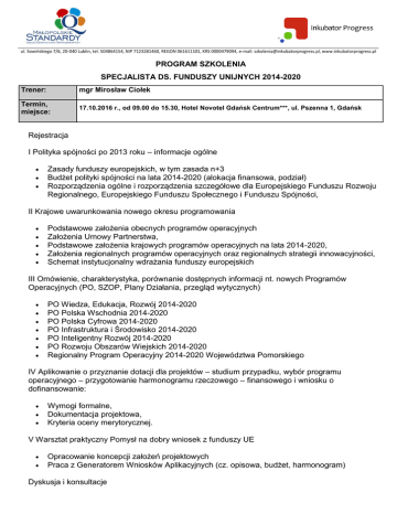 ul. Sowińskiego 7/6, 20-040 Lublin, tel. 504864154, NIP 7123281460, REGON 061611101, KRS 0000479094, e-mail: [email protected], www.inkubatorprogress.pl PROGRAM SZKOLENIA SPECJALISTA DS. FUNDUSZY UNIJNYCH 2014-2020 Trener: mgr Mirosław Ciołek Termin, miejsce: 17.10.2016 r., od 09.00 do 15.30, Hotel Novotel Gdańsk Centrum***, ul. Pszenna 1, Gdańsk Rejestracja I Polityka spójności po 2013 roku – informacje ogólne Zasady funduszy europejskich, w tym zasada n+3 Budżet polityki spójności na lata 2014-2020 (alokacja finansowa, podział) Rozporządzenia ogólne i rozporządzenia szczegółowe dla Europejskiego Funduszu Rozwoju Regionalnego, Europejskiego Funduszu Społecznego i Funduszu Spójności, II Krajowe uwarunkowania nowego okresu programowania Podstawowe założenia obecnych programów operacyjnych Założenia Umowy Partnerstwa, Podstawowe założenia krajowych programów operacyjnych na lata 2014-2020, Założenia regionalnych programów operacyjnych oraz regionalnych strategii innowacyjności, Schemat instytucjonalny wdrażania funduszy europejskich III Omówienie, charakterystyka, porównanie dostępnych informacji nt. nowych Programów Operacyjnych (PO, SZOP, Plany Działania, przegląd wytycznych) PO Wiedza, Edukacja, Rozwój 2014-2020 PO Polska Wschodnia 2014-2020 PO Polska Cyfrowa 2014-2020 PO Infrastruktura i Środowisko 2014-2020 PO Inteligentny Rozwój 2014-2020 PO Rozwoju Obszarów Wiejskich 2014-2020 Regionalny Program Operacyjny 2014-2020 Województwa Pomorskiego IV Aplikowanie o przyznanie dotacji dla projektów – studium przypadku, wybór programu operacyjnego – przygotowanie harmonogramu rzeczowego – finansowego i wniosku o dofinansowanie: Wymogi formalne, Dokumentacja projektowa, Kryteria oceny merytorycznej. V Warsztat praktyczny Pomysł na dobry wniosek z funduszy UE Opracowanie koncepcji założeń projektowych Praca z Generatorem Wniosków Aplikacyjnych (cz. opisowa, budżet, harmonogram) Dyskusja i konsultacje ul. Sowińskiego 7/6, 20-040 Lublin, tel. 504864154, NIP 7123281460, REGON 061611101, KRS 0000479094, e-mail: [email protected], www.inkubatorprogress.pl FORMULARZ ZGŁOSZENIOWY Wypełnij i prześlij [email protected] lub faksem 81 381 28 18 UCZESTNIK/CZKA SZKOLENIA Imię i nazwisko: E-mail: Tel.: Imię i nazwisko: E-mail: Tel.: Imię i nazwisko: E-mail: Tel.: SZKOLENIE Tytuł: SPECJALISTA DS. FUNDUSZY UNIJNYCH 2014-2020 Cena za uczestnika:430,50 zł Miejsce: Hotel Novotel Gdańsk Centrum***, ul. Pszenna 1, Gdańsk Termin: 17.10.2016 r. OSOBA ZGŁASZAJĄCA Imię i nazwisko: Stanowisko: Tel.: E-mail: DANE DO FAKTURY (jeśli jest wymagana) Nazwa: NIP: Miejscowość: Kod pocztowy: E-mail: Ulica: Nr: Wypełnia instytucja budżetowa. Szkolenie finansujemy ze środków budżetowych w zw. z tym prosimy o zastosowanie zwolnienia z VAT. TAK/NIE Warunki uczestnictwa 1.Warunkiem uczestnictwa w szkoleniu jest przesłanie podpisanego formularza zgłoszeniowego faksem 81 381 28 18 lub e-mailem na adres [email protected] 2.Formularz zgłoszeniowy ma formę umowy pomiędzy powyższą firmą/osobą, a Inkubator Progress. 3.Zamawiający otrzyma e-mailem potwierdzenie wpisania na listę uczestników wybranego szkolenia. 4. Zamawiający zobowiązany jest do dokonania opłaty za szkolenie w ciągu 14 dni po zakończeniu szkolenia. 5. Faktura VAT zostanie wystawiona i przekazana Państwu w dniu szkolenia, lub przesłana do Państwa po zakończeniu szkolenia. 6.Rezygnacja z uczestnictwa przyjmowana jest e-mailem lub faksem nie później niż na 5 dni roboczych przed rozpoczęciem szkolenia. Rezygnacja po upływie ww. terminu skutkuje obowiązkiem pokrycia pełnej opłaty za szkolenie. Zamiast zgłoszonej osoby uczestniczyć może inny pracownik firmy. Nie odwołanie zgłoszenia, nie wzięcie udziału w szkoleniu powoduje obciążenie pełnymi kosztami udziału. 7.Organizator zastrzega sobie prawo do dokonywania zmian merytorycznych i organizacyjnych dotyczących szkolenia. 8.W przypadku, gdyby szkolenie nie odbyło się z przyczyn Organizatora i niezależnych od Organizatora – kwota wpłacona na konto Organizatora zostanie bezzwłocznie zwrócona. Oświadczam, że akceptuję warunki uczestnictwa oraz zobowiązuję się do dokonania opłaty w wysokości .................. zł. na konto Inkubator Progress, ul. Sowińskiego 7/6, 20-040 Lublin, Bank BPH: 30 1060 0076 0000 3300 0080 1627 z dopiskiem: „Szkolenie – Specjalista ds. funduszy”. Upoważniam Inkubator Progress do wystawienia faktury bez podpisu. W trybie art. 10 ust. 2 ustawy z dnia 18 lipca 2002 roku o świadczeniu usług drogą elektroniczną (Dz. U. Nr 144 poz. 1204), wyrażam zgodę na otrzymywanie od Inkubator Progress drogą elektroniczną informacji na temat tego szkolenia, jak i informacji o innych produktach szkoleniowych na wskazany powyżej adres elektroniczny. Wyrażam również zgodę na przetwarzanie moich danych osobowych dla potrzeb niezbędnych do otrzymywania informacji od Inkubator Progress (zgodnie z ustawą z 29.08.1997r. o ochronie danych osobowych, Dz. U. 2002 Nr 101 poz. 926, ze zm.). Równocześnie oświadczam, iż poinformowano mnie o przysługującym mi prawie do odwołania udzielonej zgody, co spowoduje niezwłoczne zaprzestanie przesyłania mi informacji handlowych. ……………………………………………… miejscowość i data pieczątka firmowa ……………………………………………… podpis osoby upoważnionej