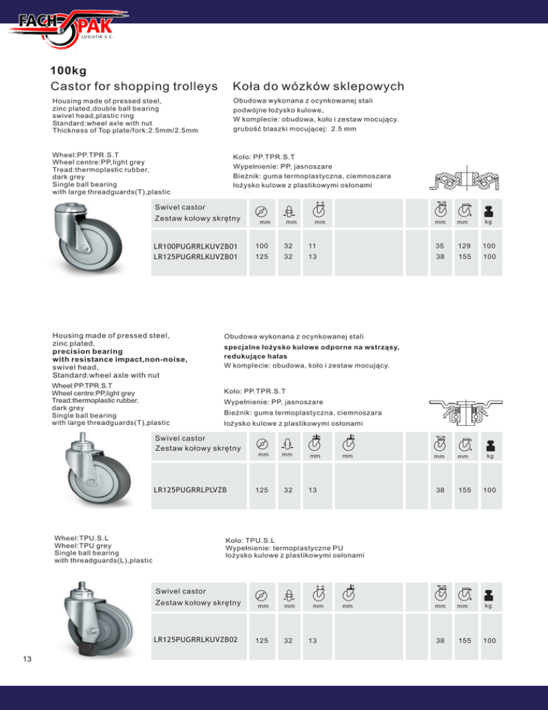 100kg Castor for shopping trolleys Koła do wózków sklepowych Housing made of pressed steel, zinc plated,double ball bearing swivel head,plastic ring Standard:wheel axle with nut Thickness of Top plate/fork:2.5mm/2.5mm Obudowa wykonana z ocynkowanej stali podwójne łożysko kulowe, W komplecie: obudowa, koło i zestaw mocujący. grubość blaszki mocującej: 2.5 mm Wheel:PP.TPR.S.T Wheel centre:PP,light grey Tread:thermoplastic rubber, dark grey Single ball bearing with large threadguards(T),plastic Koło: PP.TPR.S.T Wypełnienie: PP, jasnoszare Bieżnik: guma termoplastyczna, ciemnoszara łożysko kulowe z plastikowymi osłonami Swivel castor Zestaw kołowy skrętny LR100PUGRRLKUVZB01 LR125PUGRRLKUVZB01 Housing made of pressed steel, zinc plated, precision bearing with resistance impact, non-noise, swivel head, Standard:wheel axle with nut Wheel:PP.TPR.S.T Wheel centre:PP,light grey Tread:thermoplastic rubber, dark grey Single ball bearing with large threadguards(T),plastic mm mm mm mm mm kg 100 32 11 35 129 100 125 32 13 38 155 100 Obudowa wykonana z ocynkowanej stali specjalne łożysko kulowe odporne na wstrząsy, redukujące hałas W komplecie: obudowa, koło i zestaw mocujący. Koło: PP.TPR.S.T Wypełnienie: PP, jasnoszare Bieżnik: guma termoplastyczna, ciemnoszara łożysko kulowe z plastikowymi osłonami Swivel castor Zestaw kołowy skrętny LR125PUGRRLPLVZB Wheel:TPU.S.L Wheel:TPU grey Single ball bearing with threadguards(L),plastic mm mm 125 32 mm mm 13 mm mm kg 38 155 100 mm mm kg 38 155 100 Koło: TPU.S.L Wypełnienie: termoplastyczne PU łożysko kulowe z plastikowymi osłonami Swivel castor Zestaw kołowy skrętny LR125PUGRRLKUVZB02 13 13 mm mm 125 32 mm 13 mm