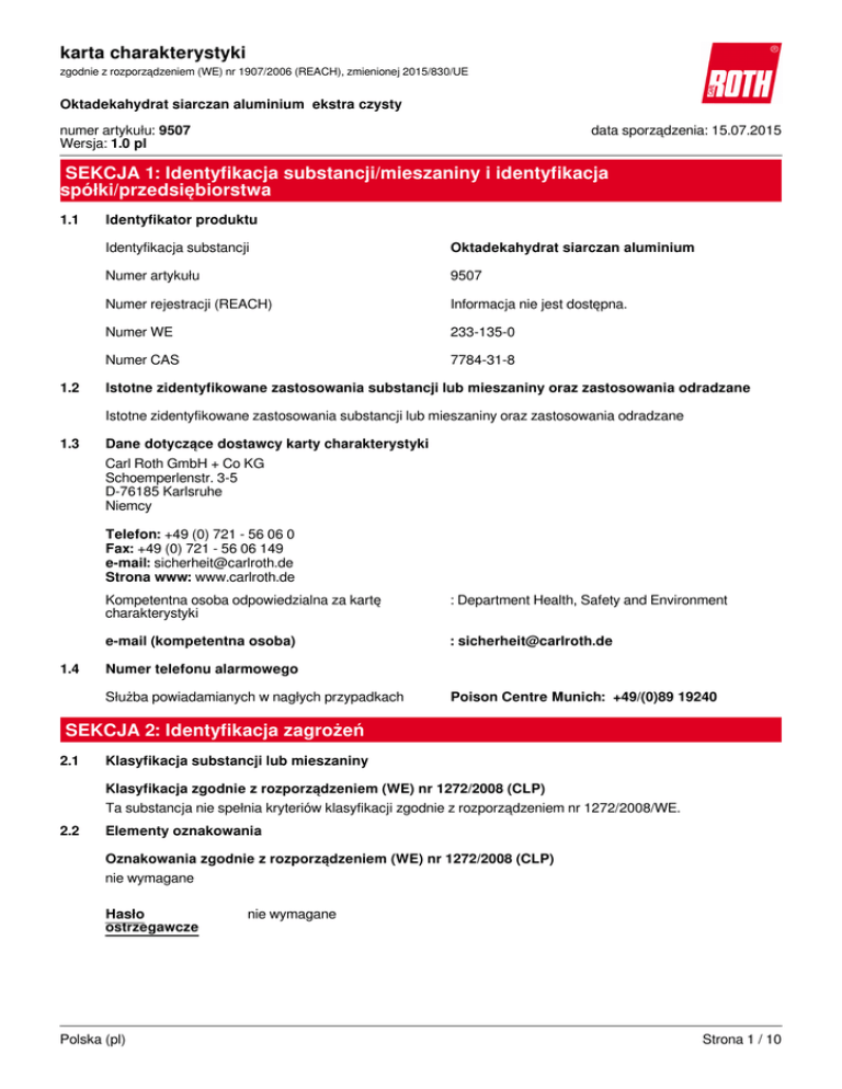 karta charakterystyki zgodnie z rozporządzeniem (WE) nr 1907/2006 (REACH), zmienionej 2015/830/UE Oktadekahydrat siarczan aluminium ekstra czysty numer artykułu: 9507 Wersja: 1.0 pl data sporządzenia: 15.07.2015 SEKCJA 1: Identyfikacja substancji/mieszaniny i identyfikacja spółki/przedsiębiorstwa 1.1 1.2 Identyfikator produktu Identyfikacja substancji Oktadekahydrat siarczan aluminium Numer artykułu 9507 Numer rejestracji (REACH) Informacja nie jest dostępna. Numer WE 233-135-0 Numer CAS 7784-31-8 Istotne zidentyfikowane zastosowania substancji lub mieszaniny oraz zastosowania odradzane Istotne zidentyfikowane zastosowania substancji lub mieszaniny oraz zastosowania odradzane 1.3 Dane dotyczące dostawcy karty charakterystyki Carl Roth GmbH + Co KG Schoemperlenstr. 3-5 D-76185 Karlsruhe Niemcy Telefon: +49 (0) 721 - 56 06 0 Fax: +49 (0) 721 - 56 06 149 e-mail: [email protected] Strona www: www.carlroth.de 1.4 Kompetentna osoba odpowiedzialna za kartę charakterystyki : Department Health, Safety and Environment e-mail (kompetentna osoba) : [email protected] Numer telefonu alarmowego Służba powiadamianych w nagłych przypadkach Poison Centre Munich: +49/(0)89 19240 SEKCJA 2: Identyfikacja zagrożeń 2.1 Klasyfikacja substancji lub mieszaniny Klasyfikacja zgodnie z rozporządzeniem (WE) nr 1272/2008 (CLP) Ta substancja nie spełnia kryteriów klasyfikacji zgodnie z rozporządzeniem nr 1272/2008/WE. 2.2 Elementy oznakowania Oznakowania zgodnie z rozporządzeniem (WE) nr 1272/2008 (CLP) nie wymagane Hasło ostrzegawcze Polska (pl) nie wymagane Strona 1 / 10 karta charakterystyki zgodnie z rozporządzeniem (WE) nr 1907/2006 (REACH), zmienionej 2015/830/UE Oktadekahydrat siarczan aluminium ekstra czysty numer artykułu: 9507 2.3 Inne zagrożenia Nie ma dodatkowych informacji. SEKCJA 3: Skład/informacja o składnikach 3.1 Substancje Nazwa substancji Oktadekahydrat siarczan aluminium Numer WE 233-135-0 Numer CAS 7784-31-8 Wzór cząsteczkowy Al2(SO4)3 x 18H2O Masa cząsteczkowa 666,4 g/mol SEKCJA 4: Środki pierwszej pomocy 4.1 Opis środków pierwszej pomocy Uwagi ogólne Zdjąć zanieczyszczoną odzież. Po narażeniu przez drogi oddechowe Zapewnić dostęp do świeżego powietrza. Zasięgnąć porady lekarza w przypadku pojawienia się jakichkolwiek wątpliwości, lub jeżeli objawy nie ustępują. Po kontakcie ze skórą Spłukać skórę pod strumieniem wody/prysznicem. Należy udać się do dermatologa. Po kontakcie z oczami Ostrożnie płukać wodą przez kilka minut. Zasięgnąć porady lekarza w przypadku pojawienia się jakichkolwiek wątpliwości, lub jeżeli objawy nie ustępują. Po narażeniu przez przewód pokarmowy Wypłukać usta. W przypadku złego samopoczucia skontaktować się z lekarzem. 4.2 Najważniejsze ostre i opóźnione objawy oraz skutki narażenia Objawy i skutki dotychczas nie są znane 4.3 Wskazania dotyczące wszelkiej natychmiastowej pomocy lekarskiej i szczególnego postępowania z poszkodowanym żadne Polska (pl) Strona 2 / 10 karta charakterystyki zgodnie z rozporządzeniem (WE) nr 1907/2006 (REACH), zmienionej 2015/830/UE Oktadekahydrat siarczan aluminium ekstra czysty numer artykułu: 9507 SEKCJA 5: Postępowanie w przypadku pożaru 5.1 Środki gaśnicze Odpowiednie środki gaśnicze Środki gaśnicze należy dostosować do otoczenia rozpylona woda, piana, suchy proszek gaśniczy, dwutlenek węgla (CO2) Niewłaściwe środki gaśnicze silny strumień wody 5.2 Szczególne zagrożenia związane z substancją lub mieszaniną Niepalny. Produkty spalania stwarzające zagrożenie Podczas pożaru mogą powstawać: tlenki siarki (Sox) 5.3 Informacje dla straży pożarnej Gasić pożar z rozsądnej odległości z zachowaniem zwykłych środków ostrożności. Nosić autonomiczny aparat oddechowy. SEKCJA 6: Postępowanie w przypadku niezamierzonego uwolnienia do środowiska 6.1 Indywidualne środki ostrożności, sprzęt ochronny i procedury w sytuacjach awaryjnych 6.2 Środki ostrożności w zakresie ochrony środowiska Zapobiegać przedostaniu się do kanalizacji, wód powierzchniowych i gruntowych. 6.3 Metody i materiały zapobiegające rozprzestrzenianiu się skażenia i służące do usuwania skażenia Porady na temat zapobiegania rozprzestrzenianiu się wycieku Przykrywanie kanalizacji. Porady na temat sposobu czyszczenia wycieku Zbierać mechanicznie. Ograniczenie pylenia. Inne informacje związane z wyciekiem lub uwolnieniem Umieścić w odpowiednich pojemnikach do usunięcia. Odniesienia do innych sekcji Niebezpieczne produkty powstające podczas spalania: zob. sekcja 5. Osobiste wyposażenie ochronne: zob.sekcja 8. Materiały niezgodne: zob. sekcja 10. Postępowanie z odpadami: zob. sekcja 13. Polska (pl) Strona 3 / 10 karta charakterystyki zgodnie z rozporządzeniem (WE) nr 1907/2006 (REACH), zmienionej 2015/830/UE Oktadekahydrat siarczan aluminium ekstra czysty numer artykułu: 9507 SEKCJA 7: Postępowanie z substancjami i mieszaninami oraz ich magazynowanie 7.1 Środki ostrożności dotyczące bezpiecznego postępowania Nie są wymagane żadne dodatkowe środki ostrożności. Zalecenia dotyczące ogólnej higieny pracy Nie spożywać pokarmów i napojów, nie palić w miejscu pracy. Myć ręce przed przerwami w pracy i na jej zakończenie. 7.2 Warunki bezpiecznego magazynowania, w tym informacje dotyczące wszelkich wzajemnych niezgodności Przechowywać w suchym miejscu. Niezgodne substancje lub mieszaniny Obserwować zgodność przechowywania. Uwzglednienie innych zaleceń Nie wymagane. • Wymagania dotyczące wentylacji Stosować ogólne i miejscowe wietrzenie. • Odpowienio zaprojektowane pomieszczenia lub zbiorniki przeznaczone do magazynowania Zalecana temperatura przechowywania: 15 - 25 °C. 7.3 Szczególne zastosowanie(a) końcowe Nie istnieją żadne informacje. SEKCJA 8: Kontrola narażenia/środki ochrony indywidualnej 8.1 Parametry dotyczące kontroli Krajowe dopuszczalne wartości Dopuszczalne wartości narażenia zawodowego (naj