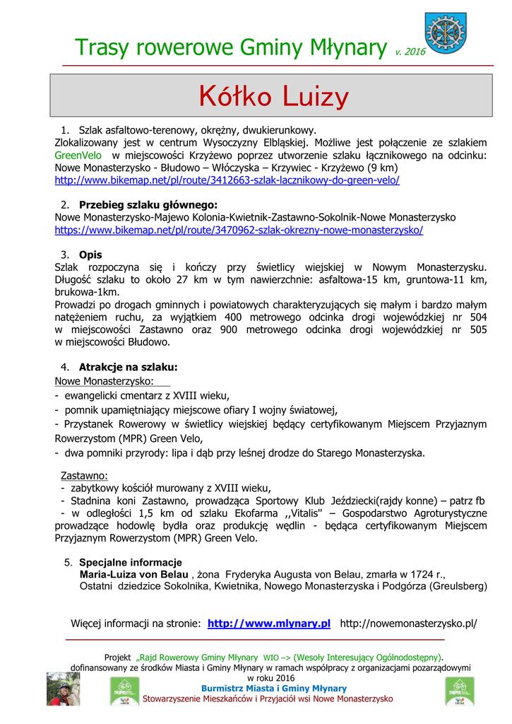 Trasy rowerowe Gminy Młynary v. 2016 Kółko Luizy 1. Szlak asfaltowo-terenowy, okrężny, dwukierunkowy. Zlokalizowany jest w centrum Wysoczyzny Elbląskiej. Możliwe jest połączenie ze szlakiem GreenVelo w miejscowości Krzyżewo poprzez utworzenie szlaku łącznikowego na odcinku: Nowe Monasterzysko - Błudowo – Włóczyska – Krzywiec - Krzyżewo (9 km) http://www.bikemap.net/pl/route/3412663-szlak-lacznikowy-do-green-velo/ 2. Przebieg szlaku głównego: Nowe Monasterzysko-Majewo Kolonia-Kwietnik-Zastawno-Sokolnik-Nowe Monasterzysko https://www.bikemap.net/pl/route/3470962-szlak-okrezny-nowe-monasterzysko/ 3. Opis Szlak rozpoczyna się i kończy przy świetlicy wiejskiej w Nowym Monasterzysku. Długość szlaku to około 27 km w tym nawierzchnie: asfaltowa-15 km, gruntowa-11 km, brukowa-1km. Prowadzi po drogach gminnych i powiatowych charakteryzujących się małym i bardzo małym natężeniem ruchu, za wyjątkiem 400 metrowego odcinka drogi wojewódzkiej nr 504 w miejscowości Zastawno oraz 900 metrowego odcinka drogi wojewódzkiej nr 505 w miejscowości Błudowo. 4. Atrakcje na szlaku: Nowe Monasterzysko: - ewangelicki cmentarz z XVIII wieku, - pomnik upamiętniający miejscowe ofiary I wojny światowej, - Przystanek Rowerowy w świetlicy wiejskiej będący certyfikowanym Miejscem Przyjaznym Rowerzystom (MPR) Green Velo, - dwa pomniki przyrody: lipa i dąb przy leśnej drodze do Starego Monasterzyska. Zastawno: - zabytkowy kościół murowany z XVIII wieku, - Stadnina koni Zastawno, prowadząca Sportowy Klub Jeździecki(rajdy konne) – patrz fb - w odległości 1,5 km od szlaku Ekofarma ,,Vitalis'' – Gospodarstwo Agroturystyczne prowadzące hodowlę bydła oraz produkcję wędlin - będąca certyfikowanym Miejscem Przyjaznym Rowerzystom (MPR) Green Velo. 5. Specjalne informacje Maria-Luiza von Belau , żona Fryderyka Augusta von Belau, zmarła w 1724 r., Ostatni dziedzice Sokolnika, Kwietnika, Nowego Monasterzyska i Podgórza (Greulsberg) Więcej informacji na stronie: http://www.mlynary.pl http://nowemonasterzysko.pl/ Projekt „Rajd Rowerowy Gminy Młynary WIO –> (Wesoły Interesujący Ogólnodostępny). dofinansowany ze środków Miasta i Gminy Młynary w ramach współpracy z organizacjami pozarządowymi w roku 2016 Burmistrz Miasta i Gminy Młynary Stowarzyszenie Mieszkańców i Przyjaciół wsi Nowe Monasterzysko Kółko Luizy Oferta i kontakty na szlaku 1. Nowe Monasterzysko: Aneta Dietrych, [email protected] tel. +48 504 026 582 Renata Śluborska, tel. kom. +48 783 284 797 Oferta: postój dla osób i grup rowerowych do 30 osób; zapewniamy dostęp do: ogródka, małego boiska przy świetlicy - dostęp z lokalnej drogi, stojaków na rowery, świetlicy wiejskiej: sala o pow. 60m2, aneksu kuchennego, WC, lokalnego sklepu spożywczo-przemysłowego czynnego w dni powszednie w godzinach od: 7.30-12.00, 16.00-20.00, oraz w niedziele i święta w godzinach: 9.00 -12.00, 16.00-20.00. Zapewniamy również dostęp do: „Skrzyni narzędzi” – pierwsza pomoc rowerzysty. Za wcześniejszym uzgodnieniem organizujemy zajęcia dla rodzin z dziećmi np. biesiady, ogniska, posiłki kuchni regionalnej. 2. Zastawno: Beata Kmito, tel. kom. +48 519 631 403 Oferta: postój dla osób i grup rowerowych, zapewniamy dostęp do: świetlicy wiejskiej z aneksem kuchenny, WC (klucz dostępny u sołtysa), boiska sportowego z wiatą i miejscem na ognisko, parkingu przy Stadninie Koni w Zastawnie, Gospodarstwa Agroturystycznego „Vitalis”, 2 sklepów spożywczych czynnych w godzinach od 7.00-20.00, placu zabaw dla dzieci. Za wcześniejszym uzgodnieniem dostęp do szerokiej ofert Gospodarstwa Agroturystycznego „Vitalis” dla grup: noclegi, wyżywienie, imprezy kontakt telefoniczny: Agnieszka +48 608 205 205 220. 3. Sokolnik: Elżbieta Kulpińska, tel. kom. +48 504 092 962 Oferta: postój dla osób i grup rowerowych, zapewniamy dostęp do: Stadnini koni, odpoczynek pod tarasem, WC. Za wcześniejszym uzgodnieniem noclegi, wyżywienie, imprezy. Projekt „Rajd Rowerowy Gminy Młynary WIO –> (Wesoły Interesujący Ogólnodostępny). dofinansowany ze środków Miasta i Gminy Młynary w ramach współpracy z organizacjami pozarządowymi w roku 2016 Burmistrz Miasta i Gminy Młynary Stowarzyszenie Mieszkańców i Przyjaciół wsi Nowe Monasterzysko