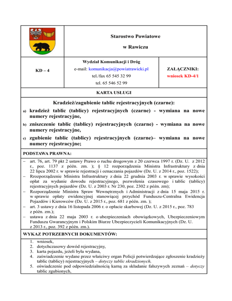 Starostwo Powiatowe w Rawiczu Wydział Komunikacji i Dróg KD – 4 e-mail: [email protected] ZAŁĄCZNIKI: tel./fax 65 545 32 99 wniosek KD-4/1 tel. 65 546 52 99 KARTA USŁUGI Kradzież/zagubienie tablic rejestracyjnych (czarne): a) kradzież tablic (tablicy) rejestracyjnych (czarne) - wymiana na nowe numery rejestracyjne, b) zniszczenie tablic (tablicy) rejestracyjnych (czarne) - wymiana na nowe numery rejestracyjne, c) zgubienie tablic (tablicy) rejestracyjnych (czarne)– wymiana na nowe numery rejestracyjne; PODSTAWA PRAWNA: art. 76, art. 79 pkt 2 ustawy Prawo o ruchu drogowym z 20 czerwca 1997 r. (Dz. U. z 2012 r., poz. 1137 z późn. zm. ); § 12 rozporządzenia Ministra Infrastruktury z dnia 22 lipca 2002 r. w sprawie rejestracji i oznaczania pojazdów (Dz. U. z 2014 r., poz. 1522); Rrozporządzenie Ministra Infrastruktury z dnia 22 grudnia 2003 r. w sprawie wysokości opłat za wydanie dowodu rejestracyjnego, pozwolenia czasowego i tablic (tablicy) rejestracyjnych pojazdów (Dz. U. z 2003 r. Nr 230, poz. 2302 z późn. zm); Rozporządzenie Ministra Spraw Wewnętrznych i Administracji z dnia 15 maja 2015 r. w sprawie opłaty ewidencyjnej stanowiącej przychód Funduszu-Centralna Ewidencja Pojazdów i Kierowców (Dz. U. z 2015 r., poz. 681 z późn. zm. ); art. 3 ustawy z dnia 16 listopada 2006 r. o opłacie skarbowej (Dz. U. z 2015 r., poz. 783 z późn. zm.); ustawa z dnia 22 maja 2003 r. o ubezpieczeniach obowiązkowych, Ubezpieczeniowym Funduszu Gwarancyjnym i Polskim Biurze Ubezpieczycieli Komunikacyjnych (Dz. U. z 2013 r., poz. 392 z późn. zm.). WYKAZ POTRZEBNYCH DOKUMENTÓW: 1. 2. 3. 4. wniosek, dotychczasowy dowód rejestracyjny, karta pojazdu, jeżeli była wydana, zaświadczenie wydane przez właściwy organ Policji potwierdzające zgłoszenie kradzieży tablic (tablicy) rejestracyjnych – dotyczy tablic skradzionych, 5. oświadczenie pod odpowiedzialnością karną za składanie fałszywych zeznań – dotyczy tablic zgubionych, 6. 7. 8. 9. tablice rejestracyjne – dotyczy tablic zniszczonych, ubezpieczenie OC, dowód osobisty, pełnomocnictwo w przypadku działania przez przedstawiciela dla osoby załatwiającej sprawę (za wyjątkiem reprezentowania osoby prawnej przez swoje uprawnione organy lub prokurenta). WYSOKOŚĆ OPŁAT: 1. opłata skarbowa: a) za wydanie tablic rejestracyjnych 0,00 zł, 2. opłata ewidencyjna za wydanie: a) dowodu rejestracyjnego: 0,50 zł, b) pozwolenia czasowego: 0,50 zł, c) zalegalizowanych tablic (tablicy) rejestracyjnych: 0,50 zł, d) nalepki kontrolnej: 0,50 zł, ponadto:dowód rejestracyjny: 54,00 zł, 3. pozwolenie czasowe: 18,50 zł, a) pozwolenie czasowe wydane z urzędu: 13,50 zł, 4. znaki legalizacyjne: 12,50 zł, 5. nalepka kontrolna na szybę (dot. tylko samochodów): 18,50 zł, 6. tablice indywidualne: 1000,00 zł, 7. jedna tablica indywidualna: 500,00 zł, 8. tablice rejestracyjne samochodowe stałe: 80,00 zł, 9. tablica motocyklowa, ciągnikowa, na przyczepę stała: 40,00 zł, 10. tablica motorowerowa stała 30,00 zł 11. pełnomocnictwo 17,00 zł (zwolnione z opłaty jest pełnomocnictwo udzielone małżonkowi, wstępnemu, zstępnemu, rodzeństwu lub gdy mocodawcą jest podmiot zwolniony z opłaty skarbowej). DOKŁADNE OKREŚLENIE MIEJSCA WYKONANIA USŁUGI: Starostwo Powiatowe w Rawiczu Wydział Komunikacji i Dróg Rawicz, Wały J. Dąbrowskiego 2, pokój nr 9 (parter) tel./fax 65 545 32 99, 65 546 52 99 Godziny urzędowania Wydziału: poniedziałek: 8.00-16.00, wtorek- piątek: 7.00-15.00 e-mail: [email protected] OKREŚLENIE CZASU REALIZACJI: w dniu złożenia wniosku wydane zostanie pozwolenie czasowe i zalegalizowane tablice rejestracyjne oraz złożone zostanie zamówienie na wyprodukowanie nowego dowodu rejestracyjnego, czas oczekiwania na nowy dowód rejestracyjny: do 14 dni, w przypadku wyrażenia zgody i podania numeru telefonu komórkowego można otrzymać bezpłatny sms z informacją o możliwości odbioru dowodu rejestracyjnego. INFORMACJA O TRYBIE ODWOŁAWCZYM: Od decyzji administracyjnej wydanej przez Starostę Rawickiego przysługuje odwołanie do Samorządowego Kolegium Odwoławczego w Lesznie w terminie 14 dni od dnia doręczenia decyzji za pośrednictwem Starosty. UWAGI: -