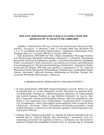 Ks. Paweł RABCZYŃSKI WSD MW Olsztyn STUDIA WARMIŃSKIE XLVII (2010) ROczNE SPRAWOzDANIE z DzIAłAlNOścI WSD MW „HOSIANUM” W OlSzTyNIE (2008/2009) Zgodnie z Regulaminem Wyższego Seminarium Duchownego Metropolii Warmińskiej „Hosianum” w Olsztynie z dnia 17 września 2004 roku (Rozdział VII, § 2, p. 9), przedkłada się Roczne Sprawozdanie z działalności Seminarium, które obejmuje okres od 1 września 2008 do 31 sierpnia 2009 roku. Rok akademicki 2008/2009 był 444. rokiem działalności Wyższego Seminarium Duchownego Metropolii Warmińskiej „Hosianum” w Olsztynie. Seminarium prowadziło formację do kapłaństwa zgodnie z zaleceniami Konferencji Episkopatu Polski, wyrażonymi w Ratio institutionis sacerdotalis pro Polonia, zatwierdzonymi przez Kongregację ds. Wychowania Katolickiego (Seminariów i Instytutów Naukowych) dnia 26 sierpnia 1999 roku oraz zgodnie ze wskazaniami J.E. Ks. Abpa dra Wojciecha Ziemby Metropolity Warmińskiego. Podobnie jak w poprzednich latach, Alumni „Hosianum” odbywali formację intelektualną na Wydziale Teologii Uniwersytetu Warmińsko-Mazurskiego w Olsztynie. I. MODERATORZY SEMINARIUM I INNI PRACOWNICY 1. W roku akademickim 2008/2009 Zarząd Seminarium tworzyli: Rektor: ks. prałat kanonik prof. zw. dr hab. Władysław Nowak; Wicerektor: ks. kanonik dr Paweł Rabczyński; Dyrektor ds. Administracyjnych (Ekonom): ks. prałat kanonik mgr Ludwik Kaniuga; Prefekci: ks. mgr Zdzisław Kieliszek i ks. mgr lic. Wojsław Czupryński. Zarząd, pod kierunkiem Rektora, odbywał cotygodniowe spotkania w celu organizacji życia seminaryjnego i koordynacji pracy wychowawczej. Kompetencje i zakres obowiązków poszczególnych osób wyznaczał Statut i Regulamin „Hosianum”. Rektor, Wicerektor oraz Prefekci prowadzili w każdą środę konferencje wychowawcze dla Alumnów zgodnie z harmonogramem ustalonym przez Rektora. 2. Funkcję Ojców Duchownych pełnili: ks. kanonik dr Tadeusz Marcinkowski i ks. kanonik mgr lic. Andrzej Migrała. Jako przewodnicy i mistrzowie życia wewnętrznego prowadzili oni regularne rozmowy z Alumnami oraz kierownictwo duchowe. Ponadto Spowiednikami Alumnów byli: ks. kanonik mgr lic. Romuald 370 KS. PAWEŁ RABCZYŃSKI Zapadka, ks. prałat mgr Ryszard Andrukiewicz, ks. mgr lic. Andrzej Adamczyk, ks. mgr lic. Krzysztof Bumbul. Spowiednicy pełnili swoją posługę w ustalone i podane do wiadomości Alumnom dni każdego tygodnia. 3. Dyrektorem Chóru WSD MW „Hosianum” był ks. kanonik dr Sławomir Ropiak. Próby chóru odbywały się w każdy wtorek. 4. Komisję ds. Święceń i Posług tworzyli: bp dr Jacek Jezierski, ks. prałat kanonik dr Edward Michoń, ks. kanonik inf. dr Jan Jerzy Górny, ks. prałat kanonik dr Wiesław Więcek, ks. kanonik dr hab. Edward Wiszowaty – prof. UWM, ks. prałat kanonik prof. zw. Władysław Nowak – Rektor, ks. kanonik dr Paweł Rabczyński – Wicerektor, ks. mgr Zdzisław Kieliszek – Prefekt, ks. mgr lic. Wojsław Czupryński – Prefekt, ks. prałat kanonik dr Jan Guzowski, ks. prałat kanonik dr Andrzej Lesiński, ks. kanonik prof. Andrzej Kopiczko, ks. kanonik mgr lic. Tomasz Garwoliński, ks. kanonik dr Lucjan Świto, ks. kanonik mgr lic. Stanisław Zinkiewicz. Komisja obradowała tradycyjnie trzy razy w ciągu roku: na początku roku formacji, po pierwszym semestrze i na zakończenie roku. 5. Dyrektorem Biblioteki WSD MW „Hosianum” był ks. kanonik mgr lic. Tomasz Garwoliński. W Bibliotece pracowały także: mgr Małgorzata Bujnowska, mgr Iwona Spałek, mgr Teresa Ząbczyk. 6. Dyrektorem Wydawnictwa WSD MW „Hosianum” był ks. prałat kanonik dr Jan Guzowski, który pełnił także funkcję Redaktora Naczelnego „Studiów Warmińskich”. Sekretarzem Redakcji tego rocznika naukowego była dr Katarzyna Parzych-Blakiewicz. 7. Członkami Komisji Ekonomicznej WSD MW „Hosianum” byli: Przewodniczący – ks. infułat kanonik dr Jan J. Górny; Członkowie – ks. prałat mgr Andrzej Pluta, ks. kanonik mgr Stanisław Jasiński, ks. prałat mgr lic. Leszek Niedźwiedź. 8. W działach administracyjnych i gospodarczych Seminarium (łącznie z gospodarstwem rolnym w Klewkach) zatrudnionych było 30 osób świeckich, w tym trzy Siostry ze Zgromadzenia Sióstr św. Katarzyny Dziewicy i Męczennicy: s. Donata Stępień, s. Emilia Ostrowska, s. Zofia Maciejewska. Kapelanem Sióstr był ks. prałat kanonik mgr Ludwik Kaniuga. II. ALUMNI 1. Rok akademicki 2008/2009 w WSD MW „Hosianum” w Olsztynie rozpoczęło 74 Alumnów. Na Roku I – 12, na Roku II – 16, na Roku III – 13, na Roku IV – 16, na Roku V – 9, na Roku VI – 8. Dwóch alumnów przebywało na urlopach rektorskich. Alumni odbywali comiesięczne dni skupienia, uczestniczyli w cotygodniowych konferencjach ascetycznych i wychowawczych. ROCZNE SPRAWOZDANIE Z DZIAŁALNOŚCI WSDMW „HOSIANUM” 371 2. W pierwszym semestrze Alumni pełnili następujące funkcje: senior – dn Jarosław Dobrzeniecki, wicesenior – Dariusz Jasiński (rok V), gospodarz – dn Roman Dąbkowski, wicegospodarz – Wojciech Leszczyński (rok V), sacelan – dn Maciej Burdyński, wicesacelan – Arminas Lukoševičius (rok V), ceremoniarz – dn Bartłomiej Koziej, wiceceremoniarz – Paweł Kaczmarczyk (rok V), infirmarz – Zdzisław Muszyński (rok V), wiceinfirmarz – Damian Zembek (rok IV), organista – Dariusz Sonak (rok V), wiceorganista – Andrzej Marciniak (rok IV). W drugim semestrze: senior – Dariusz Jasiński (rok V), wicesenior – Radosław Czerwiński (rok IV), gospodarz – Wojciech Leszczyński (rok V), wicegospodarz – Jacek Pietrasiuk (rok IV), sacelan – Arminas Lukoševičius (rok V), wicesacelan – Łukasz Światkowski (rok IV), ceremoniarz – Paweł Kaczmarczyk (rok V), wiceceremoniarz – Tomasz Mazurowski (rok IV), infirmarz – Zdzisław Muszyński (rok V), wiceinfirmarz – Damian Zembek (rok IV), organista – Dariusz Sonak (rok V), wiceorganista – Andrzej Marciniak (rok IV). 3. W roku akademick