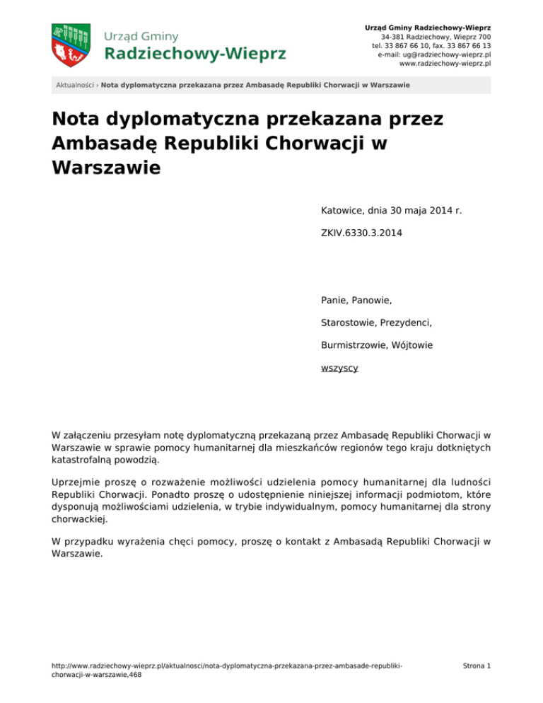 Urząd Gminy Radziechowy-Wieprz 34-381 Radziechowy, Wieprz 700 tel. 33 867 66 10, fax. 33 867 66 13 e-mail: [email protected] www.radziechowy-wieprz.pl Aktualności › Nota dyplomatyczna przekazana przez Ambasadę Republiki Chorwacji w Warszawie Nota dyplomatyczna przekazana przez Ambasadę Republiki Chorwacji w Warszawie Katowice, dnia 30 maja 2014 r. ZKIV.6330.3.2014 Panie, Panowie, Starostowie, Prezydenci, Burmistrzowie, Wójtowie wszyscy W załączeniu przesyłam notę dyplomatyczną przekazaną przez Ambasadę Republiki Chorwacji w Warszawie w sprawie pomocy humanitarnej dla mieszkańców regionów tego kraju dotkniętych katastrofalną powodzią. Uprzejmie proszę o rozważenie możliwości udzielenia pomocy humanitarnej dla ludności Republiki Chorwacji. Ponadto proszę o udostępnienie niniejszej informacji podmiotom, które dysponują możliwościami udzielenia, w trybie indywidualnym, pomocy humanitarnej dla strony chorwackiej. W przypadku wyrażenia chęci pomocy, proszę o kontakt z Ambasadą Republiki Chorwacji w Warszawie. http://www.radziechowy-wieprz.pl/aktualnosci/nota-dyplomatyczna-przekazana-przez-ambasade-republikichorwacji-w-warszawie,468 Strona 1
