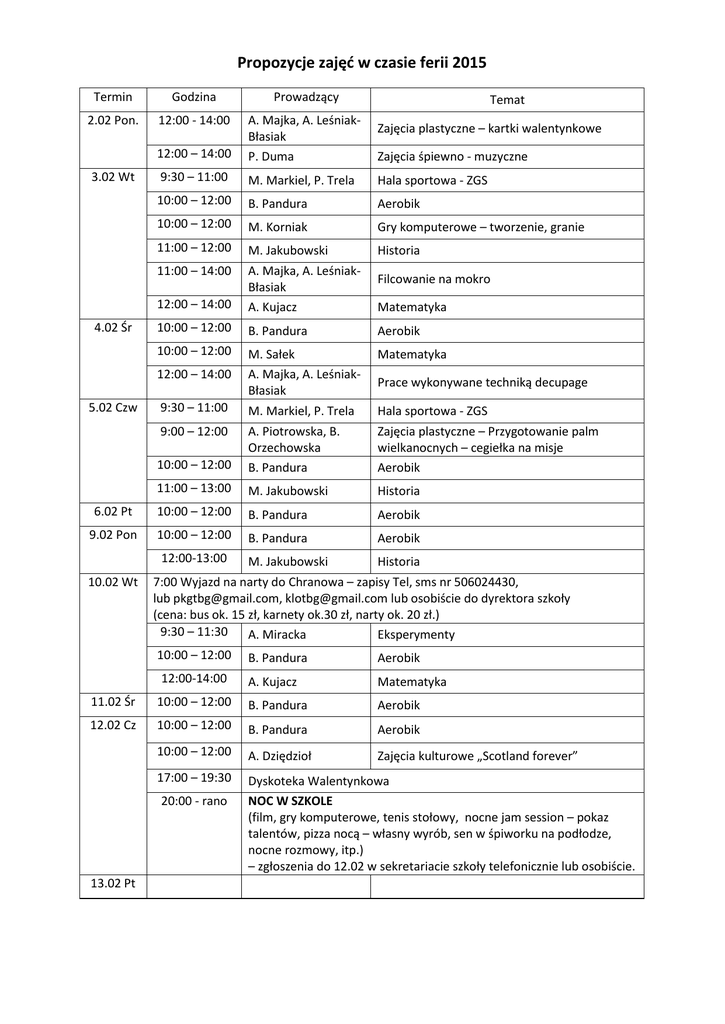 Propozycje zajęć w czasie ferii 2015 Termin Godzina Prowadzący 2.02 Pon. 12:00 - 14:00 A. Majka, A. LeśniakBłasiak Zajęcia plastyczne – kartki walentynkowe 12:00 – 14:00 P. Duma Zajęcia śpiewno - muzyczne 9:30 – 11:00 M. Markiel, P. Trela Hala sportowa - ZGS 10:00 – 12:00 B. Pandura Aerobik 10:00 – 12:00 M. Korniak Gry komputerowe – tworzenie, granie 11:00 – 12:00 M. Jakubowski Historia 11:00 – 14:00 A. Majka, A. LeśniakBłasiak Filcowanie na mokro 12:00 – 14:00 A. Kujacz Matematyka 10:00 – 12:00 B. Pandura Aerobik 10:00 – 12:00 Matematyka 12:00 – 14:00 M. Sałek A. Majka, A. LeśniakBłasiak 9:30 – 11:00 M. Markiel, P. Trela Hala sportowa - ZGS 9:00 – 12:00 A. Piotrowska, B. Orzechowska Zajęcia plastyczne – Przygotowanie palm wielkanocnych – cegiełka na misje 10:00 – 12:00 B. Pandura Aerobik 11:00 – 13:00 M. Jakubowski Historia 6.02 Pt 10:00 – 12:00 B. Pandura Aerobik 9.02 Pon 10:00 – 12:00 B. Pandura Aerobik 3.02 Wt 4.02 Śr 5.02 Czw Temat Prace wykonywane techniką decupage 12:00-13:00 10.02 Wt M. Jakubowski Historia 7:00 Wyjazd na narty do Chranowa – zapisy Tel, sms nr 506024430, lub [email protected], [email protected] lub osobiście do dyrektora szkoły (cena: bus ok. 15 zł, karnety ok.30 zł, narty ok. 20 zł.) 9:30 – 11:30 A. Miracka Eksperymenty 10:00 – 12:00 12:00-14:00 B. Pandura Aerobik A. Kujacz Matematyka 11.02 Śr 10:00 – 12:00 B. Pandura Aerobik 12.02 Cz 10:00 – 12:00 B. Pandura Aerobik 10:00 – 12:00 A. Dziędzioł Zajęcia kulturowe „Scotland forever” 17:00 – 19:30 Dyskoteka Walentynkowa 20:00 - rano 13.02 Pt NOC W SZKOLE (film, gry komputerowe, tenis stołowy, nocne jam session – pokaz talentów, pizza nocą – własny wyrób, sen w śpiworku na podłodze, nocne rozmowy, itp.) – zgłoszenia do 12.02 w sekretariacie szkoły telefonicznie lub osobiście.