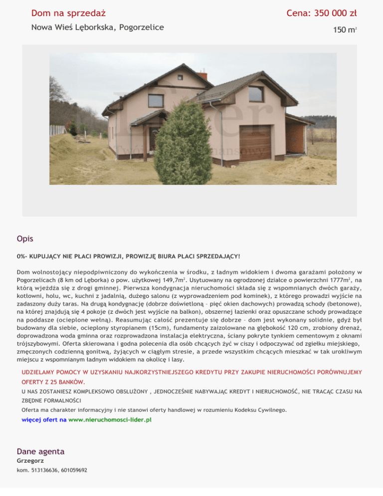 Dom na sprzedaż Cena: 350 000 zł Nowa Wieś Lęborkska, Pogorzelice 150 m 2 Opis 0%‐ KUPUJĄCY NIE PŁACI PROWIZJI, PROWIZJĘ BIURA PŁACI SPRZEDAJĄCY! Dom wolnostojący niepodpiwniczony do wykończenia w środku, z ładnym widokiem i dwoma garażami położony w Pogorzelicach (8 km od Lęborka) o pow. użytkowej 149,7m2. Usytuowany na ogrodzonej działce o powierzchni 1777m2, na którą wjeżdża się z drogi gminnej. Pierwsza kondygnacja nieruchomości składa się z wspomnianych dwóch garaży, kotłowni, holu, wc, kuchni z jadalnią, dużego salonu (z wyprowadzeniem pod kominek), z którego prowadzi wyjście na zadaszony duży taras. Na drugą kondygnację (dobrze doświetloną – pięć okien dachowych) prowadzą schody (betonowe), na której znajdują się 4 pokoje (z dwóch jest wyjście na balkon), obszernej łazienki oraz opuszczane schody prowadzące na poddasze (ocieplone wełną). Reasumując całość prezentuje się dobrze – dom jest wykonany solidnie, gdyż był budowany dla siebie, ocieplony styropianem (15cm), fundamenty zaizolowane na głębokość 120 cm, zrobiony drenaż, doprowadzona woda gminna oraz rozprowadzona instalacja elektryczna, ściany pokryte tynkiem cementowym z oknami trójszybowymi. Oferta skierowana i godna polecenia dla osób chcących żyć w ciszy i odpoczywać od zgiełku miejskiego, zmęczonych codzienną gonitwą, żyjących w ciągłym stresie, a przede wszystkim chcących mieszkać w tak urokliwym miejscu z wspomnianym ładnym widokiem na okolicę i lasy. UDZIELAMY POMOCY W UZYSKANIU NAJKORZYSTNIEJSZEGO KREDYTU PRZY ZAKUPIE NIERUCHOMOŚCI PORÓWNUJEMY OFERTY Z 25 BANKÓW. U NAS ZOSTANIESZ KOMPLEKSOWO OBSŁUŻONY , JEDNOCZEŚNIE NABYWAJĄC KREDYT I NIERUCHOMOŚĆ, NIE TRACĄC CZASU NA ZBĘDNE FORMALNOŚCI Oferta ma charakter informacyjny i nie stanowi oferty handlowej w rozumieniu Kodeksu Cywilnego. więcej ofert na www.nieruchomosci‐lider.pl Dane agenta Grzegorz kom. 513136636, 601059692 Osoba odpowiedzialna Kochman nr licencji: 13270 Szczegóły Symbol oferty Lokalizacja Pow. całkowita [m2] Ilość pokoi Cena Nieruchomość LID‐DS‐7459 Nowa Wieś Lęborkska, Pogorzelice 149,70 m² 4 350 000 PLN Ilość kondygnacji Technologia budowlana Ilość pokoi w budynku Okna nowe PCV Instalacje Balkon Powierzchnia pokoi Podłogi pokoi Typ kuchni Rodzaj kuchni Powierzchnia kuchni Podłoga kuchni Ilość łazienek Zagosp. działki 4 10,7 ; 17,9 ; 7 ; 28,5 m² terakota bez zabudowy aneks kuchenny ‐ połączony z jadalnią 38,20 m² terakota 2 Glazura łazienki bez glazury Podłoga łazienki terakota Ilość WC 1 Glazura WC bez glazury Podłoga WC terakota Ilość przedpokoi Powierzchnia przedpokoi Podłoga przedpokoi 1 16,00 m² terakota mieszany Garaż Powierzchnia działki [m2] Pomieszczenia 2 Ukształtowanie działki Kształt działki Rodzaj domu Pokrycie dachu Pozwolenie na użytkowanie Powierzchnia użytkowa [m2] Stan budynku Podpiwniczenie Ogrodzenie działki Plac zabaw Woda Dojazd nowe brak 1 777 m² zagospodarowana płaska prostokąt wolnostojący blachodachówka tak 149,7 m² do wykończenia nie częściowo ogrodzona nie na działce droga polna Alarm nie Winda nie Tarasy taras duży Drzwi antywłamaniowe tak Prąd na działce Kanalizacja na działce