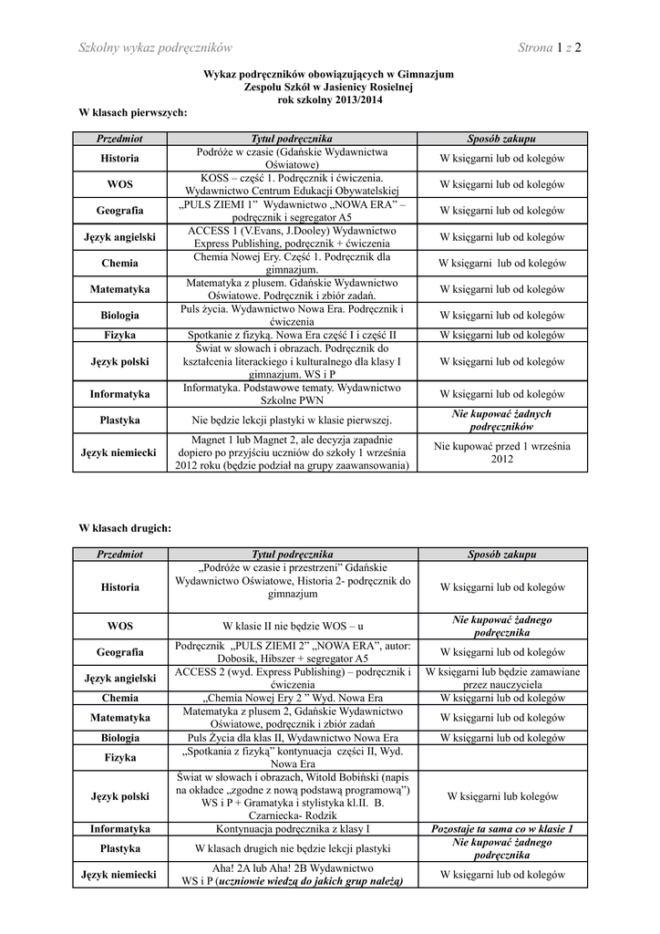 Szkolny wykaz podręczników Strona 1 z 2 Wykaz podręczników obowiązujących w Gimnazjum Zespołu Szkół w Jasienicy Rosielnej rok szkolny 2013/2014 W klasach pierwszych: Przedmiot Historia WOS Geografia Język angielski Chemia Matematyka Biologia Fizyka Język polski Informatyka Tytuł podręcznika Podróże w czasie (Gdańskie Wydawnictwa Oświatowe) KOSS – część 1. Podręcznik i ćwiczenia. Wydawnictwo Centrum Edukacji Obywatelskiej „PULS ZIEMI 1” Wydawnictwo „NOWA ERA” – podręcznik i segregator A5 ACCESS 1 (V.Evans, J.Dooley) Wydawnictwo Express Publishing, podręcznik + ćwiczenia Chemia Nowej Ery. Część 1. Podręcznik dla gimnazjum. Matematyka z plusem. Gdańskie Wydawnictwo Oświatowe. Podręcznik i zbiór zadań. Puls życia. Wydawnictwo Nowa Era. Podręcznik i ćwiczenia Spotkanie z fizyką. Nowa Era część I i część II Świat w słowach i obrazach. Podręcznik do kształcenia literackiego i kulturalnego dla klasy I gimnazjum. WS i P Informatyka. Podstawowe tematy. Wydawnictwo Szkolne PWN Sposób zakupu W księgarni lub od kolegów W księgarni lub od kolegów W księgarni lub od kolegów W księgarni lub od kolegów W księgarni lub od kolegów W księgarni lub od kolegów W księgarni lub od kolegów W księgarni lub od kolegów W księgarni lub od kolegów W księgarni lub od kolegów Plastyka Nie będzie lekcji plastyki w klasie pierwszej. Nie kupować żadnych podręczników Język niemiecki Magnet 1 lub Magnet 2, ale decyzja zapadnie dopiero po przyjściu uczniów do szkoły 1 września 2012 roku (będzie podział na grupy zaawansowania) Nie kupować przed 1 września 2012 W klasach drugich: Przedmiot Historia WOS Tytuł podręcznika „Podróże w czasie i przestrzeni” Gdańskie Wydawnictwo Oświatowe, Historia 2- podręcznik do gimnazjum W klasie II nie będzie WOS – u Informatyka Podręcznik „PULS ZIEMI 2” „NOWA ERA”, autor: Dobosik, Hibszer + segregator A5 ACCESS 2 (wyd. Express Publishing) – podręcznik i ćwiczenia „Chemia Nowej Ery 2 ” Wyd. Nowa Era Matematyka z plusem 2, Gdańskie Wydawnictwo Oświatowe, podręcznik i zbiór zadań Puls Życia dla klas II, Wydawnictwo Nowa Era „Spotkania z fizyką” kontynuacja części II, Wyd. Nowa Era Świat w słowach i obrazach, Witold Bobiński (napis na okładce „zgodne z nową podstawą programową”) WS i P + Gramatyka i stylistyka kl.II. B. Czarniecka- Rodzik Kontynuacja podręcznika z klasy I Plastyka W klasach drugich nie będzie lekcji plastyki Język niemiecki Aha! 2A lub Aha! 2B Wydawnictwo WS i P (uczniowie wiedzą do jakich grup należą) Geografia Język angielski Chemia Matematyka Biologia Fizyka Język polski Sposób zakupu W księgarni lub od kolegów Nie kupować żadnego podręcznika W księgarni lub od kolegów W księgarni lub będzie zamawiane przez nauczyciela W księgarni lub od kolegów W księgarni lub od kolegów W księgarni lub od kolegów W księgarni lub kolegów Pozostaje ta sama co w klasie 1 Nie kupować żadnego podręcznika W księgarni lub od kolegów Szkolny wykaz podręczników Strona 2 z 2 W klasach trzecich: Przedmiot Historia WOS Geografia Język angielski Chemia Matematyka Biologia Język polski Informatyka Edukacja dla bezpieczeństwa Fizyka Język niemiecki Tytuł podręcznika Historia 3 – podręcznik dla Gimnazjum (Gdańskie Wydawnictwa Oświatowe) KOSS – cz. 2. Materiały pomocniczy dla uczniów Gimnazjum. Podręcznik „PULS ZIEMI 3”, wyd. „NOWA ERA”, autor Roman Malarz + segregator A5 ACCESS 3 - Wyd. Express Publishing – podręcznik + ćwiczenia Chemia 3 – Nowa Era, J.Kulawik, M.Litwin, bez ćwiczeń Matematyka z plusem 3, Gdańskie Wydawnictwo Oświatowe, podręcznik i zbiór zadań Puls Życia 3, B. Sągin, A.Boczrowski, Nowa Era, podręcznik i ćwiczenia Świat w słowach i obrazach, WSiP, autor Witold Bobiński + Gramatyka i stylistyka – Z. Czarnecka – Rodzik, WSiP (Język polski w gimnazjum) Kontynuacja podręcznika z klasy II „Żyję i działam bezpiecznie”, J. Stoma, G. Zając, Nowa Era „Spotkania z fizyką” cz. III i IV, Nowa Era „AHA Neu” 3A lub „AHA Neu” 3 B WSiP, A. Potopowicz, K. Tkaczyk (uczniowie wiedzą do jakich grup należą) Sposób zakupu W księgarni lub od kolegów W księgarni lub od kolegów W księgarni lub od kolegów W księgarni lub od kolegów W księgarni lub od kolegów W księgarni lub od kolegów W księgarni lub od kolegów W księgarni lub od kolegów Podręcznik uczniowie już mają W księgarni lub od kolegów W księgarni lub od kolegów W księgarni lub od kolegów Opinia Rady Pedagogicznej z dnia 05.06.2013r. ……………………………… (pieczątka, podpis dyrektora)