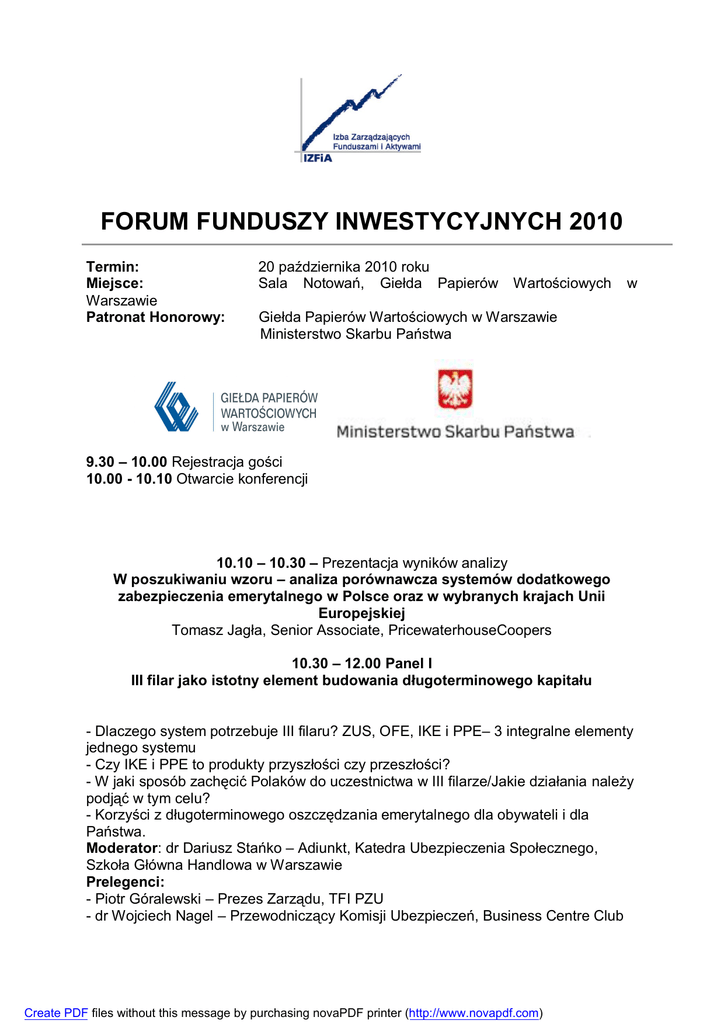 FORUM FUNDUSZY INWESTYCYJNYCH 2010 Termin: Miejsce: Warszawie Patronat Honorowy: 20 października 2010 roku Sala Notowań, Giełda Papierów Wartościowych w Giełda Papierów Wartościowych w Warszawie Ministerstwo Skarbu Państwa 9.30 – 10.00 Rejestracja gości 10.00 - 10.10 Otwarcie konferencji 10.10 – 10.30 – Prezentacja wyników analizy W poszukiwaniu wzoru – analiza porównawcza systemów dodatkowego zabezpieczenia emerytalnego w Polsce oraz w wybranych krajach Unii Europejskiej Tomasz Jagła, Senior Associate, PricewaterhouseCoopers 10.30 – 12.00 Panel I III filar jako istotny element budowania długoterminowego kapitału - Dlaczego system potrzebuje III filaru? ZUS, OFE, IKE i PPE– 3 integralne elementy jednego systemu - Czy IKE i PPE to produkty przyszłości czy przeszłości? - W jaki sposób zachęcić Polaków do uczestnictwa w III filarze/Jakie działania należy podjąć w tym celu? - Korzyści z długoterminowego oszczędzania emerytalnego dla obywateli i dla Państwa. Moderator: dr Dariusz Stańko – Adiunkt, Katedra Ubezpieczenia Społecznego, Szkoła Główna Handlowa w Warszawie Prelegenci: - Piotr Góralewski – Prezes Zarządu, TFI PZU - dr Wojciech Nagel – Przewodniczący Komisji Ubezpieczeń, Business Centre Club Create PDF files without this message by purchasing novaPDF printer (http://www.novapdf.com) - Jacek Socha - Wiceprezes Zarządu, PricewaterhouseCoopers - dr Wiktor Wojciechowski – Wiceprezes Zarządu, Fundacja Forum Obywatelskiego Rozwoju 12.00 – 12.10 Wręczenie nagród w konkursach Izby 12.10-12.40 Przerwa kawowa 12.40 – 14.10 Panel II Jak procesy prywatyzacyjne mogą wpływać na oszczędzanie Polaków - Jakie korzyści z prywatyzacji mogą czerpać inwestorzy - Inwestycje giełdowe a kondycja polskiej gospodarki - Aktywność Polaków na giełdzie a struktura oszczędności gospodarstw domowych - Fundusze inwestycyjne – istotni partnerzy w procesach prywatyzacyjnych Moderator: dr Piotr Pisarewicz - Wiceprezes Zarządu, PKO BP Bankowy PTE / Katedra Bankowości, Uniwersytet Gdański Prelegenci: - Beata Jarosz - Członek Zarządu, Giełda Papierów Wartościowych w Warszawie - dr Marcin Dyl - Prezes Zarządu, Izba Zarządzających Funduszami i Aktywami - Adam Leszkiewicz - Podsekretarz Stanu, Ministerstwo Skarbu Państwa - Tomasz Publicewicz - Analityk, Analizy Online S.A. 14.10-14.20 Podsumowanie konferencji 14.20-Lunch *Program może ulec zmianie z przyczyn niezależnych od Organizatora Create PDF files without this message by purchasing novaPDF printer (http://www.novapdf.com)