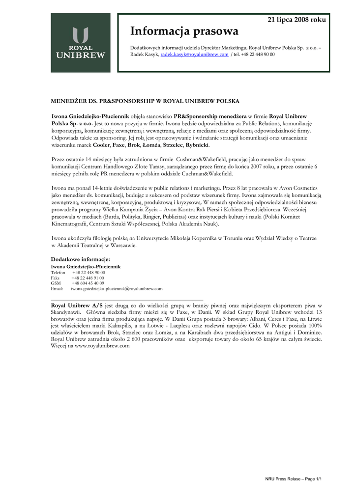 21 lipca 2008 roku Informacja prasowa Dodatkowych informacji udziela Dyrektor Marketingu, Royal Unibrew Polska Sp. z o.o. – Radek Kasyk, [email protected] / tel. +48 22 448 90 00 MENEDŻER DS. PR&SPONSORSHIP W ROYAL UNIBREW POLSKA Iwona Gniedziejko-Płuciennik objęła stanowisko PR&Sponsorship menedżera w firmie Royal Unibrew Polska Sp. z o.o. Jest to nowa pozycja w firmie. Iwona będzie odpowiedzialna za Public Relations, komunikację korporacyjną, komunikację zewnętrzną i wewnętrzną, relacje z mediami oraz społeczną odpowiedzialność firmy. Odpowiada także za sponsoring. Jej rolą jest opracowywanie i wdrażanie strategii komunikacji oraz umacnianie wizerunku marek Cooler, Faxe, Brok, Łomża, Strzelec, Rybnicki. Przez ostatnie 14 miesięcy była zatrudniona w firmie Cushman&Wakefield, pracując jako menedżer do spraw komunikacji Centrum Handlowego Złote Tarasy, zarządzanego przez firmę do końca 2007 roku, a przez ostatnie 6 miesięcy pełniła rolę PR menedżera w polskim oddziale Cuchman&Wakefield. Iwona ma ponad 14-letnie doświadczenie w public relations i marketingu. Przez 8 lat pracowała w Avon Cosmetics jako menedżer ds. komunikacji, budując z sukcesem od podstaw wizerunek firmy. Iwona zajmowała się komunikacją zewnętrzną, wewnętrzną, korporacyjną, produktową i kryzysową. W ramach społecznej odpowiedzialności biznesu prowadziła programy Wielka Kampania Życia – Avon Kontra Rak Piersi i Kobieta Przedsiębiorcza. Wcześniej pracowała w mediach (Burda, Polityka, Ringier, Publicitas) oraz instytucjach kultury i nauki (Polski Komitet Kinematografii, Centrum Sztuki Współczesnej, Polska Akademia Nauk). Iwona ukończyła filologię polską na Uniwersytecie Mikołaja Kopernika w Toruniu oraz Wydział Wiedzy o Teatrze w Akademii Teatralnej w Warszawie. Dodatkowe informacje: Iwona Gniedziejko-Płuciennik Telefon Faks GSM Email: +48 22 448 90 00 +48 22 448 91 00 +48 604 45 40 09 [email protected] ––––––––––––––––––––––––––––––––––––––––––––––––––––––––––––––––––––––––––––––––––––– Royal Unibrew A/S jest drugą co do wielkości grupą w branży piwnej oraz największym eksporterem piwa w Skandynawii. Główna siedziba firmy mieści się w Faxe, w Danii. W skład Grupy Royal Unibrew wchodzi 13 browarów oraz jedna firma produkująca napoje. W Danii Grupa posiada 3 browary: Albani, Ceres i Faxe, na Litwie jest właścicielem marki Kalnapilis, a na Łotwie - Lacplesa oraz rozlewni napojów Cido. W Polsce posiada 100% udziałów w browarach Brok, Strzelec oraz Łomża, a na Karaibach dwa przedsiębiorstwa na Antigui i Dominice. Royal Unibrew zatrudnia około 2 600 pracowników oraz eksportuje towary do około 65 krajów na całym świecie. Więcej na www.royalunibrew.com NRU Press Relase – Page 1/1