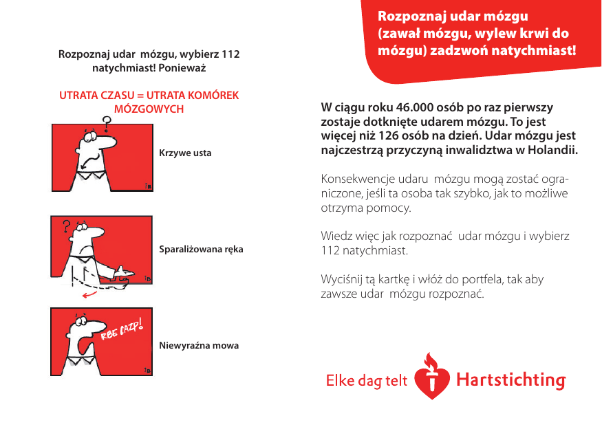 Rozpoznaj udar mózgu, wybierz 112 natychmiast! Ponieważ UTRATA CZASU = UTRATA KOMÓREK MÓZGOWYCH Krzywe usta Rozpoznaj udar mózgu (zawał mózgu, wylew krwi do mózgu) zadzwoń natychmiast! W ciągu roku 46.000 osób po raz pierwszy zostaje dotknięte udarem mózgu. To jest więcej niż 126 osób na dzień. Udar mózgu jest najczestrzą przyczyną inwalidztwa w Holandii. Konsekwencje udaru mózgu mogą zostać ograniczone, jeśli ta osoba tak szybko, jak to możliwe otrzyma pomocy. Sparaliżowana ręka Wiedz więc jak rozpoznać udar mózgu i wybierz 112 natychmiast. Wyciśnij tą kartkę i włóż do portfela, tak aby zawsze udar mózgu rozpoznać. Niewyraźna mowa Tromboliza Dla jednego z siedmiu pacjentów dotkniętych udarem mózgu konsekwencje moga być minimalne poprzez podanie trombolizy. Tromboliza polega na podaniu leków, które rozpuszczają zakrzepniętą krew i przywracają przepływ krwi w mózgu. Pomoc musi nastąpić jak najszybciej. Im szybciej tym lepiej, conajmniej w przeciągu 4,5 godzin od pojawienia się objawów. U 80 % pacjentów z udarem mózgu zakrzep zamknął dopływ krwi z tlenem do mózgu. Przed rozpoczęciem leczenia potrzebne jest wykonanie tomografii komputerowej głowy, badania, które pokaże, czy wystąpił już uraz mózgu. Stroke Unit Wszyscy pacjenci z udarem mózgu będą przyjęci do szpitala na oddział “Stroke Unit”. Stroke Unit jest oddziałem specjalizującym się w opiece nad pacjentami z udarem mózgu. Przyjęcie na powyżej wymieniony oddział jest istotne dla dobrego leczenia udaru mózgu. Rozpoznaj udar mózgu, wybierz 112 natychmiast! Ponieważ UTRATA CZASU = UTRATA KOMÓREK MÓZGOWYCH Jeśli u kogoś widoczne są objawy udaru mózgu, wybierz 112 natychmiast! Przy udarze mózgu liczy się każda minuta. Leczenie w ciągu pierwszych 4,5 godzin od pojawienia się objawów, zwiększa szansę na regenerację uszkodzonych komórek mózgowych. Więcej informacji znajdziesz na: www.hartstichting.nl; lub zadzwoń na linię informacyjną: 0900 3000 300 (lokalna taryfa) pon – pt od 9.00 do 13.00