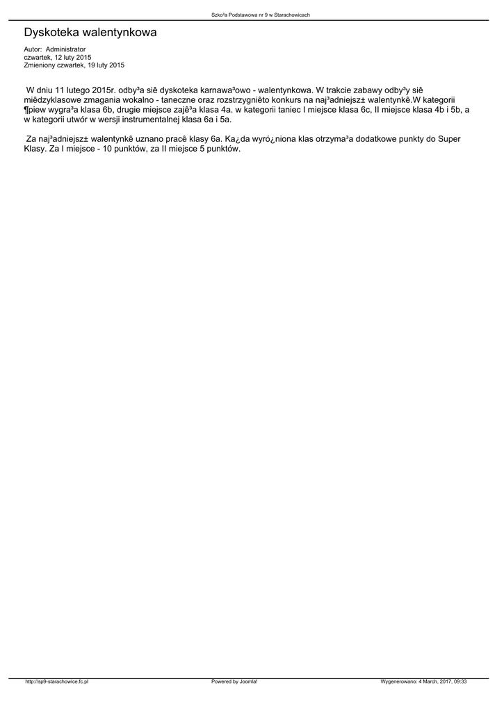 Szko³a Podstawowa nr 9 w Starachowicach Dyskoteka walentynkowa Autor: Administrator czwartek, 12 luty 2015 Zmieniony czwartek, 19 luty 2015 W dniu 11 lutego 2015r. odby³a siê dyskoteka karnawa³owo - walentynkowa. W trakcie zabawy odby³y siê miêdzyklasowe zmagania wokalno - taneczne oraz rozstrzygniêto konkurs na naj³adniejsz± walentynkê.W kategorii ¶piew wygra³a klasa 6b, drugie miejsce zajê³a klasa 4a. w kategorii taniec I miejsce klasa 6c, II miejsce klasa 4b i 5b, a w kategorii utwór w wersji instrumentalnej klasa 6a i 5a. Za naj³adniejsz± walentynkê uznano pracê klasy 6a. Ka¿da wyró¿niona klas otrzyma³a dodatkowe punkty do Super Klasy. Za I miejsce - 10 punktów, za II miejsce 5 punktów. http://sp9-starachowice.fc.pl Powered by Joomla! Wygenerowano: 4 March, 2017, 09:33