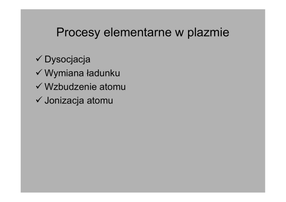 Procesy elementarne w plazmie Dysocjacja Wymiana ładunku Wzbudzenie atomu Jonizacja atomu Dysocjacja Cząsteczka gazu H2 O2 NO Wd [eV] 4,48 5,08 6,48 Cząsteczka gazu N2 CO CO2 Wd 9,76 11,11 16,56 WZBUDZENIE A + A → A + A* e + A → e + A* WZBUDZENIE j + A → j + A* + + hγ > eφw hγ+ A → A* JONIZACJA e + A → 2e + A+ A+ A → A+ + e m e v e2 = hν − eϕ j 2 hγ > eφj hγ+ A → A+ + e ZDERZENIA II RODZAJU A* + e → A+ + e (szybki) Jonizacja kumulatywna (schodkowa lub stopniowa) e + A → A* + e e + A* → A+ + e + e Energia jonizacji Pierwiastek H H2 N N2 O O2 Jednokrotna Pierwiastek Dwukrotna [eV] [eV] 13,6 15,4 14,5 15,8 13,6 12,5 Ar Kr Xe Ne Li K 15,7 14 12,1 21,6 5,39 5,14 Rekombinacja dn = ρne n j dt ∆n ρ= 2 ne ρ – [m3/s] ∆n - liczba jonów rekombinujących w 1s w 1 m3 REKOMBINACJA Rekombinacja z emisją promieniowania A* + e → A + hγ (10-14 – 10-13 cm3/s) Rekombinacja ze wzbudzeniem A+ + e → A** (10-12 cm3/s) Rekombinacja dysocjacyjna A+ + e → A* + A (10-8 cm3/s) Stan równowagi termodynamicznej długości czasu swobodnego przebiegu między kolejnymi zderzeniami, skuteczności przekazywania energii Czas relaksacji czas relaksacji – czas ustalenia się równowagi termodynamicznej, zderzenie elektron jon wodoru 1/1840, czas relaksacji 43 razy dłuŜszy. TEMPERATURA PLAZMY Brak równowagi termodynamicznej Równowaga termodynamiczna Ustalona temperatura elektronów Brak pojęcia temperatury RóŜna temperatura elektronów i jonów 0 τe τj τ ej Określona temperatura plazmy t [s] TEMPERATURA PLAZMY t <τe Nie istnieje pojęcie temperatury. τe < t <τ j MoŜna mówić tylko o temperaturze elektronów. τ j < t < τ ej t > τ ej Są dwie róŜne temperatury elektronów i jonów. Jest jedna określona temperatura plazmy. PLAZMA IZOTERMICZNA W = Wtrn + Wint Wint = Wrot + Wosc + We 1 1 2 1 3 3 3 2 2 meve + mjvj + movo = kTe + kTj + kTo 2 2 2 2 2 2 Te = Tj = To PLAZMA IZOTERMICZNA Równanie Saha 3 2 n e n j g e g j 2 π m e kT − eu j kT = e no go h2 ENERGIA ELEKTRONÓW I JONÓW W POLU ELEKTRYCZNYM W j = Eqλ j E - 1 2 λ j = a jt 2 Fj = E j q j = m j a j Eq aj = mj 1 Eq 2 (Eqt ) Wj = Eq t = 2 mj 2m j Fe = Eq= meae +- 2 ( Eqt ) We = 2me 2 ROZKŁAD PO ENERGII CZĄSTEK NAŁADOWANYCH W POLU ELEKTRYCZNYM Temperatura PLAZMA NIERÓWNOWAGOWA Tg Te Tj 10-1 101 102 Ciśnienie [Pa] 104 106