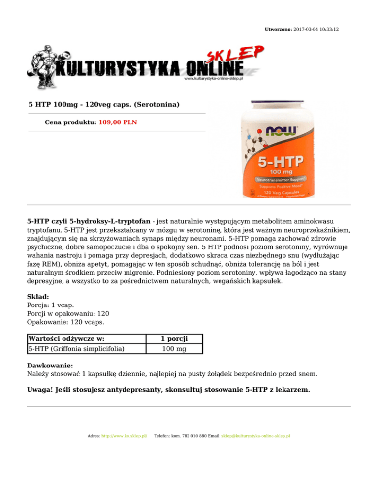 Utworzono: 2017-03-04 10:33:12 5 HTP 100mg - 120veg caps. (Serotonina) Cena produktu: 109,00 PLN 5-HTP czyli 5-hydroksy-L-tryptofan - jest naturalnie występującym metabolitem aminokwasu tryptofanu. 5-HTP jest przekształcany w mózgu w serotoninę, która jest ważnym neuroprzekaźnikiem, znajdującym się na skrzyżowaniach synaps między neuronami. 5-HTP pomaga zachować zdrowie psychiczne, dobre samopoczucie i dba o spokojny sen. 5 HTP podnosi poziom serotoniny, wyrównuje wahania nastroju i pomaga przy depresjach, dodatkowo skraca czas niezbędnego snu (wydłużając fazę REM), obniża apetyt, pomagając w ten sposób schudnąć, obniża tolerancję na ból i jest naturalnym środkiem przeciw migrenie. Podniesiony poziom serotoniny, wpływa łagodząco na stany depresyjne, a wszystko to za pośrednictwem naturalnych, wegańskich kapsułek. Skład: Porcja: 1 vcap. Porcji w opakowaniu: 120 Opakowanie: 120 vcaps. Wartości odżywcze w: 1 porcji 5-HTP (Griffonia simplicifolia) 100 mg Dawkowanie: Należy stosować 1 kapsułkę dziennie, najlepiej na pusty żołądek bezpośrednio przed snem. Uwaga! Jeśli stosujesz antydepresanty, skonsultuj stosowanie 5-HTP z lekarzem. Adres: http://www.ko.sklep.pl/ Telefon: kom. 782 010 880 Email: [email protected]