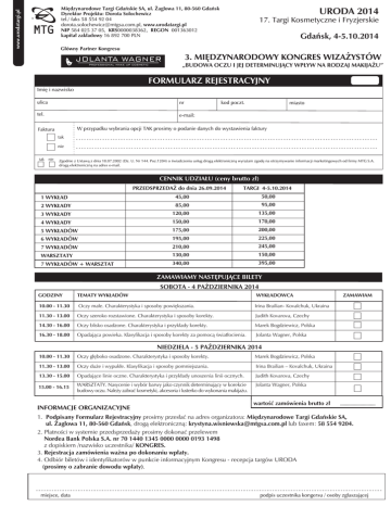 www.urodatargi.pl Międzynarodowe Targi Gdańskie SA, ul. Żaglowa 11, 80-560 Gdańsk Dyrektor Projektu: Dorota Solochewicz tel./ faks 58 554 92 04 [email protected], www.urodatargi.pl NIP 584 025 37 05, KRS0000038362, REGON 001363012 kapitał zakładowy 16 892 700 PLN URODA 2014 17. Targi Kosmetyczne i Fryzjerskie Gdańsk, 4-5.10.2014 Główny Partner Kongresu 3. MIĘDZYNARODOWY KONGRES WIZAŻYSTÓW „BUDOWA OCZU I JEJ DETERMINUJĄCY WPŁYW NA RODZAJ MAKIJAŻU” FORMULARZ REJESTRACYJNY Imię i nazwisko ulica nr tel. e-mail: kod poczt. miasto W przypadku wybrania opcji TAK prosimy o podanie danych do wystawienia faktury Faktura tak nie tak nie Zgodnie z Ustawą z dnia 18.07.2002 (Dz. U. Nr 144. Poz.1204) o świadczeniu usług drogą elektroniczną wyrażam zgodę na otrzymywanie informacji marketingowych od firmy MTG S.A. drogą elektroniczną na adres e-mail. CENNIK UDZIAŁU (ceny brutto zł) PRZEDSPRZEDAŻ do dnia 26.09.2014 TARGI 4-5.10.2014 1 WYKŁAD 45,00 50,00 2 WYKŁADY 85,00 95,00 3 WYKŁADY 120,00 135,00 4 WYKŁADY 150,00 170,00 5 WYKŁADÓW 175,00 200,00 6 WYKŁADÓW 195,00 225,00 7 WYKŁADÓW 210,00 245,00 WARSZTATY 130,00 150,00 7 WYKŁADÓW + WARSZTAT 340,00 395,00 ZAMAWIAMY NASTĘPUJĄCE BILETY SOBOTA - 4 PAŹDZIERNIKA 2014 GODZINY TEMATY WYKŁADÓW WYKŁADOWCA 10.00 - 11.30 Oczy małe. Charakterystyka i sposoby powiększania. Irina Brailian- Kovalchuk, Ukraina 11.30 - 13.00 Oczy szeroko rozstawione. Charakterystyka i sposoby korekty. Judith Kovarova, Czechy 14.30 - 16.00 Oczy blisko osadzone. Charakterystyka i przykłady korekty. Marek Bogdziewicz, Polska 16.30 - 18.00 Opadająca powieka. Klasyfikacja i sposoby korekty za pomocą światłocienia. Jolanta Wagner, Polska ZAMAWIAM NIEDZIELA - 5 PAŹDZIERNIKA 2014 10.00 - 11.30 Oczy głęboko osadzone. Charakterystyka i sposoby korekty. Marek Bogdziewicz, Polska 11.30 - 13.00 Oczy duże i wypukłe. Klasyfikacja i sposoby pomniejszania. Irina Brailian – Kovalchuk, Ukraina 13.30 - 15.00 Opadające linie oczne. Charakterystyka i przykłady unoszenia linii ocznych. Judith Kovarova, Czechy 15.00 - 16.15 WARSZTATY. Nasycenie i wybór barwy jako czynnik determinujący w korekcie budowy oczu. Należy zabrać kosmetyki, akcesoria i lusterko do wykonania makijażu. Jolanta Wagner, Polska INFORMACJE ORGANIZACYJNE wartość zamówienia brutto zł ............................ 1. Podpisany Formularz Rejestracyjny prosimy przesłać na adres organizatora: Międzynarodowe Targi Gdańskie SA, ul. Żaglowa 11, 80-560 Gdańsk, drogą elektroniczną: [email protected] lub faxem: 58 554 9204. 2. Płatności w systemie przedsprzedaży prosimy dokonać przelewem Nordea Bank Polska S.A. nr 70 1440 1345 0000 0000 0193 1498 z dopiskiem /nazwisko uczestnika/ KONGRES. 3. Rejestracja zamówienia ważna po dokonaniu wpłaty. 4. Odbiór biletów i identyfikatorów w punkcie informacyjnym Kongresu - recepcja targów URODA (prosimy o zabranie dowodu wpłaty). miejsce, data podpis uczestnika kongersu / osoby zgłaszającej