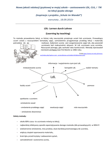 Nowa jakość edukacji językowej w mojej szkole – zastosowanie LDL, CLIL, i TIK na lekcji języka obcego (inspiracje z projektu „Schule im Wandel”) warsztaty , 18.09.2015r -------------------------------------------------------------------------------------------------------------------------------------- LDL- Lernen durch Lehren (Learning by teaching) To metoda prowadzenia lekcji, w której rolę nauczyciela przejmuje uczeń lub uczniowie. Prowadzący uczeń ustala z nauczycielem tematykę zajęć, samodzielnie przygotowuje przebieg lekcji i materiały potrzebne do jej realizacji. Zadaniem ucznia jest zorganizowanie zajęć tak, aby pozostali uczniowie byli maksymalnie aktywni. W LdL uczniowie uczą uczniów. Nauczyciel pomaga, gdy zachodzi taka konieczność. Metodę wprowadził niemiecki pedagog Jean Pol-Martin w 1982 roku. Źródło:http://www.ore.edu.pl/stronaore/index.php?option=com_content&view=article&id=941&Itemid=1313 informacja i wyjaśnienie czym jest LdL motywowanie ucznia konspekt LdL wybór tematu LdL każdy uczeń pomoce spotkanie z uczniem: -omówienie zasad - omówienie przebiegu zajęć ewaluacja zajęć rola nauczyciela - omówienie słownictwa Zalety metody: − około 80% czasu- to uczniowie mówią na lekcji, − najbardziej efektywny sposób zapamiętywania danego mateiału (dla prowadzących)- w 90%!!! − wielostronne omówienie, inny przekaz, dużo bardziej przemawiający do uczniów, − większy stopień opanowania materiału, − brak lęku przed krytyką i zadawaniem pytań, − samodzielność i autonomia ucznia, − analiza informacji i krytyczne, kreatywne myślenie, − wzrost motywacji uczniów do nauki, − rozwój kompetencji kluczowych, − dowartościowanie uczniów oraz wzrost ich zaangażowania, − rozwijanie komunikacji społecznej i większa samodzielność w załączeniu: - linki dot. Ldl: https://docs.google.com/file/d/0B_sN9sCPdrrjLV9taExzRUpIR2c/edit?pli=1 http://www.ldl.de/ http://ldl.mixxt.de/ http://www.edunews.pl/nowoczesna-edukacja/innowacje-w-edukacji/2178-ldl-czyli-uczenie-sie-poprzeznauczanie http://www.goethe.de/ges/spa/prj/sog/mud/pl3913352.htm https://www.youtube.com/watch?v=0PYlUXfSabE LdL - 1.44 min. do 3.42 http://www.ore.edu.pl/index.php?option=com_content&view=article&id=941&Itemid=1313 CLIL Content and Language Integrated Learning CLIL – przełomowe podejście w edukacji europejskiej. W Polsce termin CLIL tłumaczony jest jako „zintegrowane kształcenie przedmiotowo - językowe” (EURYDICE, 2006), „zintegrowane uczenie treści przedmiotowych i językowych” (Profile Report , 2008) oraz „nauczanie dwujęzyczne/bilingwalne” (Roda, 2007; Dzięgielewska, 2008). W programach nauczania języka obcego funkcjonuje określenie „integracja międzyprzedmiotowa”. Problemem jest jednak nie tylko różnorodność terminologiczna. Różnorodne są także definicje pojęcia CLIL, np.: • „CLIL dotyczy tych sytuacji, w których przedmioty lub ich części nauczane są poprzez język obcy, a cele nauczania są dwojakie: uczenie się przedmiotu i równoczesne uczenie się języka obcego” (Marsh, 1994), • „CLIL to użycie języków, których uczymy się podczas nauki innych przedmiotów” (Lang, 2002), • „CLIL to integracja języka z treściami niejęzykowymi w środowisku nauczania o dwojakich celach (Marsh, 2002). 1. CLIL nie jest tylko podejściem do nauczania języków obcych. 2. CLIL odnosi się zarówno do kształcenia przedmiotowego, jak i językowego. 3. CLIL nie odnosi się do wszystkich przedmiotów nauczanych w szkole. 4. CLIL dotyczy różnych języków jako języków docelowych. Głównym celem jest uczenie treści przedmiotowych, a cele językowe wynikają z treści przedmiotowych. Nadrzędne są cele poznawcze, a język służy osiąganiu celów i jest tylko narzędziem. CLIL prowadzony jest w min. 3 modułach. Przy wyborze podejścia metodycznego należy kierować się specyfiką nauczanego przedmiotu i pod tym kątem przygotowywać odpowiednie ćwiczenia. Zakres użycia języka podczas zajęć CLIL obejmuje od 25%- 75%. CLIL opiera sie na 4 filarach : content- zawartość, nauczany materiał z danego przedmiotu, communication- komunikacja w obcym języku w celu przekazania informacji/umiejętności językowe potrzebne do nauki w języku obcym, cognition - poznanie i zrozumienie/umiejętności logicznego myślenia i rozwiązywania problemu, cultureelementy kulturowe zawarte w nauczaniu dwujęzycznym (TRÓJKĄT BILINGWALNY) Strony ORE z zeszytami do zajęć CLIL: 1. http://www.ore.edu.pl/index.php?option=com_phocadownload&view=category&id=32:nauczanie -dwujzyczne&Itemid=1063 2. 2. https://www.teachingenglish.org.uk/teaching-teens/resources/clil 3. 3. www.cambridge.org/elt/clil – strona z materiałami dla anglistów 4. 4. http://supersimplelearning.com- strona z materiałami dla anglistów w załączeniu: - linki dot. CLIL: http://www.ore.edu.pl/wrkj-materialy-do-pobrania/category/32-nauczaniedwujezyczne?download=1967:zintgrowane-nauczanie-przedmiotowo-jzykowe-na-i-etapie-edukacyjnymscenariusze-lekcji (scenariusze 6/7 lat-j.angielski) http://www.britishcouncil.org/europe/our-work-in-europe/content-and-language-integrated-learning-clil (opis) http://www.goethe.de/lhr/prj/usg/deindex.htm http://www.ore.edu.pl/strona-ore/index.php?option=com_content&view=article&id=529:zintegrowanenauczanie-przedmiotowo-jzykowe&catid=14:edukacja-jezykowa&Itemid=1056 http://issuu.com/robert.kolebuk/docs/clil/5?e=3911676/2998644 TIK NARZĘDZIA: http://animoto.com/ – stwórz 30-sekundowy filmik ze zdjęć http://www.voki.com – strona do tworzenia mówiacych AWATARóW http://pl.padlet.com/mwalkow41/kbx1jfyp83 – PADELT SUPERBELFRÓW https://www.storyboardthat.com/ www. learningapps.org - gotowe interaktywne gry i ćwiczenia (z opcją tworzenia swoich) www.fotobabble.com - tworzenie mówiących obrazków http://www.jigsawplanet.com/ – tworzenie interaktywnych puzzli http://www.wordle.net/ – tworzenie chmur
