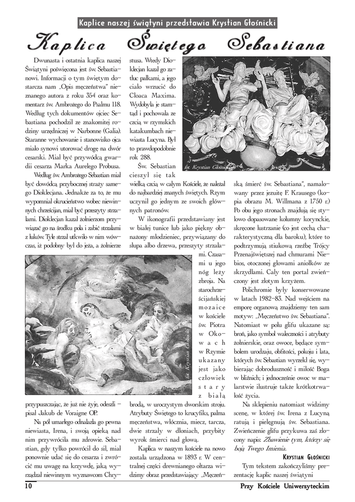 K aplice naszej wi¹tyni przedstawia Krystian G³onicki K a p li c a wiêt eg o Sebas ti ana stusa. Wtedy Dioklecjan kaza³ go zat³uc pa³kami, a jego cia³o wrzuciæ do Cloaca Maxima. Wydoby³a je stamt¹d i pochowa³a ze czci¹ w rzymskich katakumbach niewiasta Lucyna. By³ to prawdopodobnie rok 288. w. Sebastian fot. Krystian G³onicki cieszy³ siê tak wielk¹ czci¹ w ca³ym Kociele, ¿e nale¿a³ do najbardziej znanych wiêtych. Rzym uczyni³ go jednym ze swoich g³ównych patronów. W ikonografii przedstawiany jest w bia³ej tunice lub jako piêkny obna¿ony m³odzieniec, przywi¹zany do s³upa albo drzewa, przeszyty strza³ami. Czasami u jego nóg le¿y zbroja. Na starochrzecijañskiej m o z a ic e w kociele w. Piotra w Okow a c h w Rzymie ukazany jest jako cz³owiek s t a r y z bia³¹ brod¹, w uroczystym dworskim stroju. Atrybuty wiêtego to krucyfiks, palma mêczeñstwa, w³ócznia, miecz, tarcza, dwie strza³y w d³oniach, przybity wyrok mierci nad g³ow¹. Kaplica w naszym kociele na nowo zosta³a urz¹dzona w 1893 r. W centralnej czêci drewnianego o³tarza widzimy obraz przedstawiaj¹cy Mêczeñfot. Krystian G³onicki Dwunasta i ostatnia kaplica naszej wi¹tyni powiêcona jest w. Sebastianowi. Informacji o tym wiêtym dostarcza nam Opis mêczeñstwa nieznanego autora z roku 354 oraz komentarz w. Ambro¿ego do Psalmu 118. Wed³ug tych dokumentów ojciec Sebastiana pochodzi³ ze znakomitej rodziny urzêdniczej w Narbonne (Galia). Staranne wychowanie i stanowisko ojca mia³o synowi utorowaæ drogê na dwór cesarski. Mia³ byæ przywódc¹ gwardii cesarza Marka Aurelego Probusa. Wed³ug w. Ambro¿ego Sebastian mia³ byæ dowódc¹ przybocznej stra¿y samego Dioklecjana. Jednak¿e za to, ¿e mu wypomnia³ okrucieñstwo wobec niewinnych chrzecijan, mia³ byæ przeszyty strza³ami. Dioklecjan kaza³ ¿o³nierzom przywi¹zaæ go na rodku pola i zabiæ strza³ami z ³uków. Tyle strza³ utkwi³o w nim wówczas, i¿ podobny by³ do je¿a, a ¿o³nierze przypuszczaj¹c, ¿e ju¿ nie ¿yje, odeszli pisa³ Jakub de Voraigne OP. Na pó³ umar³ego odnalaz³a go pewna niewiasta, Irena, i swoj¹ opiek¹ nad nim przywróci³a mu zdrowie. Sebastian, gdy tylko powróci³ do si³, mia³ ponownie udaæ siê do cesarza i zwróciæ mu uwagê na krzywdê, jak¹ wyrz¹dza³ niewinnym wyznawcom Chry10 sk¹ mieræ w. Sebastiana, namalowany przez jezuitê F. Krausego (kopia obrazu M. Willmana z 1750 r.) Po obu jego stronach znajduj¹ siê stylowo dopasowane kolumny korynckie, skrêcone lustrzanie (co jest cech¹ charakterystyczn¹ dla baroku), które to podtrzymuj¹ stiukow¹ rzebê Trójcy Przenajwiêtszej nad chmurami Niebios, otoczonej g³owami anio³ków ze skrzyd³ami. Ca³y ten portal zwieñczony jest z³otym krzy¿em. Polichromie by³y konserwowane w latach 1982-83. Nad wejciem na emporê organow¹ znajdziemy ten sam motyw: Mêczeñstwo w. Sebastiana. Natomiast w polu glifu ukazane s¹: broñ, jako symbol walecznoci i atrybuty ¿o³nierskie, oraz owoce, bêd¹ce symbolem urodzaju, obfitoci, pokoju i lata, których w. Sebastian wyrzek³ siê, wybieraj¹c dobrodusznoæ i mi³oæ Boga w blinich; i jednoczenie owoc w malarstwie ilustruje tak¿e krótkotrwa³oæ ¿ycia. Na sklepieniu natomiast widzimy scenê, w której w. Irena z Lucyn¹ ratuj¹ i pielêgnuj¹ w. Sebastiana. Zwieñczenie glifu przykuwa za z³ocony napis: Zbawienie tym, którzy siê boj¹ Twego Imienia. K R YSTIAN G £ONICKI Tym tekstem zakoñczylimy prezentacjê kaplic naszej wi¹tyni Pr zy K oci el niw ersyt eckim Przy Koci ociel elee U Uniw niwersyt ersyteckim