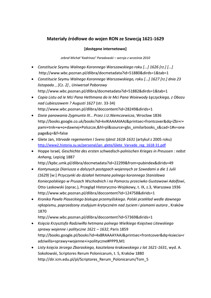 Materiały źródłowe do wojen RON ze Szwecją 1621-1629 [dostępne internetowo] zebrał Michał ‘Kadrinazi’ Paradowski – wersja z września 2010 Constitucie Seymu Walnego Koronnego Warszawskiego roku [...] 1626 [rz.] [...] http://www.wbc.poznan.pl/dlibra/docmetadata?id=51880&dirds=1&tab=1 Constitucie Seymu Walnego Koronnego Warszawskiego, roku [...] 1627 [rz.] dnia 23 listopada. , *Cz. 2+ , Uniwersał Poborowy http://www.wbc.poznan.pl/dlibra/docmetadata?id=51882&dirds=1&tab=1 Copia Listu od Ie Mci Pana Hethmana do Ie Mci Pana Woiewody Łęczyckiego, z Obozu nad Lubieszowem ? Augusti 1627 (str. 33-34) http://www.wbc.poznan.pl/dlibra/doccontent?id=28249&dirids=1 Dzeie panowania Zygmunta III… Przez J.U.Niemczewicza, Wrocław 1836 http://books.google.co.uk/books?id=kvIKAAAAIAAJ&printsec=frontcover&dq=Zbi+r+ pami+tnik+w+o+dawnej+Polszcze,&hl=pl&source=gbs_similarbooks_s&cad=1#v=one page&q=&f=false Glete Jan, Värvade regementen I Svens tjänst 1618-1631 (artykuł z 2005 roku) http://www2.historia.su.se/personal/jan_glete/Glete_Varvade_reg_1618-31.pdf Hoppe Israel, Geschichte des ersten schwedisch-polnischen Krieges in Preussen : nebst Anhang, Lepizig 1887 http://kpbc.umk.pl/dlibra/docmetadata?id=22299&from=pubindex&dirids=49 Kontynuacja Diariusza o dalszych postępach wojennych ze Szwedami a die 1 Julii (1629) [w:] Przyczynki do działao hetmana polnego koronnego Stanisława Koniecpolskiego w Prusach Wschodnich i na Pomorzu przeciwko Gustawowi Adolfowi, Otto Laskowski (oprac.), Przegląd Historyczno-Wojskowy, t. IX, z.3, Warszawa 1936 http://www.wbc.poznan.pl/dlibra/doccontent?id=124758&dirids=1 Kronika Pawła Piaseckiego biskupa przemyślskiego. Polski przekład wedle dawnego rękopismu, poprzedzony studyjum krytyczném nad życiem i pismami autora , Kraków 1870 http://www.wbc.poznan.pl/dlibra/doccontent?id=57369&dirids=1 Księcia Krzysztofa Radziwiłła hetmana polnego Wielkiego Księstwa Litewskiego sprawy wojenne i polityczne 1621 – 1632, Paris 1859 http://books.google.pl/books?id=4x8RAAAAYAAJ&printsec=frontcover&dq=ksiecia+r adziwilla+sprawy+wojenne+i+polityczne#PPP9,M1 Listy księcia Jerzego Zbaraskiego, kasztelana krakowskiego z lat 1621-1631, wyd. A. Sokołowski, Scriptores Rerum Polonicarum, t. 5, Kraków 1880 http://dir.icm.edu.pl/pl/Scriptores_Rerum_Polonicarum/Tom_5 Listy Władysława IV do Krzysztofa Radziwiłła hetmana polnego litewskiego 16121632, wyd. A. Muchlioski, Kraków 1867 http://www.polona.pl/dlibra/doccontent?id=4282&from=FBC Mankell Julius, Arkiv till upplysning om svenska krigens och krigsinrättningarnes historia - trzy tomowy zbiór dokumentów z okresu 1629-1632, Vol. I, Stockholm 1854, http://books.google.com/books?id=x0cCAAAAYAAJ&dq=julius+mankell+arkiv&lr=&hl =sv&source=gbs_summary_s&cad=0 Mankell Julius, Uppgifter rörande svenska krigsmagtens styrka, sammansättning och fördelning sedan slutet af femtonhundratalet, Stockholm 1865 http://books.google.co.uk/books?id=5uZBAAAAIAAJ&printsec=frontcover&dq=Uppgifter+r% C3%B6rande+svenska+krigsmagtens+styrka,+sammans%C3%A4ttning+och+f%C3%B6rdelning +sedan+slutet+af+femtonhundratalet&source=bl&ots=0WUrOhGYh&sig=hjwyh9KLR9LdiwCm4qAgczqOYek&hl=pl&ei=oL6bTK3RIIHNjAeakLT4CQ&sa=X& oi=book_result&ct=result&resnum=2&ved=0CBcQ6AEwAQ#v=onepage&q&f=false Pamiętniki do panowania Zygmunta III, Władysława IV i Jana Kazimierza z rękopismu wydał K. W. Woycicki, Warszawa 1864 http://www.wbc.poznan.pl/dlibra/publication?id=55945&from=&dirids=1&tab=1&lp =25&QI=6854DE2CC7A4DF63ADE5CC6D63F92867-8 Petitia do Krola Ie Mości Od woyska w Prusiech na służbie J W M będącego… (str.1418) http://www.wbc.poznan.pl/dlibra/doccontent?id=28249&dirids=1 Przyłęcki Stanisław, Pamiętniki o Koniecpolskich : przyczynek do dziejów polskich XVII wieku, Lwów 1842 http://pbc.biaman.pl/dlibra/docmetadata?id=1686&from=pubindex&dirids=21 Relacja bitwy Trzciaoskiej, posłana od J.Mci P. Hetmana (Stanisława Koniecpolskiego). Pod Nową Wsią, 26 Junii 1629 [w:] Przyczynki do działao hetmana polnego koronnego Stanisława Koniecpolskiego w Prusach Wschodnich i na Pomorzu przeciwko Gustawowi Adolfowi, Otto Laskowski (oprac.), Przegląd Historyczno-Wojskowy, t. IX, z.3, Warszawa 1936 http://www.wbc.poznan.pl/dlibra/doccontent?id=124758&dirids=1 Relacja IMP. Wojewody Sendomirskiego, Hetmana Polnego Koronnego, o wojnie przeszłego roku w Warszawie, dnia 4 Februari 1629, uczyniona [w:] Przyczynki do działao hetmana polnego koronnego Stanisława Koniecpolskiego w Prusach Wschodnich i na Pomorzu przeciwko Gustawowi Adolfowi, Otto Laskowski (oprac.), Przegląd Historyczno-Wojskowy, t. IX, z.3, Warszawa 1936 http://www.wbc.poznan.pl/dlibra/doccontent?id=124758&dirids=1 Rikskansleren Axel Oxenstiernas skrifter och brefvexling (instrukcje Gustawa II Adolfa, okres 1612-1632) http://www.archive.org/stream/rikskanslerenax00styfgoog#page/n6/mode/1up Rikskansleren Axel Oxenstiernas skrifter och brefvexling (okres 1625-1627) http://www.archive.org/details/rikskanslerenax00akadgoog Staszewski Janusz, Bitwa pod Trzcianą *w:+ Przegląd Historyczno-Wojskowy, t. IX, z.3, 1937 http://www.wbc.poznan.pl/dlibra/doccontent?id=124758&dirids=1 Szelągowski Adam, O ujście Wisły. Wielka wojna pruska, Kraków 1905 http://www.wbc.poznan.pl/dlibra/docmetadata?id=3193&dirds=1&tab=1 Żurkowski Stanisław, Żywot Tomasza Zamojskiego, Lwów 1860 http://books.google.com/books?id=3VIAAAAYAAJ&printsec=frontcover&dq=Żywot+Tomasza+Zamoyskiego&hl=pl&ei=ek mGTJqdNcOGswb3gcmaBQ&sa=X&oi=book_result&ct=result&resnum=1&ved=0CCc Q6AEwAA#v=onepage&q&f=false