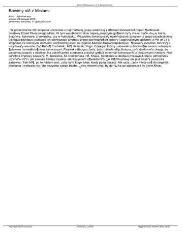 Szko³a Podstawowa nr 9 w Starachowicach Bawimy siê z Misiami Autor: Administrator wtorek, 29 listopad 2016 Zmieniony niedziela, 11 grudzieñ 2016 W poniedzia³ek 28 listopada uczniowie z najm³odszej grupy wiekowej z „Dziewi±tki” ¶wiêtowali ¦wiatowy Dzieñ Pluszowego Misia. W tym wyj±tkowym dniu najwa¿niejszymi go¶æmi by³y misie: ma³e, du¿e, bia³e, br±zowe, kolorowe, z kokardk±, czy w kubraczku. Wszystkie towarzyszy³y najm³odszym dzieciom z grupy przedszkolnej 0”b” podczas ich pierwszego wystêpu przed spo³eczno¶ci± szko³y i zaproszonymi go¶æmi z PM nr 2 i 6. Wspólnie ze starszymi uczniami uczêszczaj±cymi na zajêcia „Bajkoterapi” ¶piewa³y piosenki, tañczy³y i recytowa³y wiersze. By³ Kubu¶ Puchatek, Mi¶ Uszatek, Yogi i Coralgol, którzy zabawiali publiczno¶æ swoim radosnym ¶piewem i umiejêtno¶ciami tanecznymi. Piosenka „Jad±, jad± misie…” by³a doskona³± okazj± do wspólnej zabawy z misiami. Na zakoñczenie spotkania przybyli go¶cie otrzymali kolorowanki z pluszowymi misiami. Nad ca³o¶ci± imprezy czuwa³y: M. Dulewicz, M. Dziekoñska i M. Krupa. Spotkanie w „misiowej” atmosferze up³ynê³o mi³o i jak zawsze bardzo szybko, ale wszystkim u¶wiadomi³o, ¿e Mi¶ Pluszowy nie jest zwyk³± pluszow± zabawk±. Taki Mi¶, po to misiem jest, ¿eby by³o kogo tuliæ, kiedy pada deszcz. Ma uszy, ¿eby mieæ co¶ do targania, kochania i wytarcia ³ez. Ma wszystko czego trzeba, ¿eby misiem byæ, by do ³ó¿ka go zabieraæ i by o nim ¶niæ. http://sp9-starachowice.fc.pl Powered by Joomla! Wygenerowano: 4 March, 2017, 09:33