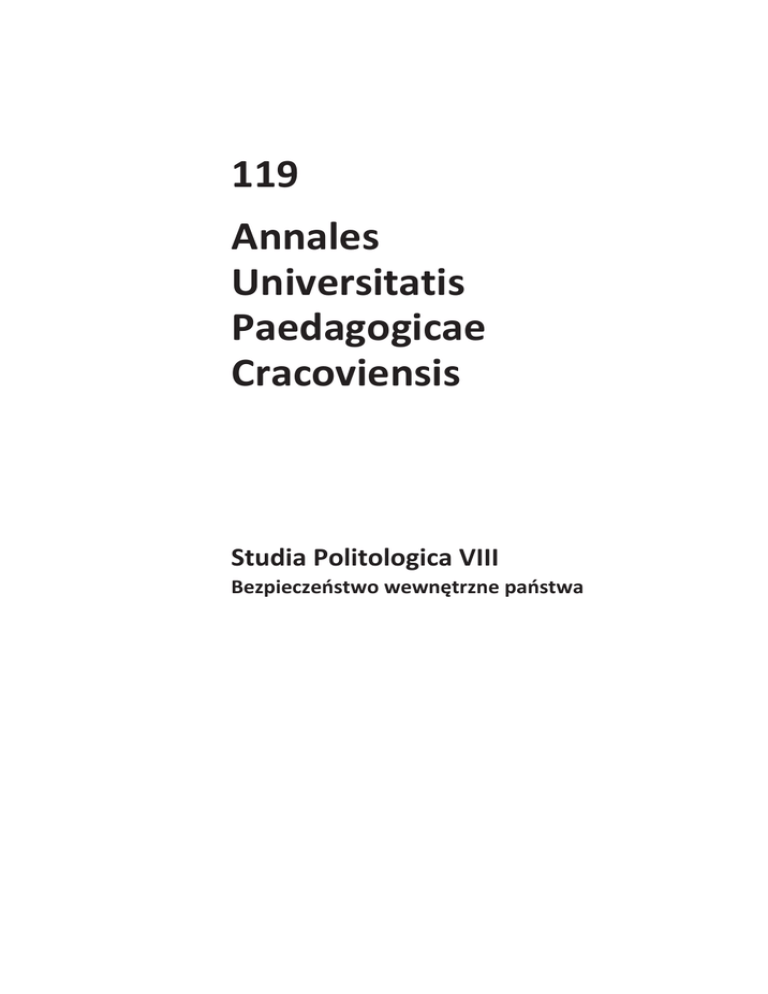 119 Annales Universitatis Paedagogicae Cracoviensis Studia Politologica VIII Bezpieczeństwo wewnętrzne państwa Rada Naukowa prof. dr hab. Julian Babula – Wyższa Szkoła Bezpieczeństwa i Ochrony w Warszawie prof. dr hab. Andrzej Jaeschke – Uniwersytet Pedagogiczny w Krakowie dr hab. Andrzej Kozera, prof. UP w Krakowie prof. dr hab. Petro Sauch – Kijowski Instytut Biznesu i Technologii (Ukraina) dr Irina Sauch – Kijowski Instytut Biznesu i Technologii (Ukraina) prof. dr hab. Michał Śliwa – Uniwersytet Pedagogiczny w Krakowie prof. dr hab. Eugeniusz Zieliński – Uniwersytet Warszawski dr hab. Jacek Zieliński, prof. UPH w Siedlcach prof. dr hab. Marek Żmigrodzki – UMCS w Lublinie dr hab. Andrzej Żebrowski, prof. UP w Krakowie (przewodniczący) Komitet Wydawniczy dr hab. Marek Ilnicki, prof. AH – Akademia Humanistyczna w Pułtusku dr hab. Andrzej Żebrowski, prof. UP w Krakowie dr Karol Bieniek – Uniwersytet Pedagogiczny w Krakowie dr Robert Kłaczyński – Uniwersytet Pedagogiczny w Krakowie dr Łukasz Kozera – Uniwersytet Pedagogiczny w Krakowie Redaktor wydania dr hab. Andrzej Żebrowski, prof. UP w Krakowie © Copyright by Wydawnictwo Naukowe UP, Kraków 2012 ISSN 2081-3333 Wydawnictwo Naukowe UP Redakcja/Dział Promocji 30-084 Kraków, ul. Podchorążych 2 tel./faks 12 662-63-83, tel. 12 662-67-56 e-mail: [email protected] Zapraszamy na stronę internetową: http://www.wydawnictwoup.pl druk i oprawa Zespół Poligraficzny UP, zam. 72/12 Słowo wstępne Położenie geostrategiczne Polski po wyjściu z Układu Warszawskiego i Rady Wzajemnej Pomocy Gospodarczej uległo zasadniczej zmianie, co bezpośrednio przełożyło się na jej bezpieczeństwo wewnętrzne i zewnętrzne. Każde państwo – co dotyczyło również Polski – musiało poszukiwać racjonalnych rozwiązań dotyczących jego bezpieczeństwa wewnętrznego i obronności. W latach dziewięćdziesiątych ubiegłego wieku miały miejsce poważne przewartościowania w mentalności elit politycznych dotyczące kształtu bezpieczeństwa nie tylko narodowego, ale i międzynarodowego. To również początek poszukiwania miejsca Polski w zachodnioeuropejskim systemie bezpieczeństwa wojskowego i gospodarczego. Wytyczonymi celami strategicznymi były członkostwo w Sojuszu Północnoatlantyckim i Unii Europejskiej, które stały się faktem w 1999 i 2004 roku. Współczesne środowisko bezpieczeństwa międzynarodowego to szanse i zagrożenia, które zmieniają otoczenie wewnętrzne każdego państwa. To również konieczność przebudowy systemu bezpieczeństwa zewnętrznego i wewnętrznego państwa. Należy również pamiętać o tym, że istotny wpływ na stan naszego bezpieczeństwa ma wszechobecna globalizacja wraz ze swoimi konsekwencjami pozytywnymi i negatywnymi. Globalizacja, która ma zarówno zwolenników, jak i przeciwników, jest negatywnie oceniana w aspekcie szeroko rozumianego bezpieczeństwa wewnętrznego państwa. Przynależność Polski do europejskich organizacji międzynarodowych, zaangażowanie w operacje humanitarne poza granicami kraju, a także istniejące zagrożenia mają istotny wpływ na jej bezpieczeństwo wewnętrzne. Okres przemian ustrojowych i towarzyszące im procesy zmieniły nasze postrzeganie bezpieczeństwa. Bezpieczeństwo wewnętrzne ma szczególne znaczenie dla każdego państwa, w tym i dla Polski, która leżąc na wschodniej rubieży NATO i Unii Europejskiej, styka się bezpośrednio z wieloma zagrożeniami. Uwarunkowania te sprawiają, że bezpieczeństwo wewnętrzne Polski ma istotny wpływ na jej rozwój. Skuteczne realizowanie zadań związanych z bezpieczeństwem wewnętrznym państwa wymaga profesjonalnie przygotowanej kadry na wszystkich poziomach kierowania bezpieczeństwem państwa. Instytut Politologii Uniwersytetu Pedagogicznego im. Komisji Edukacji Narodowej w Krakowie z myślą o potrzebach tego sektora bezpieczeństwa państwa w roku akademickim 2012/2013 uruchamia kierunek: bezpieczeństwo wewnętrzne państwa. Uważamy, że pozwoli to młodym ludziom na uzyskanie atrakcyjnego wykształcenia w tak ważnym obszarze, jakim jest bezpieczeństwo wewnętrzne państwa. Nowe kadry będą miały możliwość podjęcia pracy zawodowej w instytucjach zajmujących się tą problematyką zarówno w administracji rządowej, jak i samorządowej. Andrzej Jaeschke Wprowadzenie Przemiany polityczne i społeczne zapoczątkowane na przełomie lat osiemdziesiątych i dziewięćdziesiątych XX wieku spowodowały znaczne zawirowania w zakresie bezpieczeństwa międzynarodowego i narodowego. Zmieniły one również podejście do kwestii bezpieczeństwa państwa i jego zagrożeń. Funkcją bezpieczeństwa jest już nie tylko zapewnienie przetrwania, ale także ochrona dobrobytu i swobodnego stylu bycia, swobód i tożsamości narodowej, religijnej, etnicznej itd.1 Procesy związane z poszukiwaniem nowych racjonalnych rozwiązań w zakresie bezpieczeństwa zewnętrznego i wewnętrznego państwa wymagają interdyscyplinarnego i wieloaspektowego podejścia. Współczesne środowisko bezpieczeństwa narodowego i międzynarodowego to miejsce istotnych przewartościowań w życiu społecznym, mentalności ludności i wzrostu zagrożeń o charakterze asymetrycznym. Oznacza to, że rozpatrywanie bezpieczeństwa państwa wyłącznie w kategoriach wojskowych i realizacji polityki zagranicznej jest dużym uproszczeniem. Zachowaniem państw w środowisku międzynarodowym rządzą dwa dążenia pierwotne, które odzwierciedlają podstawowe interesy narodowe2: – wola przetrwania, zachowania odrębnego istnienia i tożsamości, co w kategoriach bezpieczeństwa oznacza obronę suwerenności i integralności terytorialnej, – dążenie do rozwoju własnej potęgi, niekoniecznie wojskowej, i nie tylko w stosunku do innych państw. Obecnie bezpieczeństwo odnosi się do wszystkich obszarów rozwoju: politycznego, społecznego, demograficznego, gospodarczego, żywnościowego, zasobów su