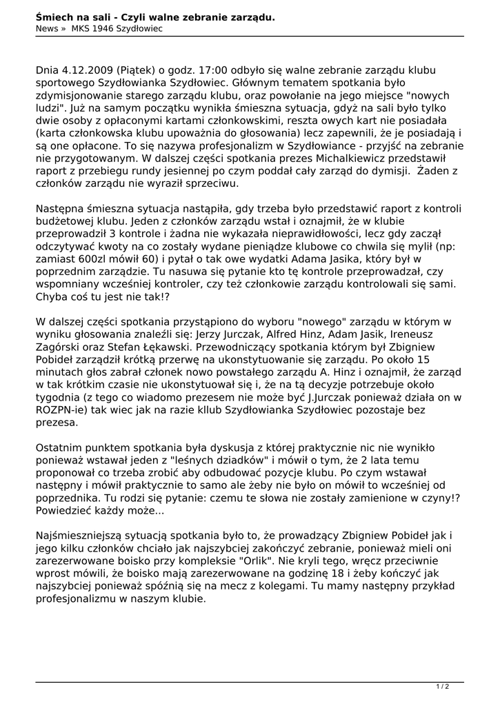 Śmiech na sali - Czyli walne zebranie zarządu. News » MKS 1946 Szydłowiec Dnia 4.12.2009 (Piątek) o godz. 17:00 odbyło się walne zebranie zarządu klubu sportowego Szydłowianka Szydłowiec. Głównym tematem spotkania było zdymisjonowanie starego zarządu klubu, oraz powołanie na jego miejsce "nowych ludzi". Już na samym początku wynikła śmieszna sytuacja, gdyż na sali było tylko dwie osoby z opłaconymi kartami członkowskimi, reszta owych kart nie posiadała (karta członkowska klubu upoważnia do głosowania) lecz zapewnili, że je posiadają i są one opłacone. To się nazywa profesjonalizm w Szydłowiance - przyjść na zebranie nie przygotowanym. W dalszej części spotkania prezes Michalkiewicz przedstawił raport z przebiegu rundy jesiennej po czym poddał cały zarząd do dymisji. Żaden z członków zarządu nie wyraził sprzeciwu. Następna śmieszna sytuacja nastąpiła, gdy trzeba było przedstawić raport z kontroli budżetowej klubu. Jeden z członków zarządu wstał i oznajmił, że w klubie przeprowadził 3 kontrole i żadna nie wykazała nieprawidłowości, lecz gdy zaczął odczytywać kwoty na co zostały wydane pieniądze klubowe co chwila się mylił (np: zamiast 600zl mówił 60) i pytał o tak owe wydatki Adama Jasika, który był w poprzednim zarządzie. Tu nasuwa się pytanie kto tę kontrole przeprowadzał, czy wspomniany wcześniej kontroler, czy też członkowie zarządu kontrolowali się sami. Chyba coś tu jest nie tak!? W dalszej części spotkania przystąpiono do wyboru "nowego" zarządu w którym w wyniku głosowania znaleźli się: Jerzy Jurczak, Alfred Hinz, Adam Jasik, Ireneusz Zagórski oraz Stefan Łękawski. Przewodniczący spotkania którym był Zbigniew Pobideł zarządził krótką przerwę na ukonstytuowanie się zarządu. Po około 15 minutach głos zabrał członek nowo powstałego zarządu A. Hinz i oznajmił, że zarząd w tak krótkim czasie nie ukonstytuował się i, że na tą decyzje potrzebuje około tygodnia (z tego co wiadomo prezesem nie może być J.Jurczak ponieważ działa on w ROZPN-ie) tak wiec jak na razie kllub Szydłowianka Szydłowiec pozostaje bez prezesa. Ostatnim punktem spotkania była dyskusja z której praktycznie nic nie wynikło ponieważ wstawał jeden z "leśnych dziadków" i mówił o tym, że 2 lata temu proponował co trzeba zrobić aby odbudować pozycje klubu. Po czym wstawał następny i mówił praktycznie to samo ale żeby nie było on mówił to wcześniej od poprzednika. Tu rodzi się pytanie: czemu te słowa nie zostały zamienione w czyny!? Powiedzieć każdy może... Najśmieszniejszą sytuacją spotkania było to, że prowadzący Zbigniew Pobideł jak i jego kilku członków chciało jak najszybciej zakończyć zebranie, ponieważ mieli oni zarezerwowane boisko przy kompleksie "Orlik". Nie kryli tego, wręcz przeciwnie wprost mówili, że boisko mają zarezerwowane na godzinę 18 i żeby kończyć jak najszybciej ponieważ spóźnią się na mecz z kolegami. Tu mamy następny przykład profesjonalizmu w naszym klubie. 1/2 Śmiech na sali - Czyli walne zebranie zarządu. News » MKS 1946 Szydłowiec Według mnie zebranie to w ogóle nie miało sensu, ponieważ wiele pytań było kierowane do urzędu miasta lecz żaden z przedstawicieli nie pojawił się na sali konferencyjnej. Były to pytania tyczące się targowicy przy ul. Wschodniej jak i pomocy pieniężnej od miasta, która podobno była obiecywana. Z tego co wiadomo władze miasta wolały tańczyć przy Szydłowieckim rynku z dziećmi (festyn mikołajkowy dla dzieci) niż pojawić się na zebraniu. Jeden z członków nowego zarządu oznajmił, że jeżeli burmistrz miasta odda Szydłowiance targowice nasza drużyna będzie w stanie grać w III lidze. Czy doczekamy się takiej sytuacji, że nasza drużyna wreszcie zagra w III lidze czas pokażę... Autor: M.S.G 2/2 Powered by TCPDF (www.tcpdf.org)