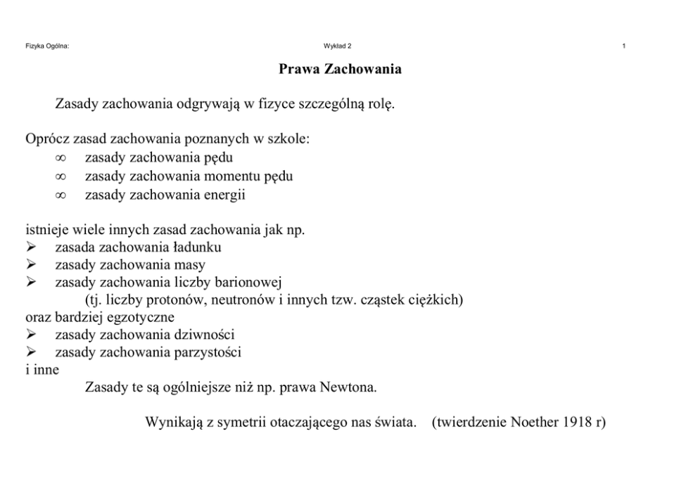 Fizyka Ogólna: Wyk»ad 2 1 Prawa Zachowania Zasady zachowania odgrywaj w fizyce szczególn rol“. Oprócz zasad zachowania poznanych w szkole: • zasady zachowania p“du • zasady zachowania momentu p“du • zasady zachowania energii istnieje wiele innych zasad zachowania jak np. zasada zachowania »adunku zasady zachowania masy zasady zachowania liczby barionowej (tj. liczby protonów, neutronów i innych tzw. czstek ci“ókich) oraz bardziej egzotyczne zasady zachowania dziwnoÑci zasady zachowania parzystoÑci i inne Zasady te s ogólniejsze nió np. prawa Newtona. Wynikaj z symetrii otaczajcego nas Ñwiata. (twierdzenie Noether 1918 r) Fizyka Ogólna: Wyk»ad 2 2 Zasada zachowania p“du II zasada dynamiki Newtona dla ruchu post“powego zawiera zasad“ zachowania p“du: r dp r =F dt Wniosek: r F =0 ⇔ r p = const. Komentarz: Zasada dynamiki Newtona jest równaniem wektorowym. Jest wi“c równowaóna 3 równaniom skalarnym. Std jeÑli w uk»adzie wspó»rz“dnych kartezja½skich Fx ≠ 0 a pozosta»e sk»adowe si»y znikaj to zasada zachowania p“du spe»niona jest w kierunku osi Oy i Oz ale nie w kierunku Ox. Zasada zachowania p““du wynika z jednorodnoÑÑci przestrzeni Fizyka Ogólna: Wyk»ad 2 3 Przyk»ad: Dana jest czstka o masie m i energii mechanicznej E. Czstka ta przekracza granic“ pomi“dzy dwoma oÑrodkami padajc na ni pod ktem ϕ1. Pod jakim ktem opuÑci ona granic“ pomi“dzy oÑrodkami jeÑli wiadomo, óe w oÑrodku, z którego nadlatuje ma energi“ potencjaln Ep1 zaÑ w oÑrodku, do którego przechodzi ma energi“ Ep2 ? Wskazówki: energia mechaniczna jest to suma energii kinetycznej i energii potencjalnej oba oÑrodki s zachowawcze std energia mechaniczna jest zachowana r F = - grad E p E = E p + Ek m v12 = E - E p1 2 m v22 = E - E p2 2 Fizyka Ogólna: Wyk»ad 2 4 Si»a dzia»a tylko wzd»uó kierunku prostopad»ego do granicy oÑrodków (w tym kierunku wyst“puje gradient energii potencjalnej). Std wzd»uó tej granicy spe»niona jest zasada zachowania p“du: m v1 sin ϕ 1 = m v 2 sin ϕ 2 v1 = sin ϕ 2 v 2 sin ϕ 1 Dla porównania prawo Sneliusa dla Ñwiat»a (fotony mają zerową masę !): v1 sin ϕ 1 = v 2 sin ϕ 2 Fizyka Ogólna: Wyk»ad 2 5 Zasada zachowania momentu p“du r dL r =N dt Wyjdziemy z II zasady dynamiki Newtona r dp r r = F |r × dt r r dp r r r× =r×F dt r r r r dr r d dr r d(mv ) dr r× = × m + r × (m ) dt dt dt dt dt r d r r dL = (r × p) = dt dt r r r L≡r×p OtrzymaliÑmy II zasad“ dynamikirNewtona dla ruchu obrotowego: Gdy moment si»y N znika moment pedu jest sta»y. Zasada dynamiki Newtona wyraóa wi“c zasad““ zachowania. Ta ostatnia ma zakres zastosowania o wiele szerszy: obowizuje równieó tam gdzie si»y nie s newtonowskie oraz w mechanice kwantowej. Fizyka Ogólna: Wyk»ad 2 6 Prosty sposób na obliczenie momentu p“du we wspó»rz“dnych kartezja½skich: r L = ( Lx , L y , Lz )= r i r j r k x y z px py pz Zasada zachowania momentu p“du wióe si“ z izotropowoÑci przestrzeni: uk»ad odoizolowany nie zmienia swoich w»asnoуi po obróceniu o dowolny kt. przyk»ad si»a centralna r r r r Definicja si»a jest centralna gdy F _ r czyli gdy F = F ( r ) i r wtedy: r r r r N = r xF ≡ 0 Przyk»ady si» centralnych si»a grawitacyjna si»a elektrostatyczna r L = const. a wi“c F ( r )= - κ r F ( r )= - 2 κ r ; κ ≡ - G m1 m2 ; κ ≡2 F(r) < 0 oznacza si»“ przycigajc q1 q 2 4π ε Fizyka Ogólna: Wyk»ad 2 r r Przyk»ad: moment pędu czstki swobodnej tj. gdy N, F = 0 zgodnie z II zasad dynamiki Newtona. L = m v r sin θ = m v b = const. 7 Fizyka Ogólna: Wyk»ad 2 Praca, moc, energia Definicja Pracy: r r Praca si»y F na drodze dr jest równa r r dW = F ⋅ dr Poniewaó praca na ogó» praca zaleŜy od drogi Γ po jakiej zosta»a wykonana. r r W = ∫ F ⋅ dr Γ Wniosek z definicji pracyr r Gdy si»a F ⊥ dr to dW = 0 . Przyk»ady r r sila doÑrodkowa F = - m ω 2 r nie wykonuje pracy w ruchu po okr“gu r r r dowód: si»a Lorenza F = q ( v xB ) r r r r r r dW = q ( v × B ) ⋅ dr = q( dr × v ) ⋅ B = 0 8 Fizyka Ogólna: Wyk»ad 2 r r Przyk»ad praca si»y spr“óystej F = - k r k jest sta» spr“óystoÑci. r r od punktu A ( r = 0 ) do punktu B ( r ≠ 0 ) B r r r r r W = ∫ F ⋅ dr = - k ∫ r ⋅ dr = - k ∫ r dr B A Γ 0 A Γ 0 k r 02 W =2 Praca jest ujemna: trzeba j wykonaƒ aby ruch si“ odby» Jednostk pracy jest dóul 1J = 1N 1m = 1 kg m2 s2 9 Fizyka Ogólna: Wyk»ad 2 Moc Moc chwilowa dW dt r drr P= F ⋅ dt r r P= F ⋅v P= PodzieliliÑmy infinityzymalnie ma»y przyrost pracy przez czas potrzebny do wykonania infinityzymalnie ma»ego przesuni“cia. Jednostk mocy jest wat 1J kg m2 1W = = 3 1s s Definiuje si“ teó moc Ñredni W 1 t < P >= = W dt ∆t t1 - t 0 t∫ 1 0 10 Fizyka Ogólna: Wyk»ad 2 11 Energia Kinetyczna r r Pomnoóymy obie strony II prawa Newtona przez ds = v dt r dv r r r m ⋅ ds = F ⋅ ds dt Interesuje nas wielkoу po lewej stronie znaku równoÑci: r r dv r dv 1 r r m ⋅ ds = m ⋅ dt = m v ⋅ dv = d ( m v 2 ) dt dt 2 Wielkoу w nawiasie nazywamy energią kinetyczną Std r dp r d E k = ⋅ ds = dW dt Przyrost energii kinetycznej okazuje si“ równy pracy wykonanej na uk»adzie. Jednostka energii kinetycznej jest teó dóul ale bywa uóywana elektronowolt 1 eV = 1,602189 10-19 J Fizyka Ogólna: Wyk»ad 2 12 r r Rozpatrzmy ruch badanego cia»a pomi“dzy punktami A i B toru Γ: ∫ d E k = ∫ F ⋅ dr = W B B A A Γ Wnioski jest to sposób na pomiar pracy bez potrzeby znajomoÑci toru Γ moc chwilowa wiaóe si“ z szybkosci zmian energii kinetycznej r dW r r dv r 1 d r r d Ek = F ⋅v = m v = m (v ⋅ v ) = dt dt 2 dt dt Fizyka Ogólna: Wyk»ad 2 r r rr Na ogó» si»a F = F ( r ,v , t) . 13 Energia potencjalna Cz“sto mamy do czynienia z si» niezaleón jawnie od czasu r r rr F = F ( r ,v ) przy czym zarówno po»oóenia jak i pr“dkoÑci s funkcjami czasu i s poszukiwane. Wtedy: r r r r zawodzi proste ca»kowanie po czasie funkcji F = F ( r (t
