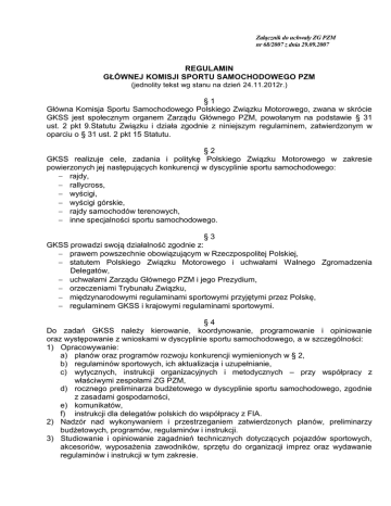 Załącznik do uchwały ZG PZM nr 68/2007 z dnia 29.09.2007 REGULAMIN GŁÓWNEJ KOMISJI SPORTU SAMOCHODOWEGO PZM (jednolity tekst wg stanu na dzień 24.11.2012r.) §1 Główna Komisja Sportu Samochodowego Polskiego Związku Motorowego, zwana w skrócie GKSS jest społecznym organem Zarządu Głównego PZM, powołanym na podstawie § 31 ust. 2 pkt 9.Statutu Związku i działa zgodnie z niniejszym regulaminem, zatwierdzonym w oparciu o § 31 ust. 2 pkt 15 Statutu. §2 GKSS realizuje cele, zadania i politykę Polskiego Związku Motorowego w zakresie powierzonych jej następujących konkurencji w dyscyplinie sportu samochodowego: rajdy, rallycross, wyścigi, wyścigi górskie, rajdy samochodów terenowych, inne specjalności sportu samochodowego. §3 GKSS prowadzi swoją działalność zgodnie z: prawem powszechnie obowiązującym w Rzeczpospolitej Polskiej, statutem Polskiego Związku Motorowego i uchwałami Walnego Zgromadzenia Delegatów, uchwałami Zarządu Głównego PZM i jego Prezydium, orzeczeniami Trybunału Związku, międzynarodowymi regulaminami sportowymi przyjętymi przez Polskę, regulaminem GKSS i krajowymi regulaminami sportowymi. §4 Do zadań GKSS należy kierowanie, koordynowanie, programowanie i opiniowanie oraz występowanie z wnioskami w dyscyplinie sportu samochodowego, a w szczególności: 1) Opracowywanie: a) planów oraz programów rozwoju konkurencji wymienionych w § 2, b) regulaminów sportowych, ich aktualizacja i uzupełnianie, c) wytycznych, instrukcji organizacyjnych i metodycznych – przy współpracy z właściwymi zespołami ZG PZM, d) rocznego preliminarza budżetowego w dyscyplinie sportu samochodowego, zgodnie z zasadami gospodarności, e) komunikatów, f) instrukcji dla delegatów polskich do współpracy z FIA. 2) Nadzór nad wykonywaniem i przestrzeganiem zatwierdzonych planów, preliminarzy budżetowych, programów, regulaminów i instrukcji. 3) Studiowanie i opiniowanie zagadnień technicznych dotyczących pojazdów sportowych, akcesoriów, wyposażenia zawodników, sprzętu do organizacji imprez oraz wydawanie regulaminów i instrukcji w tym zakresie. 2 4) Podejmowanie działań zapobiegających korupcji, rasizmowi i dopingowi w sporcie samochodowym. 5) Podejmowanie działań organizacyjnych i technicznych dla poprawy bezpieczeństwa zawodów sportowych ich uczestników i widzów, a także ochrony środowiska naturalnego. 6) Podejmowanie działań wynikających z umów i porozumień zawartych przez PZM z krajowymi i zagranicznymi spółkami prawa handlowego i innymi podmiotami gospodarczymi w zakresie sportu samochodowego. 7) Udzielanie pomocy organizacyjnej i metodycznej ZO PZM oraz członkom PZM. 8) Inspirowanie działalności oraz ocena pracy ZO PZM w zakresie konkurencji wymienionych w § 2. 9) Występowanie z wnioskami, do zatwierdzenia przez ZG PZM w sprawach: a) regulaminów świadczeń finansowych i materialnych dla zawodników, b) zawodów zgłaszanych do międzynarodowego kalendarza sportowego FIA, c) proponowania delegatów PZM zgłaszanych do FIA oraz na seminaria, konferencje i szkolenia zagraniczne oraz instrukcje dla tych delegatów, d) posiedzeń, konferencji, sympozjów i seminariów międzynarodowych organizowanych w kraju, e) propozycji nadawania odznaczeń państwowych, odznak resortowych, honorowych PZM, tytułów oraz nagród, f) rocznych kalendarzy Mistrzostw Polski i nagród PZM, g) powierzania organizacji zawodów kalendarza FIA, h) rocznego preliminarza budżetowego. 10) Organizowanie w miarę potrzeb konferencji, narad, seminariów, szkoleń i sympozjów. 11) Rozpatrywanie protestów, odwołań i sporów oraz wydawanie orzeczeń i decyzji w sprawach konkurencji wymienionych w § 2, zgodnie z obowiązującymi regulaminami oraz przepisami krajowymi i międzynarodowymi. 12) Podejmowanie działań wynikających z przynależności PZM do międzynarodowej federacji FIA. 13) Podejmowanie działań w celu pozyskiwania sponsorów oraz poszukiwania innych źródeł finansowania sportu samochodowego. 14) Analizowanie dochodów i wydatków w ramach rocznego preliminarza budżetowego GKSS oraz podejmowanie odpowiednich działań i decyzji dla racjonalizacji wydatków i maksymalizowania dochodów. 15) Składanie wniosków, propozycji i wystąpień z inicjatywy własnej lub na polecenie ZG PZM. 16) Składanie ZG PZM okresowych sprawozdań z działalności własnej i sportowej w zakresie prowadzonych konkurencji sportu samochodowego. 17) Zgłaszanie propozycji kandydatów do składu Zespołu Torów i Tras, Zespołu Medycznego oraz Zespołu Ochrony Środowiska. 18) Wykonywanie innych zadań i czynności zleconych przez ZG PZM. §5 Uprawnienia GKSS w zakresie sportu samochodowego przekazane jej przez ZG PZM i niepodlegające dalszemu substytuowaniu obejmują: 1) Ustalanie szczegółowych wymogów i kwalifikacji niezbędnych do uprawiania konkurencji wymienionych w § 2, sposobu ich uzyskiwania, wynikających z nich uprawnień, zasad nadawania, zawieszania i cofania tych uprawnień, wzoru dokumentu potwierdzającego te kwalifikacje oraz zasad bezpieczeństwa obowiązujących w tych konkurencjach. 2) Nadawanie, pozbawianie i zawieszanie trenerom, instruktorom, sędziom i zawodnikom odpowiednio certyfikatów, licencji oraz licencji sportowych krajowych i międzynarodowych. 2 3 3) Wyznaczanie osób urzędowych i funkcyjnych, analiza i ocena ich pracy, szkolenie oraz nadawanie dokumentów potwierdzających ich uprawnienia. 4) Ustalanie obsad sędziowskich, obserwatorów zawodów, analiza i ocena ich pracy, a także ich szkolenie oraz nadawanie im licencji. 5) Dokonywanie homologacji krajowej pojazdów i ich wyposażenia do celów sportowych oraz opiniowanie wniosków do federacji międzynarodowych o homologację pojazdów produkcji krajowej. 6) Interpretowanie krajowych regulaminów sportowych. 7) Zatwierdzanie regulaminów sportowych i technicznych Mistrzostw Polski i nagród PZM oraz przedstawianie do zatwierdzenia regulaminów zawodów mi