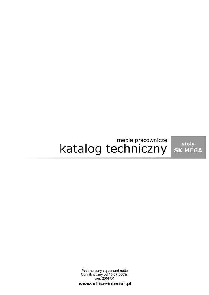 meble pracownicze katalog techniczny Podane ceny są cenami netto Cennik ważny od 15.07.2008r. wer. 2008/01 www.office-interior.pl stoły SK MEGA KATALOG TECHNICZNY system SK-MEGA - stół konferencyjny OPIS KONSTRUKCJI blat roboczy o grubości 25 lub 18mm, wykonany z płyty melaminowej wg. wzornika DF, krawędź blatu wykończona PCV 2mm, opcjonalnie wersja z wykończeniem okleiną naturalną lakierowaną wg. wzornika DF blat stołu wykonany z płyty melaminowanej o grubości 18 lub 25 mm, kolorystyka wg. wzornika DF oklejonej PCV 2 mm opcjonalnie wykończenie nogi polerowana stal nierdzewna, szkło grubości 8 mm mleczne, osadzone na uchwytach ze stali nierdzewnej, opcjonalnie istnieje możliwość wykonania logotypu firmy noga stołu wykonana ze stalowego profilu zamkniętego 100 x 100 x 2 lakierowana farbą proszkową na kolor alu RAL 9006, czarny RAL 9005 lub grafit RAL 7024 noga posiada możliwość poziomowania 2 KATALOG TECHNICZNY CENA NETTO PLN system SK-MEGA - stoły konferencyjne WYMIARY (cm) WIDOK I RZUT OBIEKTU Szer. A Gł. B Wys. NUMER KATALOGOWY 80 80 75 SK-MEGA 01 art.01 szkło 8 mm CENA NETTO PLN M(melamina) M(melamina) blat 18mm blat 25mm ONL (mat) blat 18mm 750 800 990 1600 1760 - 2000 2200 - 950 1050 1480 1300 1430 2090 1900 2050 2900 2800 3050 - 3100 3400 - 3500 3850 - stół 4 osobowy 160 160 75 SK-MEGA 01 art.02 stół 8 osobowy 220 220 75 SK-MEGA 01 art.03 stół 8 osobowy szkło 8 mm 160 90 75 SK-MEGA 02 art.01 stół 6 osobowy 220 110 75 SK-MEGA 02 art.02 stół 8 osobowy 250 110 75 SK-MEGA 02 art.03 stół 8 osobowy szkło 8 mm 320 160 75 SK-MEGA 03 art.01 stół 12 osobowy 430 160 75 SK-MEGA 03 art.02 stół 16 osobowy 500 180 75 SK-MEGA 03 art.03 stół 18 osobowy SK-MEGA 01 SK-MEGA 02 SK-MEGA 03 A B B B A A 570 570 570 wykończenie nogi - stal nierdzewna polerowana stopa MEGA 150/szt. 3 KATALOG TECHNICZNY port 1 port 2 port 3 port 4 (KTL 104/8) 3x220V 1xRJ45 1xRJ11 bez okablowania (83J035) (port srebrny) (port czarny) 2x220V 2xRJ45 z okablowaniem 3x220V 2xRJ45 kabel prądowy 3m 3x220V 2xRJ45 kabel prądowy 3m 450,00 zł netto 335,00 zł netto 610,00 zł netto 610,00 zł netto stoły konferencyjne SK-MEGA - porty elektryczne kieszeniowe port 5 port 6 port 7 (ZZ011584) (FLIP TOP) (ZZ011586) 2x220V 2xRJ45 z okablowaniem 3x220V 2xRJ45 kabel prądowy 3m 2x220V 2xRJ45 z okablowaniem 445,00 zł netto 650,00 zł netto 530,00 zł netto UWAGA: porty elektrychne podlegaja innemu rabatowaniu niż pozostałe oferty 4