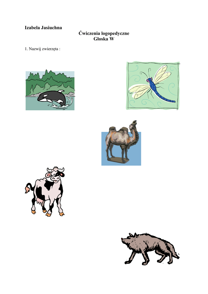 Izabela Jasiuchna Ćwiczenia logopedyczne Głoska W 1. Nazwij zwierzęta : 1. Połącz obrazki przedstawiające zwierzęta w pary, nazwij je. Powiedz jakie zwierzęta nie mają pary? 3. Powtórz wiersz „Worek niespodzianek.” W pewien wtorek przed wieczorem, Witek znalazł wielki worek. W worku wielkie niespodzianki: Wrotki, wąż i dwie skakanki, Klocki w wzorki kolorowePiękne, czerwono- brązowe. To przed Witkiem trudna sprawa. Oddać worek nie zabawa. Nie wie komu worek wręczyć, Wie, że warto się pomęczyć. To jest postawa wzorowa, Wielkie serce, mądra głowa. Bo kto czyjąś rzecz odnalazł. To powinien oddać zaraz. Autor I. Jasiuchna Spróbuj narysować drogę Witka w podczas poszukiwań właściciela worka