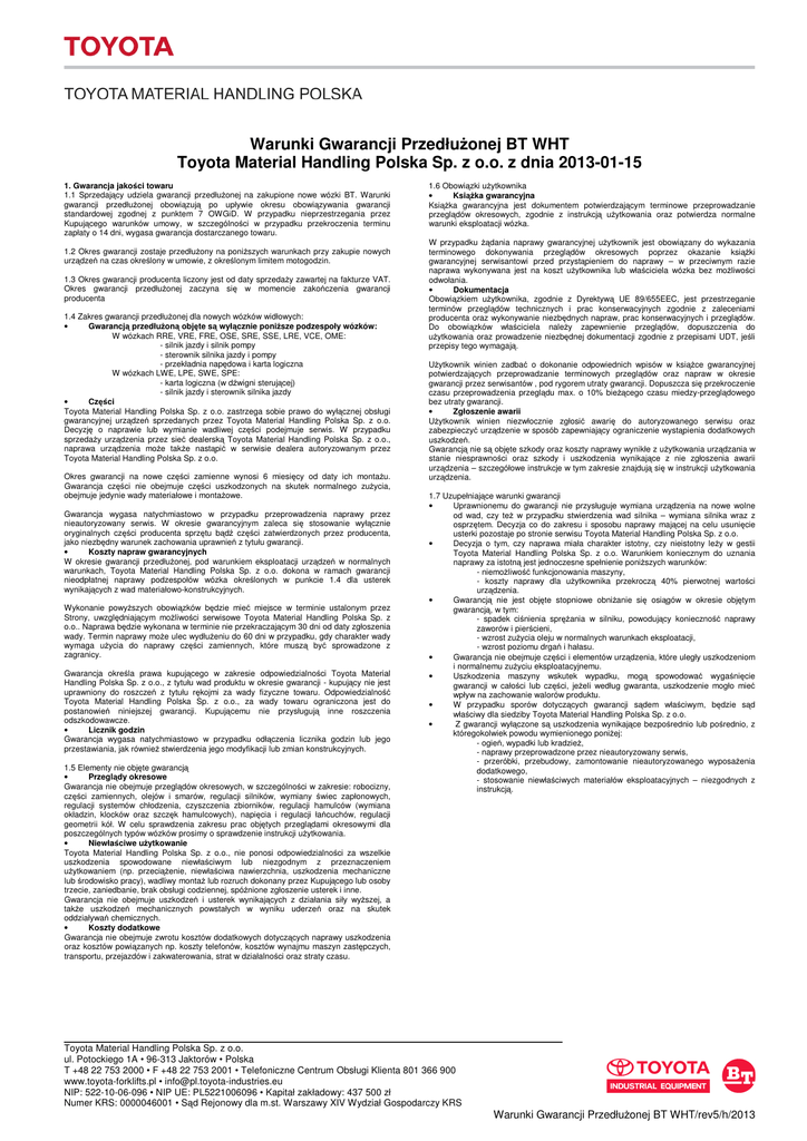 Warunki Gwarancji Przedłużonej BT WHT Toyota Material Handling Polska Sp. z o.o. z dnia 2013-01-15 1. Gwarancja jakości towaru 1.1 Sprzedający udziela gwarancji przedłużonej na zakupione nowe wózki BT. Warunki gwarancji przedłużonej obowiązują po upływie okresu obowiązywania gwarancji standardowej zgodnej z punktem 7 OWGiD. W przypadku nieprzestrzegania przez Kupującego warunków umowy, w szczególności w przypadku przekroczenia terminu zapłaty o 14 dni, wygasa gwarancja dostarczanego towaru. 1.2 Okres gwarancji zostaje przedłużony na poniższych warunkach przy zakupie nowych urządzeń na czas określony w umowie, z określonym limitem motogodzin. 1.3 Okres gwarancji producenta liczony jest od daty sprzedaży zawartej na fakturze VAT. Okres gwarancji przedłużonej zaczyna się w momencie zakończenia gwarancji producenta 1.4 Zakres gwarancji przedłużonej dla nowych wózków widłowych: • Gwarancją przedłużoną objęte są wyłącznie poniższe podzespoły wózków: W wózkach RRE, VRE, FRE, OSE, SRE, SSE, LRE, VCE, OME: - silnik jazdy i silnik pompy - sterownik silnika jazdy i pompy - przekładnia napędowa i karta logiczna W wózkach LWE, LPE, SWE, SPE: - karta logiczna (w dźwigni sterującej) - silnik jazdy i sterownik silnika jazdy • Części Toyota Material Handling Polska Sp. z o.o. zastrzega sobie prawo do wyłącznej obsługi gwarancyjnej urządzeń sprzedanych przez Toyota Material Handling Polska Sp. z o.o. Decyzję o naprawie lub wymianie wadliwej części podejmuje serwis. W przypadku sprzedaży urządzenia przez sieć dealerską Toyota Material Handling Polska Sp. z o.o., naprawa urządzenia może także nastąpić w serwisie dealera autoryzowanym przez Toyota Material Handling Polska Sp. z o.o. Okres gwarancji na nowe części zamienne wynosi 6 miesięcy od daty ich montażu. Gwarancja części nie obejmuje części uszkodzonych na skutek normalnego zużycia, obejmuje jedynie wady materiałowe i montażowe. Gwarancja wygasa natychmiastowo w przypadku przeprowadzenia naprawy przez nieautoryzowany serwis. W okresie gwarancyjnym zaleca się stosowanie wyłącznie oryginalnych części producenta sprzętu bądź części zatwierdzonych przez producenta, jako niezbędny warunek zachowania uprawnień z tytułu gwarancji. • Koszty napraw gwarancyjnych W okresie gwarancji przedłużonej, pod warunkiem eksploatacji urządzeń w normalnych warunkach, Toyota Material Handling Polska Sp. z o.o. dokona w ramach gwarancji nieodpłatnej naprawy podzespołów wózka określonych w punkcie 1.4 dla usterek wynikających z wad materiałowo-konstrukcyjnych. Wykonanie powyższych obowiązków będzie mieć miejsce w terminie ustalonym przez Strony, uwzględniającym możliwości serwisowe Toyota Material Handling Polska Sp. z o.o.. Naprawa będzie wykonana w terminie nie przekraczającym 30 dni od daty zgłoszenia wady. Termin naprawy może ulec wydłużeniu do 60 dni w przypadku, gdy charakter wady wymaga użycia do naprawy części zamiennych, które muszą być sprowadzone z zagranicy. Gwarancja określa prawa kupującego w zakresie odpowiedzialności Toyota Material Handling Polska Sp. z o.o., z tytułu wad produktu w okresie gwarancji - kupujący nie jest uprawniony do roszczeń z tytułu rękojmi za wady fizyczne towaru. Odpowiedzialność Toyota Material Handling Polska Sp. z o.o., za wady towaru ograniczona jest do postanowień niniejszej gwarancji. Kupującemu nie przysługują inne roszczenia odszkodowawcze. • Licznik godzin Gwarancja wygasa natychmiastowo w przypadku odłączenia licznika godzin lub jego przestawiania, jak również stwierdzenia jego modyfikacji lub zmian konstrukcyjnych. 1.5 Elementy nie objęte gwarancją • Przeglądy okresowe Gwarancja nie obejmuje przeglądów okresowych, w szczególności w zakresie: robocizny, części zamiennych, olejów i smarów, regulacji silników, wymiany świec zapłonowych, regulacji systemów chłodzenia, czyszczenia zbiorników, regulacji hamulców (wymiana okładzin, klocków oraz szczęk hamulcowych), napięcia i regulacji łańcuchów, regulacji geometrii kół. W celu sprawdzenia zakresu prac objętych przeglądami okresowymi dla poszczególnych typów wózków prosimy o sprawdzenie instrukcji użytkowania. • Niewłaściwe użytkowanie Toyota Material Handling Polska Sp. z o.o., nie ponosi odpowiedzialności za wszelkie uszkodzenia spowodowane niewłaściwym lub niezgodnym z przeznaczeniem użytkowaniem (np. przeciążenie, niewłaściwa nawierzchnia, uszkodzenia mechaniczne lub środowisko pracy), wadliwy montaż lub rozruch dokonany przez Kupującego lub osoby trzecie, zaniedbanie, brak obsługi codziennej, spóźnione zgłoszenie usterek i inne. Gwarancja nie obejmuje uszkodzeń i usterek wynikających z działania siły wyższej, a także uszkodzeń mechanicznych powstałych w wyniku uderzeń oraz na skutek oddziaływań chemicznych. • Koszty dodatkowe Gwarancja nie obejmuje zwrotu kosztów dodatkowych dotyczących naprawy uszkodzenia oraz kosztów powiązanych np. koszty telefonów, kosztów wynajmu maszyn zastępczych, transportu, przejazdów i zakwaterowania, strat w działalności oraz straty czasu. 1.6 Obowiązki użytkownika • Książka gwarancyjna Książka gwarancyjna jest dokumentem potwierdzającym terminowe przeprowadzanie przeglądów okresowych, zgodnie z instrukcją użytkowania oraz potwierdza normalne warunki eksploatacji wózka. W przypadku żądania naprawy gwarancyjnej użytkownik jest obowiązany do wykazania terminowego dokonywania przeglądów okresowych poprzez okazanie książki gwarancyjnej serwisantowi przed przystąpieniem do naprawy – w przeciwnym razie naprawa wykonywana jest na koszt użytkownika lub właściciela wózka bez możliwości odwołania. • Dokumentacja Obowiązkiem użytkownika, zgodnie z Dyrektywą UE 89/655EEC, jest przestrzeganie terminów przeglądów technicznych i prac konserwacyjnych zgodnie z zaleceniami producenta oraz wykonywanie n