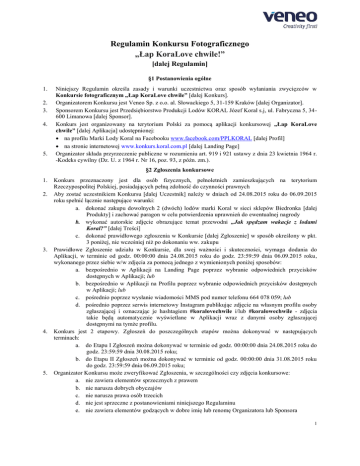 Regulamin Konkursu Fotograficznego „Łap KoraLove chwile!” [dalej Regulamin] §1 Postanowienia ogólne 1. 2. 3. 4. 5. Niniejszy Regulamin określa zasady i warunki uczestnictwa oraz sposób wyłaniania zwycięzców w Konkursie fotograficznym „Łap KoraLove chwile” [dalej Konkurs]. Organizatorem Konkursu jest Veneo Sp. z o.o. al. Słowackiego 5, 31-159 Kraków [dalej Organizator]. Sponsorem Konkursu jest Przedsiębiorstwo Produkcji Lodów KORAL Józef Koral s.j, ul. Fabryczna 5, 34600 Limanowa [dalej Sponsor]. Konkurs jest organizowany na terytorium Polski za pomocą aplikacji konkursowej „Łap KoraLove chwile” [dalej Aplikacja] udostępnionej: na profilu Marki Lody Koral na Facebooku www.facebook.com/PPLKORAL [dalej Profil] na stronie internetowej www.konkurs.koral.com.pl [dalej Landing Page] Organizator składa przyrzeczenie publiczne w rozumieniu art. 919 i 921 ustawy z dnia 23 kwietnia 1964 r. -Kodeks cywilny (Dz. U. z 1964 r. Nr 16, poz. 93, z późn. zm.). §2 Zgłoszenia konkursowe 1. 2. 3. 4. 5. Konkurs przeznaczony jest dla osób fizycznych, pełnoletnich zamieszkujących na terytorium Rzeczypospolitej Polskiej, posiadających pełną zdolność do czynności prawnych Aby zostać uczestnikiem Konkursu [dalej Uczestnik] należy w dniach od 24.08.2015 roku do 06.09.2015 roku spełnić łącznie następujące warunki: a. dokonać zakupu dowolnych 2 (dwóch) lodów marki Koral w sieci sklepów Biedronka [dalej Produkty] i zachować paragon w celu potwierdzenia uprawnień do ewentualnej nagrody b. wykonać autorskie zdjęcie obrazujące temat przewodni „Jak spędzam wakacje z lodami Koral?” [dalej Treści] c. dokonać prawidłowego zgłoszenia w Konkursie [dalej Zgłoszenie] w sposób określony w pkt. 3 poniżej, nie wcześniej niż po dokonaniu ww. zakupu Prawidłowe Zgłoszenie udziału w Konkursie, dla swej ważności i skuteczności, wymaga dodania do Aplikacji, w terminie od godz. 00:00:00 dnia 24.08.2015 roku do godz. 23:59:59 dnia 06.09.2015 roku, wykonanego przez siebie w/w zdjęcia za pomocą jednego z wymienionych poniżej sposobów: a. bezpośrednio w Aplikacji na Landing Page poprzez wybranie odpowiednich przycisków dostępnych w Aplikacji; lub b. bezpośrednio w Aplikacji na Profilu poprzez wybranie odpowiednich przycisków dostępnych w Aplikacji; lub c. pośrednio poprzez wysłanie wiadomości MMS pod numer telefonu 664 078 059; lub d. pośrednio poprzez serwis internetowy Instagram publikując zdjęcie na własnym profilu osoby zgłaszającej i oznaczając je hashtagiem #koralovechwile i/lub #koralowechwile - zdjęcia takie będą automatycznie wyświetlane w Aplikacji wraz z danymi osoby zgłaszającej dostępnymi na tymże profilu. Konkurs jest 2 etapowy. Zgłoszeń do poszczególnych etapów można dokonywać w następujących terminach: a. do Etapu I Zgłoszeń można dokonywać w terminie od godz. 00:00:00 dnia 24.08.2015 roku do godz. 23:59:59 dnia 30.08.2015 roku; b. do Etapu II Zgłoszeń można dokonywać w terminie od godz. 00:00:00 dnia 31.08.2015 roku do godz. 23:59:59 dnia 06.09.2015 roku; Organizator Konkursu może zweryfikować Zgłoszenia, w szczególności czy zdjęcia konkursowe: a. nie zawiera elementów sprzecznych z prawem b. nie narusza dobrych obyczajów c. nie narusza prawa osób trzecich d. nie jest sprzeczne z postanowieniami niniejszego Regulaminu e. nie zawiera elementów godzących w dobre imię lub renomę Organizatora lub Sponsora 1 nie zawiera wulgaryzmów lub jakichkolwiek treści nieprzeznaczonych lub szkodliwych dla osób niepełnoletnich. Organizator zastrzega sobie prawo do usunięcia Zgłoszenia, które nie spełnia wymagań określonych w Regulaminie lub które uzyskało negatywną opinię w wyniku weryfikacji, o jakiej mowa w ust 4. Powyżej. Każdy Uczestnik może dodać dowolną ilość Zgłoszeń. Uczestnik biorąc udział w Konkursie oświadcza, że jest autorem zdjęcia zgłaszanego przez siebie do Konkursu. W Konkursie nie mogą brać udziału pracownicy Organizatora, Sponsora oraz osoby współpracujące z tymi podmiotami w sposób stały w formie stosunku pracy lub na podstawie jakiejkolwiek innej umowy cywilnoprawnej [Pracownicy]. Niniejsze ograniczenie nie dotyczy pracowników Jeronimo Martins Polska S.A. oraz rodzin tych pracowników, z wyłączeniem pracowników Działu Marketingu Jeronimo Martins Polska S.A. oraz ich rodzin, którzy nie mogą brać udziału w Konkursie. f. 6. 7. 8. 9. §3 Nagrody 1. 2. 3. 4. 5. 6. W Konkursie przewidziano 23 następujące nagrody rzeczowe: 2 nagrody I stopnia w postaci urządzenia Sony PlayStation 4 1TB, każda o wartości 1.665,00 zł 7 nagród II stopnia w postaci urządzenia Tablet Toshiba AT7-C8 8GB, każda o wartości 269,00 zł 14 nagród III stopnia w postaci głośników bezprzewodowych Philips BT50B, każda o wartości 87,00 zł Nagrody w Konkursie zapewnia i funduje Organizator. Do wartości nagród I stopnia zostanie dodana dodatkowa nagroda pieniężna w kwocie stanowiącej 11,11% wartości danej nagrody. Zgodnie z ustawą o podatku dochodowym od osób fizycznych laureat Konkursu obciążony zostanie podatkiem dochodowym z tytułu wygranej w wysokości 10% wartości nagrody i zgadza się na potrącenie stosownej zaliczki na podatek z tego tytułu przez Organizatora. Organizator, jako płatnik zryczałtowanego podatku dochodowego od osób fizycznych, przed wydaniem laureatowi nagrody obliczy, pobierze i odprowadzi do właściwego Urzędu Skarbowego zryczałtowany podatek dochodowy należny z tytułu wygranej. Zwycięzca jest zobowiązany przekazać Organizatorowi wszelkie dane, niezbędne do wypełnienia obowiązków płatnika w terminie do 5 dni roboczych licząc od daty opublikowania zwycięskich Zgłoszeń, pod rygorem samodzielnego opłacenia podatku od nagrody. Laureatom Konkursu nie przysługuje prawo do zastrzeżenia wyboru szczególnych właściwości nagrody ani do otrzymania jej ekwiwalentu. Prawo do nagrody nie może być przeniesione na rzecz 