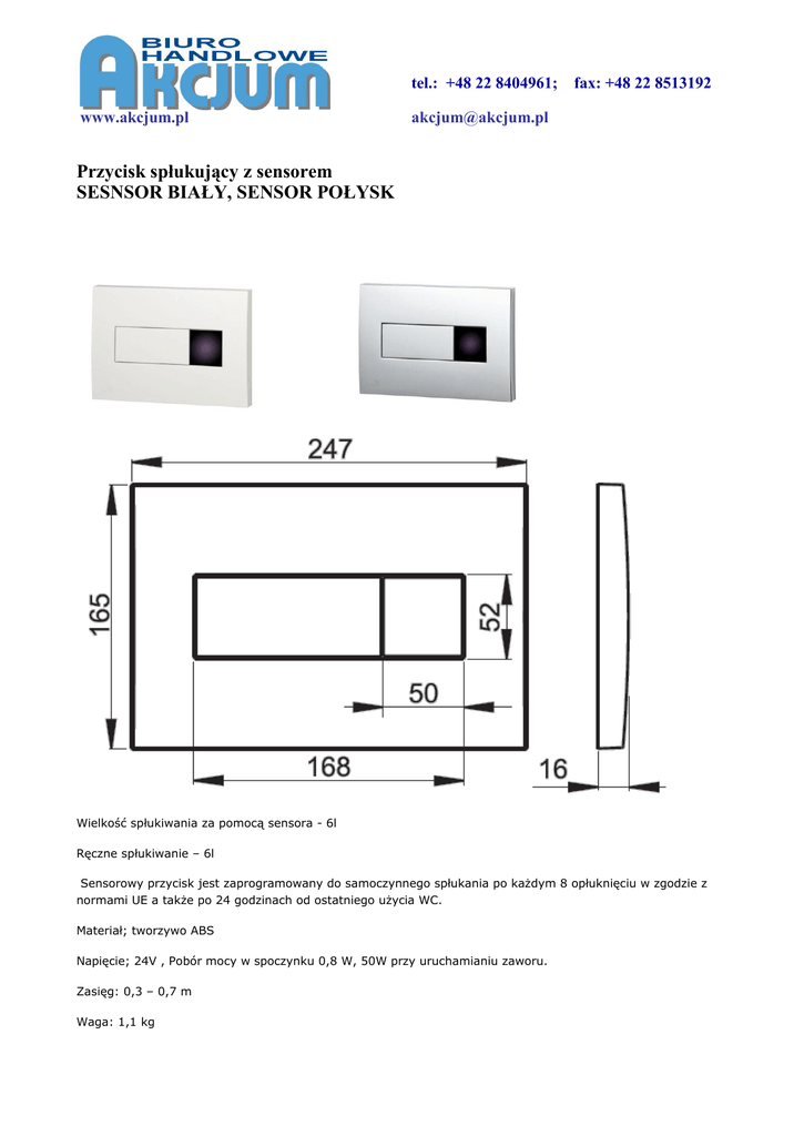 tel.: +48 22 8404961; www.akcjum.pl fax: +48 22 8513192 [email protected] Przycisk spłukujący z sensorem SESNSOR BIAŁY, SENSOR POŁYSK Wielkość spłukiwania za pomocą sensora - 6l Ręczne spłukiwanie – 6l Sensorowy przycisk jest zaprogramowany do samoczynnego spłukania po każdym 8 opłuknięciu w zgodzie z normami UE a także po 24 godzinach od ostatniego użycia WC. Materiał; tworzywo ABS Napięcie; 24V , Pobór mocy w spoczynku 0,8 W, 50W przy uruchamianiu zaworu. Zasięg: 0,3 – 0,7 m Waga: 1,1 kg