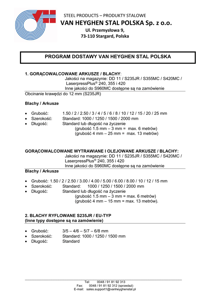 STEEL PRODUCTS – PRODUKTY STALOWE VAN HEYGHEN STAL POLSKA Sp. z o.o. Ul. Przemysłowa 9, 73-110 Stargard, Polska PROGRAM DOSTAWY VAN HEYGHEN STAL POLSKA 1. GORĄCOWALCOWANE ARKUSZE / BLACHY: Jakości na magazynie: DD 11 / S235JR / S355MC / S420MC / LaserpressPlus® 240, 355 i 420 Inne jakości do S960MC dostępne są na zamówienie Obcinanie krawędzi do 12 mm (S235JR) Blachy / Arkusze Grubość: Szerokość: Długość: 1.50 / 2 / 2.50 / 3 / 4 / 5 / 6 / 8 / 10 / 12 / 15 / 20 / 25 mm Standard: 1000 / 1250 / 1500 / 2000 mm Standard lub długość na życzenie (grubość 1.5 mm – 3 mm = max. 6 metrów) (grubość 4 mm – 25 mm = max. 13 metrów) GORĄCOWALCOWANE WYTRAWIANE I OLEJOWANE ARKUSZE / BLACHY: Jakości na magazynie: DD 11 / S235JR / S355MC / S420MC / LaserpressPlus® 240, 355 i 420 Inne jakości do S960MC dostępne są na zamówienie Blachy / Arkusze Grubość: 1.50 / 2 / 2.50 / 3.00 / 4.00 / 5.00 / 6.00 / 8.00 / 10 / 12 / 15 mm Szerokość: Standard: 1000 / 1250 / 1500 / 2000 mm Długość: Standard lub długość na życzenie (grubość 1.5 mm – 3 mm = max. 6 metrów) (grubość 4 mm – 15 mm = max. 13 metrów). 2. BLACHY RYFLOWANE S235JR / EU-TYP (Inne typy dostępne są na zamówienie) Grubość: Szerokość: Długość: 3/5 – 4/6 – 5/7 – 6/8 mm Standard: 1000 / 1250 / 1500 mm Standard _________________________________________________________________________________________ Tel: 0048 / 91 81 92 313 Fax: 0048 / 91 81 92 312 (sprzedaż) E-mail: [email protected] STEEL PRODUCTS – PRODUKTY STALOWE VAN HEYGHEN STAL POLSKA Sp. z o.o. Ul. Przemysłowa 9, 73-110 Stargard, Polska 3. ZIMNOWALCOWANE: DC01 OCYNKOWANE OGNIOWO: DX51D+Z275 Arkusze Grubość: Szerokość: Długość: 0.80 / 1.00 / 1.25 / 1.50 / 2.00 / 2.50 / 2.99 mm Standard: 1000 / 1250 / 1500 mm Standard lub długość na życzenie (max. 6 metrów) INNE JAKOŚCI NA ZAMÓWIENIE, CZAS REALIZACJI USTALANY INDYWIDUALNIE Prosimy o kontakt w razie jakichkolwiek wątpliwości: Tel. asystentka sprzedaży Fax asystentka sprzedaży E-mail asystentka sprzedaży Nasze strony: 0048 / 91 81 92 313 0048 / 91 81 92 312 [email protected] www.vanheyghenstal.pl www.europickling.com Z poważaniem, Dział Sprzedaży Van Heyghen Stal Polska Sp. z o.o. _________________________________________________________________________________________ Tel: 0048 / 91 81 92 313 Fax: 0048 / 91 81 92 312 (sprzedaż) E-mail: [email protected]