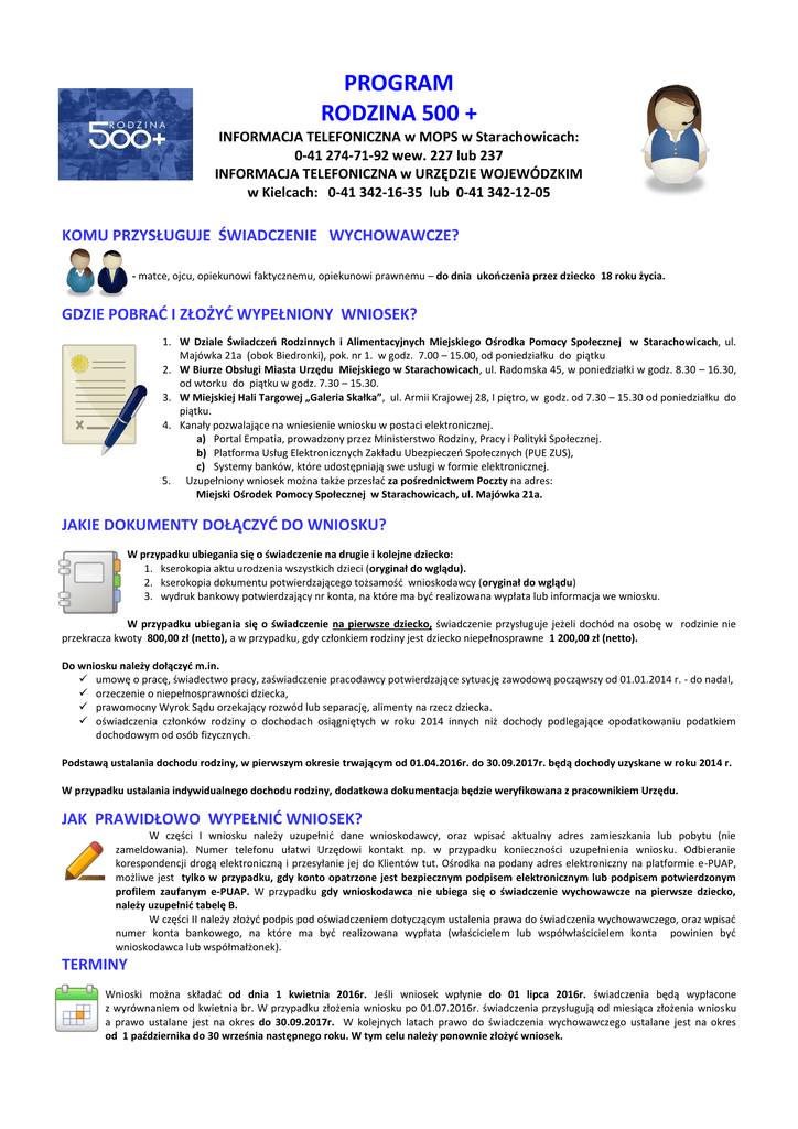 PROGRAM RODZINA 500 + INFORMACJA TELEFONICZNA w MOPS w Starachowicach: 0-41 274-71-92 wew. 227 lub 237 INFORMACJA TELEFONICZNA w URZĘDZIE WOJEWÓDZKIM w Kielcach: 0-41 342-16-35 lub 0-41 342-12-05 KOMU PRZYSŁUGUJE ŚWIADCZENIE WYCHOWAWCZE? - matce, ojcu, opiekunowi faktycznemu, opiekunowi prawnemu – do dnia ukończenia przez dziecko 18 roku życia. GDZIE POBRAĆ I ZŁOŻYĆ WYPEŁNIONY WNIOSEK? 1. W Dziale Świadczeń Rodzinnych i Alimentacyjnych Miejskiego Ośrodka Pomocy Społecznej w Starachowicach, ul. Majówka 21a (obok Biedronki), pok. nr 1. w godz. 7.00 – 15.00, od poniedziałku do piątku 2. W Biurze Obsługi Miasta Urzędu Miejskiego w Starachowicach, ul. Radomska 45, w poniedziałki w godz. 8.30 – 16.30, od wtorku do piątku w godz. 7.30 – 15.30. 3. W Miejskiej Hali Targowej „Galeria Skałka”, ul. Armii Krajowej 28, I piętro, w godz. od 7.30 – 15.30 od poniedziałku do piątku. 4. Kanały pozwalające na wniesienie wniosku w postaci elektronicznej. a) Portal Empatia, prowadzony przez Ministerstwo Rodziny, Pracy i Polityki Społecznej. b) Platforma Usług Elektronicznych Zakładu Ubezpieczeń Społecznych (PUE ZUS), c) Systemy banków, które udostępniają swe usługi w formie elektronicznej. 5. Uzupełniony wniosek można także przesłać za pośrednictwem Poczty na adres: Miejski Ośrodek Pomocy Społecznej w Starachowicach, ul. Majówka 21a. JAKIE DOKUMENTY DOŁĄCZYĆ DO WNIOSKU? W przypadku ubiegania się o świadczenie na drugie i kolejne dziecko: 1. kserokopia aktu urodzenia wszystkich dzieci (oryginał do wglądu). 2. kserokopia dokumentu potwierdzającego tożsamość wnioskodawcy (oryginał do wglądu) 3. wydruk bankowy potwierdzający nr konta, na które ma być realizowana wypłata lub informacja we wniosku. W przypadku ubiegania się o świadczenie na pierwsze dziecko, świadczenie przysługuje jeżeli dochód na osobę w rodzinie nie przekracza kwoty 800,00 zł (netto), a w przypadku, gdy członkiem rodziny jest dziecko niepełnosprawne 1 200,00 zł (netto). Do wniosku należy dołączyć m.in. umowę o pracę, świadectwo pracy, zaświadczenie pracodawcy potwierdzające sytuację zawodową począwszy od 01.01.2014 r. - do nadal, orzeczenie o niepełnosprawności dziecka, prawomocny Wyrok Sądu orzekający rozwód lub separację, alimenty na rzecz dziecka. oświadczenia członków rodziny o dochodach osiągniętych w roku 2014 innych niż dochody podlegające opodatkowaniu podatkiem dochodowym od osób fizycznych. Podstawą ustalania dochodu rodziny, w pierwszym okresie trwającym od 01.04.2016r. do 30.09.2017r. będą dochody uzyskane w roku 2014 r. W przypadku ustalania indywidualnego dochodu rodziny, dodatkowa dokumentacja będzie weryfikowana z pracownikiem Urzędu. JAK PRAWIDŁOWO WYPEŁNIĆ WNIOSEK? W części I wniosku należy uzupełnić dane wnioskodawcy, oraz wpisać aktualny adres zamieszkania lub pobytu (nie zameldowania). Numer telefonu ułatwi Urzędowi kontakt np. w przypadku konieczności uzupełnienia wniosku. Odbieranie korespondencji drogą elektroniczną i przesyłanie jej do Klientów tut. Ośrodka na podany adres elektroniczny na platformie e-PUAP, możliwe jest tylko w przypadku, gdy konto opatrzone jest bezpiecznym podpisem elektronicznym lub podpisem potwierdzonym profilem zaufanym e-PUAP. W przypadku gdy wnioskodawca nie ubiega się o świadczenie wychowawcze na pierwsze dziecko, należy uzupełnić tabelę B. W części II należy złożyć podpis pod oświadczeniem dotyczącym ustalenia prawa do świadczenia wychowawczego, oraz wpisać numer konta bankowego, na które ma być realizowana wypłata (właścicielem lub współwłaścicielem konta powinien być wnioskodawca lub współmałżonek). TERMINY Wnioski można składać od dnia 1 kwietnia 2016r. Jeśli wniosek wpłynie do 01 lipca 2016r. świadczenia będą wypłacone z wyrównaniem od kwietnia br. W przypadku złożenia wniosku po 01.07.2016r. świadczenia przysługują od miesiąca złożenia wniosku a prawo ustalane jest na okres do 30.09.2017r. W kolejnych latach prawo do świadczenia wychowawczego ustalane jest na okres od 1 października do 30 września następnego roku. W tym celu należy ponownie złożyć wniosek.