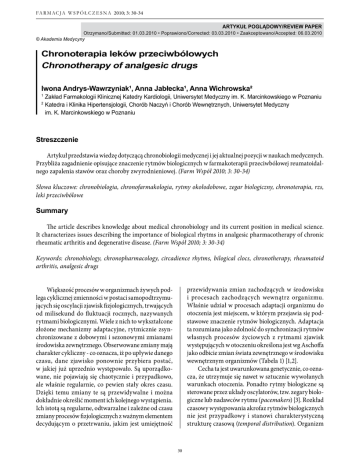 FA R M A C J A W S P Ó Ł C Z E S N A 2010; 3: 30-34 ARTYKUŁ POGLĄDOWY/REVIEW PAPER Otrzymano/Submitted: 01.03.2010 • Poprawiono/Corrected: 03.03.2010 • Zaakceptowano/Accepted: 06.03.2010 © Akademia Medycyny Chronoterapia leków przeciwbólowych Chronotherapy of analgesic drugs Iwona Andrys-Wawrzyniak¹, Anna Jabłecka¹, Anna Wichrowska² Zakład Farmakologii Klinicznej Katedry Kardiologii, Uniwersytet Medyczny im. K. Marcinkowskiego w Poznaniu Katedra i Klinika Hipertensjologii, Chorób Naczyń i Chorób Wewnętrznych, Uniwersytet Medyczny im. K. Marcinkowskiego w Poznaniu 1 2 Streszczenie Artykuł przedstawia wiedzę dotyczącą chronobiologii medycznej i jej aktualnej pozycji w naukach medycznych. Przybliża zagadnienie opisujące znaczenie rytmów biologicznych w farmakoterapii przeciwbólowej reumatoidalnego zapalenia stawów oraz choroby zwyrodnieniowej. (Farm Współ 2010; 3: 30-34) Słowa kluczowe: chronobiologia, chronofarmakologia, rytmy okołodobowe, zegar biologiczny, chronoterapia, rzs, leki przeciwbólowe Summary The article describes knowledge about medical chronobiology and its current position in medical science. It characterizes issues describing the importance of biological rhytms in analgesic pharmacotherapy of chronic rheumatic arthritis and degenerative disease. (Farm Współ 2010; 3: 30-34) Keywords: chronobiology, chronopharmacology, circadience rhytms, bilogical clocs, chronotherapy, rheumatoid arthritis, analgesic drugs przewidywania zmian zachodzących w środowisku i procesach zachodzących wewnątrz organizmu. Właśnie udział w procesach adaptacji organizmu do otoczenia jest miejscem, w którym przejawia się podstawowe znaczenie rytmów biologicznych. Adaptacja ta rozumiana jako zdolność do synchronizacji rytmów własnych procesów życiowych z rytmami zjawisk występujących w otoczeniu określona jest wg Aschoffa jako odbicie zmian świata zewnętrznego w środowisku wewnętrznym organizmów (Tabela 1) [1,2]. Cecha ta jest uwarunkowana genetycznie, co oznacza, że utrzymuje się nawet w sztucznie wywołanych warunkach otoczenia. Ponadto rytmy biologiczne są sterowane przez układy oscylatorów, tzw. zegary biologiczne lub nadawców rytmu (pacemakers) [3]. Rozkład czasowy występowania akrofaz rytmów biologicznych nie jest przypadkowy i stanowi charakterystyczną strukturę czasową (temporal distribution). Organizm Większość procesów w organizmach żywych podlega cyklicznej zmienności w postaci samopodtrzymujących się oscylacji zjawisk fizjologicznych, trwających od milisekund do fluktuacji rocznych, nazywanych rytmami biologicznymi. Wiele z nich to wykształcone złożone mechanizmy adaptacyjne, rytmicznie zsynchronizowane z dobowymi i sezonowymi zmianami środowiska zewnętrznego. Obserwowane zmiany mają charakter cykliczny - co oznacza, iż po upływie danego czasu, dane zjawisko ponownie przybiera postać, w jakiej już uprzednio występowało. Są uporządkowane, nie pojawiają się chaotycznie i przypadkowo, ale właśnie regularnie, co pewien stały okres czasu. Dzięki temu zmiany te są przewidywalne i można dokładnie określić moment ich kolejnego wystąpienia. Ich istotą są regularne, odtwarzalne i zależne od czasu zmiany procesów fizjologicznych z ważnym elementem decydującym o przetrwaniu, jakim jest umiejętność 30 FA R M A C J A W S P Ó Ł C Z E S N A 2010; 3: 30-34 Tabela 1. Przegląd rytmów biologicznych Rodzaj rytmu krótkookresowe średniookresowe długookresowe Okres rytmu Nazwa rytmu Przykład sekundy oscylacje o wysokiej częstotliwości 30 min-h ultradialne 20-28 h 28- 7 dni tydzień miesiąc circadialne infradialne okołotygodniowe okołomiesięczne rok okołoroczne elektrokardiogram elektroencefalogram fazy snu pulsacyjne wydzielanie hormonów większość funkcji biologicznej mało badań schemat pracy cykl menstruacyjny liczne wskaźniki biochemiczne, hormonalne, fizjologiczne Podwaliny tej dziedzinie dał Franz Halberg, wieloletni przewodniczący Międzynarodowego Towarzystwa Chronobiologii. Halberg już w latach osiemdziesiątych ubiegłego wieku postulował konieczność przewartościowania wiedzy o efektach działania leków z uwzględnieniem biorytmów. Na przykład sporo badań farmakologicznych wykonuje się na gryzoniach, które mają prawie wszystkie rytmy w zupełnej odwrotności do ludzi (są m.in. aktywne w nocy). Badania przeprowadzone z uwzględnieniem rytmiki aktywności dziennej wykazały istotne różnice [6]. Najba rd ziej z auwa ż a l ne, a jed nocz e śn ie najistotniejsze z punktu widzenia większości terapii, są rytmy okołodobowe. Chronofarmakolodzy podkreślają, iż dzięki wykorzystaniu zdobyczy nauki, której się poświęcają możliwe jest nie tylko zmniejszenie lub zwiększenie siły działania leków, ale także obniżenie toksyczności i stopnia nasilenia działań niepożądanych. Ma to niezwykle istotne znaczenie w przypadku leków o małym wskaźniku terapeutycznym, w przypadku których dawka lecznicza i toksyczna różnią się od siebie nieznacznie. Klasycznym już przykładem zmniejszenia działań niepożądanych jest zsynchronizowanie podawania leków sterydowych z ich naturalnym wyrzutem z gruczołów. Ponieważ stężenie naturalnych steroidów wzrasta rano, podanie ich w tym samym czasie w postaci leku nie zakłóca naturalnego rytmu wydzielania wewnętrznego [3,6]. Ważną gałęzią chronofarmakologiii jest chronopatologia. Pozwala ona na zrozumienie różnic w natężeniu objawów chorobowych w zależności od czasu. Jest to dziedzina niezwykle pożyteczna nie tylko ze względu na walor medyczny. Pozwala ona na nawiązanie lepszego kontaktu z chorym – poprzez zrozumienie jego objawów, a także umiejętność ich ludzki otrzymuje ze środowiska zewnętrznego okresowe sygnały informacyjne, nazywane dawcami czasu, pełniące rolę synchronizatorów rytmu, co oznacza, iż same nie tworzą rytmu, ale regulują jego przebieg poprzez wpływ na d