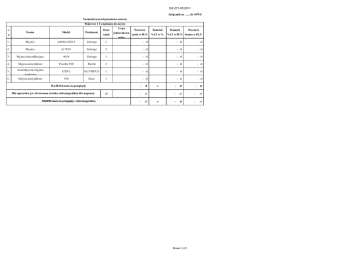 DZ-271-07/2011 Załącznik nr …... do SIWZ Formularz asortymentowo-cenowy Pakiet nr 1 Urządzenia do mycia L Ilość Cena Wartość Podatek netto w PLN VAT w % Podatek Wartość Nazwa Model Producent 1. Myjnia A8666 G3D-T Getinge 1 - zł - zł - zł 2. Myjnia G 7824 Getinge 2 - zł - zł - zł 3. Myjnia dezynfekująca 4656 Getinge 1 - zł - zł - zł 4. Myjnia dezynfektor P icollo 500 Mielle 2 - zł - zł - zł 5. Automatyczna myjnia ETD-2 OLYMP US 1 - zł - zł - zł 6. termiczna Myjnja dezynfektor 190 Deco 1 - zł - zł - zł p sztuk RAZEM kwota za przeglądy Dla aparatów j.w. of erowana stawka roboczogodziny dla naprawy RAZEM kwota za przeglądy i roboczogodziny 20 jednostkowa netto - zł - zł - zł x x VAT w PLN brutto w PLN - zł - zł - zł - zł - zł - zł Strona 1 z 21 DZ-271-07/2011 Pakiet nr 2 B ronchof iberoskopy,B ronchoskopy L Ilość Cena Wartość Podatek netto w PLN VAT w % Podatek Wartość Nazwa Typ Producent 1. Bronchofiberoskop BF-3C20 OLYMPUS 3 - zł - zł - zł 2. Bronchofiberoskop BF-TE2 OLYMPUS 1 - zł - zł - zł 3. Bronchofiberoskop dziecięcy BE 20 OLYMPUS 1 - zł - zł - zł P. sztuk RAZEM kwota za przeglądy Dla aparatów j.w. of erowana stawka roboczogodziny dla naprawy RAZEM kwota za przeglądy i roboczogodziny 20 jednostkowa netto - zł - zł - zł x x VAT w PLN brutto w PLN - zł - zł - zł - zł - zł - zł Strona 2 z 21 DZ-271-07/2011 Pakiet nr 3 Sterylizator L P. 1. Cena Wartość Podatek netto w PLN VAT w % Podatek Wartość Typ Producent Sterylizator parowy HS 6617AR2 Getinge 2 - zł - zł - zł HS 6617AR3 Getinge 2 - zł - zł - zł ASV SMS 2 - zł - zł - zł ASV SMS 2 2. Sterylizator przegląd dla UDT 3. Ilość Nazwa Sterylizator parowy 4. Sterylizator przegląd dla UDT sztuk RAZEM kwota za przeglądy Dla aparatów j.w. of erowana stawka roboczogodziny dla naprawy RAZEM kwota za przeglądy i roboczogodziny 20 jednostkowa netto VAT w PLN brutto w PLN - zł - zł - zł - zł - zł x x - zł - zł - zł - zł - zł - zł - zł Strona 3 z 21 DZ-271-07/2011 Pakiet nr 4 Aparaty EKG i EEG L Ilość Cena Wartość Podatek netto w PLN VAT w % Podatek Wartość Nazwa Typ Producent 1. Aparat EEG Astek ASP EL S.A. 1 - zł - zł - zł 2. Aparat EEG moduł Video ASP EL S.A. 1 - zł - zł - zł 3. Aparat EKG Ascard 2 ASP EL S.A. 7 - zł - zł - zł P. sztuk jednostkowa netto VAT w PLN brutto w PLN 4. Aparat EKG Ascard 3 ASP EL 1 - zł - zł - zł 5. Aparat EKG Ascard 4 S.A. ASP EL 2 - zł - zł - zł Ascard B-5 S.A. ASP EL 3 - zł - zł - zł 3 - zł - zł - zł 6. Aparat EKG 7. Aparat EKG BTL-08MT S.A. BTL 8. Aparat EKG BTL-08MT P LUS BTL 2 - zł - zł - zł 9. Aparat EKG BTL-08SD3 BTL 1 - zł - zł - zł 10 Aparat EKG Mr Grey ASP EL S.A. 1 - zł - zł - zł . 11 Aparat EKG M-TRACE M4 Medical 1 - zł - zł - zł . RAZEM kwota za przeglądy Dla aparatów j.w. of erowana stawka roboczogodziny dla naprawy 20 RAZEM kwota za przeglądy i roboczogodziny - zł - zł - zł x x - zł - zł - zł - zł - zł - zł Pakiet nr 5 Respiratory L Ilość Cena Wartość Podatek VAT w % Podatek Wartość Typ Producent 1. Respirator BENNETT 840 BENNETT 11 - zł - zł - zł 2. Respirator BENNETT 740 BENNETT 2 - zł - zł - zł P. sztuk jednostkowa netto w PLN Nazwa netto RAZEM kwota za przeglądy Dla aparatów j.w. of erowana stawka roboczogodziny dla naprawy 20 RAZEM kwota za przeglądy i roboczogodziny - zł - zł - zł x x VAT w PLN brutto w PLN - zł - zł - zł - zł - zł - zł Pakiet nr 6 Respiratory inne L P. 1. Nazwa Typ Respirator Micro Vent Producent Nellcor 1 Cena Wartość jednostkowa netto w PLN netto - zł 2 Ilość sztuk Podatek VAT w % Podatek Wartość VAT w PLN brutto w PLN - zł - zł - zł - zł - zł 2. Respirator NPB 840 3. Respirator PARAPAC 200D P NEUP AC 6 - zł - zł - zł 4. Respirator SERVO VENTILATOR 300 Siemens 2 - zł - zł - zł P uritan Strona 4 z 21 DZ-271-07/2011 5. Respirator SERVO VENTILATOR 900C Siemens 4 - zł - zł - zł 6. Respirator SERVO VENTILATOR 900E Siemens 8 - zł - zł - zł 7. Respirator 2 - zł - zł - zł 8. Respirator 1 - zł - zł - zł 9. Respirator Av ian Bird 18 - zł - zł - zł Respirator BEAR 750 P SV 1 - zł - zł - zł Respirator ACHIEVA 1 - zł - zł - zł 10 . 11 . TRANS.NEWPACK P NEUP AC NCPAPINFANT FLOW ADVANCE VIASYS Tyco Healthcare RAZEM kwota za przeglądy Dla aparatów j.w. of erowana stawka roboczogodziny dla naprawy RAZEM kwota za przeglądy i roboczogodziny 20 - zł - zł - zł x x - zł - zł - zł - zł - zł - zł Strona 5 z 21 DZ-271-07/2011 Pakiet nr 7 Pompa inf uzyjna 1. Pompa inf uzy jna AP-14 ASCOR 21 Cena Wartość jednostkowa netto w PLN netto - zł 2. 3. Pompa inf uzy jna Pompa inf uzy jna Injectomat Agilia PERFUSOR SPACE Fresenius Aesculap 18 20 - zł - zł L p Nazwa Typ Producent Ilość sztuk RAZEM kwota za przeglądy Dla aparatów j.w. of erowana stawka roboczogodziny dla naprawy RAZEM kwota za przeglądy i roboczogodziny 20 - zł - zł - zł Podatek VAT w % x x Podatek Wartość VAT w PLN brutto w PLN - zł - zł - zł - zł - zł - zł - zł - zł - zł - zł - zł - zł Strona 6 z 21 DZ-271-07/2011 Pakiet nr 8 Pompa inf uzyjna L Nazwa Typ 1. P ulsoksymetr 8500A 2. P ulsoksymetr MICRO 2 3. P ulsoksymetr N600X 4. P ulsoksymetr N65 p Producent Ilość sztuk Cena jednostkowa netto Wartość Podatek netto w PLN VAT w % Podatek Wartość VAT w PLN brutto w PLN 1 - zł - zł - zł Siemens 1 - zł - zł - zł Nellcor 2 - zł - zł - zł Nellcor 4 - zł - zł Nonin RAZEM kwota za przeglądy Dla aparatów j.w. of erowana stawka roboczogodziny dla naprawy RAZEM kwota za przeglądy i roboczogodziny 20 - zł - zł - zł x x - zł - zł - zł - zł - zł - zł - zł Strona 7 z 21 DZ-271-07/2011 Pakiet nr 9 Stanowiska do resuscytacji noworodka L p Nazwa Typ Producent Ilość sztuk Zakład 1. Stanowisko do resuscytacji noworodka SRN-10 Urządzen Medycznych Cena Wartość jednostkowa netto w PLN netto 3 Podatek VAT w % Podatek Wartość VAT w PLN brutto w PLN - zł - zł - zł Unimed RAZEM kwota za pr