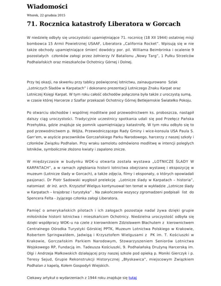 Wiadomości Wtorek, 22 grudnia 2015 71. Rocznica katastrofy Liberatora w Gorcach W niedzielę odbyły się uroczystości upamiętniające 71. rocznicę (18 XII 1944) ostatniej misji bombowca 15 Armii Powietrznej USAAF, Liberatora „California Rocket”. Wpisują się w nie także obchody upamiętniające śmierć dowódcy por. pil. Williama Beimbrinka i ocalenie 9 pozostałych członków załogi przez żołnierzy IV Batalionu „Nowy Targ”, 1 Pułku Strzelców Podhalańskich oraz mieszkańców Ochotnicy Górnej i Dolnej. Przy tej okazji, na skwerku przy tablicy poświęconej lotnictwu, zainaugurowano Szlak „Lotniczych Śladów w Karpatach” i dokonano prezentacji Lotniczego Znaku Karpat oraz Lotniczej Księgi Karpat. W tym roku całość obchodów połączona była także z uroczystą sumą, w czasie której Harcerze z Szaflar przekazali Ochotnicy Górnej Betlejemskie Światełko Pokoju. Po otwarciu obchodów i wspólnej modlitwie pod przewodnictwem ks. proboszcza, nastąpił dalszy ciąg uroczystości. Tradycyjnie uczestnicy spotkania udali się pod Przełęcz Pańska Przehybka, gdzie znajduje się pomnik upamiętniający katastrofę. W tym roku odbyło się to pod przewodnictwem p. Wójta, Przewodniczącego Rady Gminy i wice-konsula USA Paula S. Garr’em, w asyście pracowników Gorczańskiego Parku Narodowego, harcerzy z naszej szkoły i członków Związku Podhalan. Przy wraku samolotu odmówiono modlitwę w intencji poległych lotników, symbolicznie złożono kwiaty i zapalono znicze. W międzyczasie w budynku WOK-u otwarta została wystawa „LOTNICZE ŚLADY W KARPATACH”, a w ramach zgłębiania historii lotnictwa obejrzano wystawę i ekspozycję w muzeum (Lotnicze ślady w Gorcach), a także zdjęcia, filmy i eksponaty, o których opowiadali pasjonaci. Dr Piotr Sadowski wygłosił prelekcję „Lotnicze ślady w Karpatach – historia”, natomiast dr inż. arch. Krzysztof Wielgus kontynuował ten temat w wykładzie „Lotnicze ślady w Karpatach – krajobraz i turystyka” . Na zakończenie wszyscy zgromadzeni podpisali list do Spencera Felta - żyjącego członka załogi Liberatora. Pamięć o amerykańskich pilotach i ich załogach pozostaje nadal żywa dzięki grupie miłośników historii lotnictwa i mieszkańcom Ochotnicy. Niedzielna uroczystość odbyła się dzięki współpracy WOK–u na czele z kierownikiem Zdzisławem Błachutem z kierownictwem Centralnego Ośrodka Turystyki Górskiej PPTK, Muzeum Lotnictwa Polskiego w Krakowie, Robertem Springwaldem, Jadwigą i Krzysztofem Wielgusami z PK im. T. Kościuszki w Krakowie, Gorczańskim Parkiem Narodowym, Stowarzyszeniem Seniorów Lotnictwa Wojskowego RP, Fundacją im. Tadeusza Kościuszki, 9. Podhalańską Drużyną Harcerską im. Olgi i Andrzeja Małkowskich działającej przy naszej szkole pod opieką p. Moniki Gierczyk i p. Teresy Sejud, Grupie Rekonstrukcji Historycznej „Błyskawica”, miejscowym Związkiem Podhalan z kapelą, Kołem Gospodyń Wiejskich. Ciekawy artykuł o wydarzeniach z 1944 roku znajduje się tutaj Fot. R. Springwald, J. K. Wielgusowie T.Plata